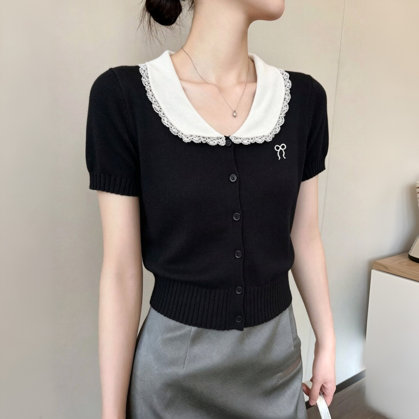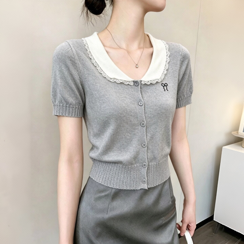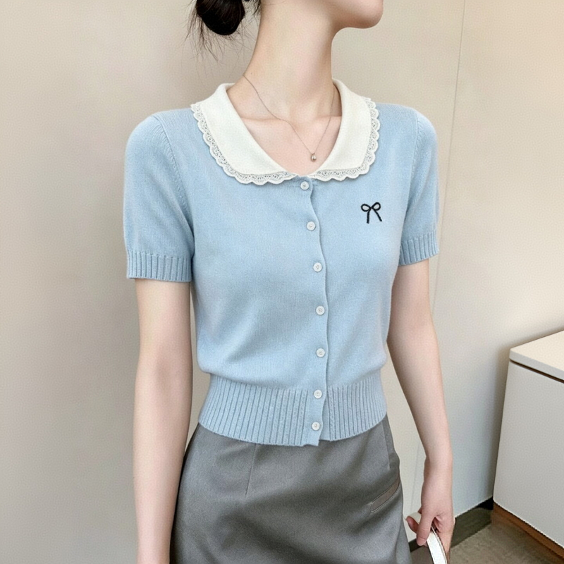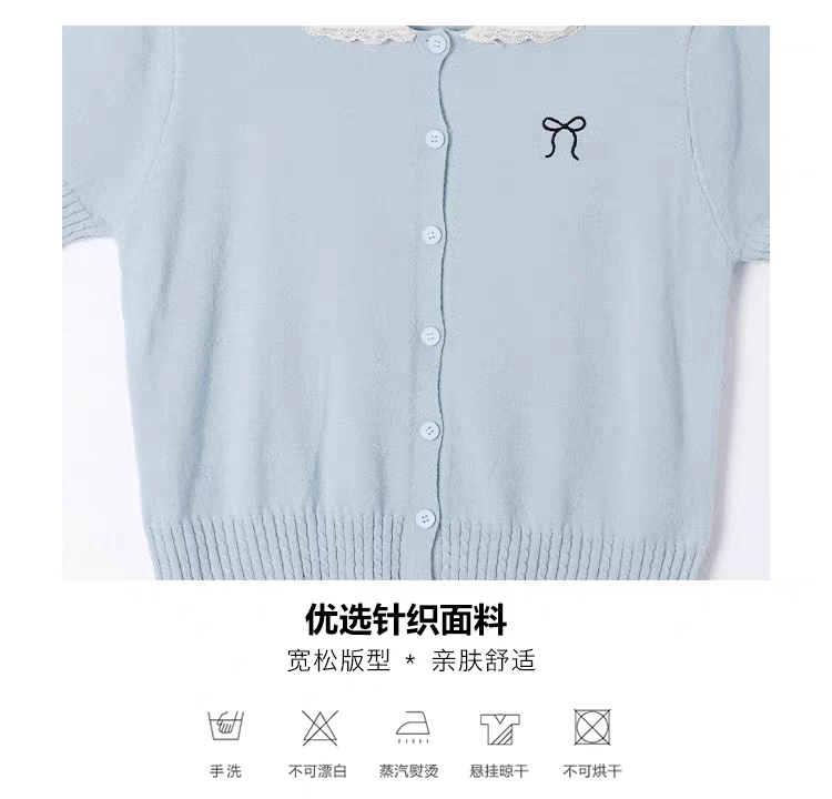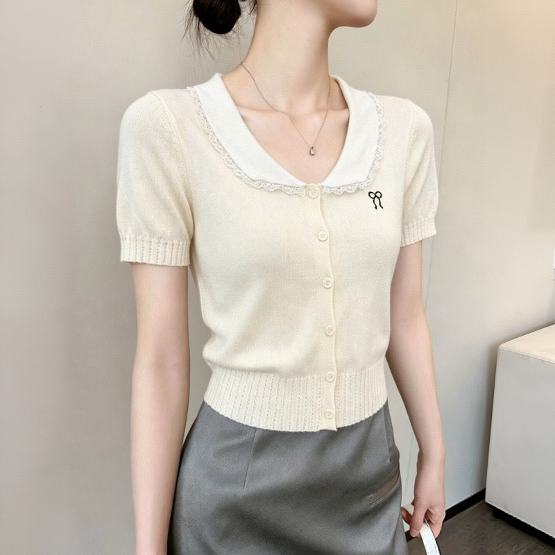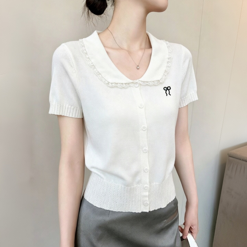 달콤함 베이비 칼라 반팔 얼음 실크 니트 스웨터 여성 2026 여름 새로운 Chic 아름다운 나비 매듭 자수 맨위