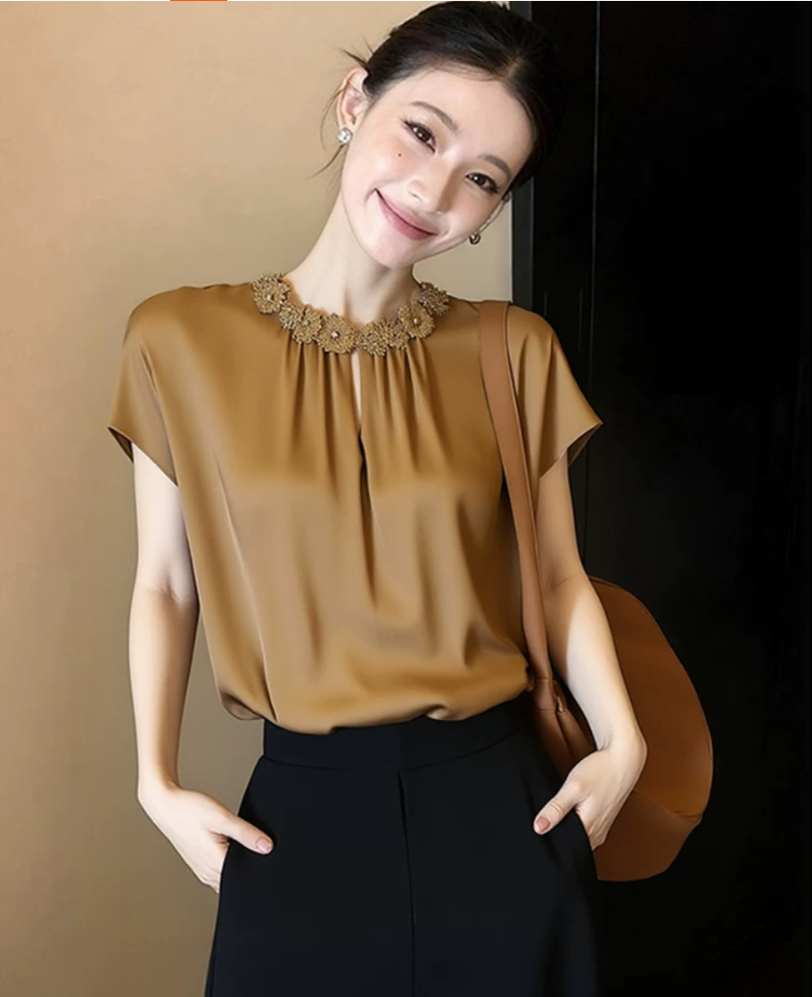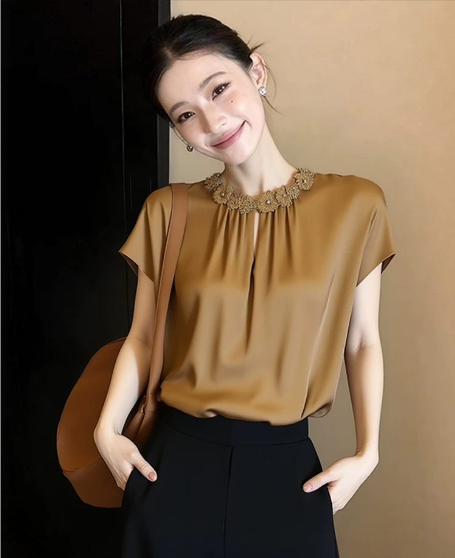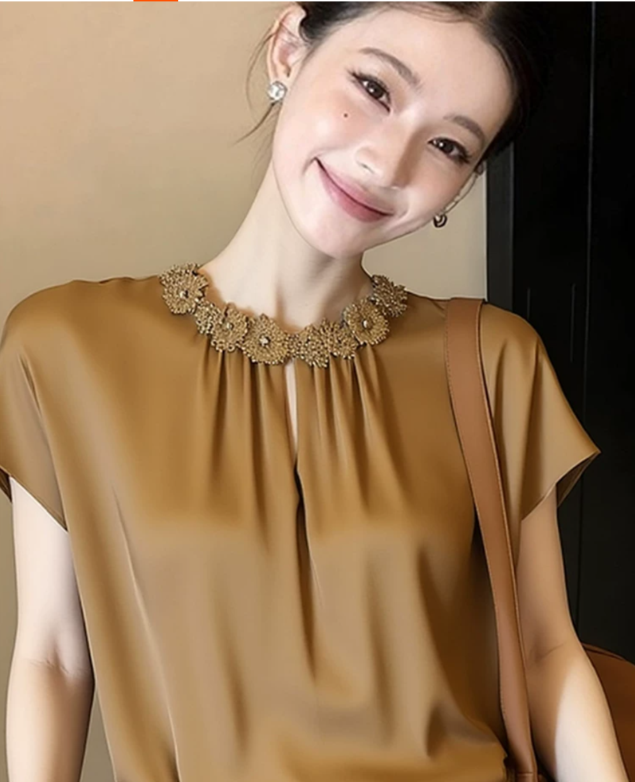 고유 한 아름다운 다용도 새틴 안감 시더 여성 여름 2026 년 새로운 고급 절묘한 셔츠 외국 가스 연령 감소 반팔