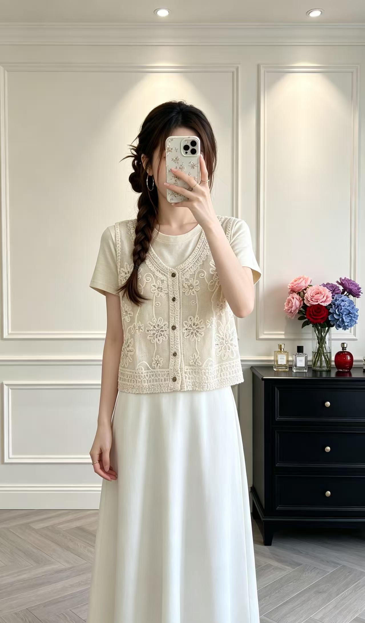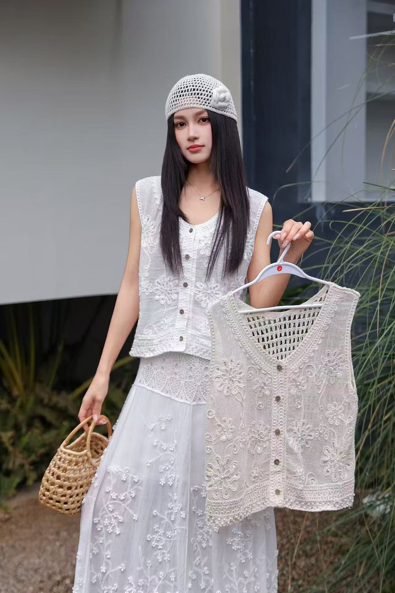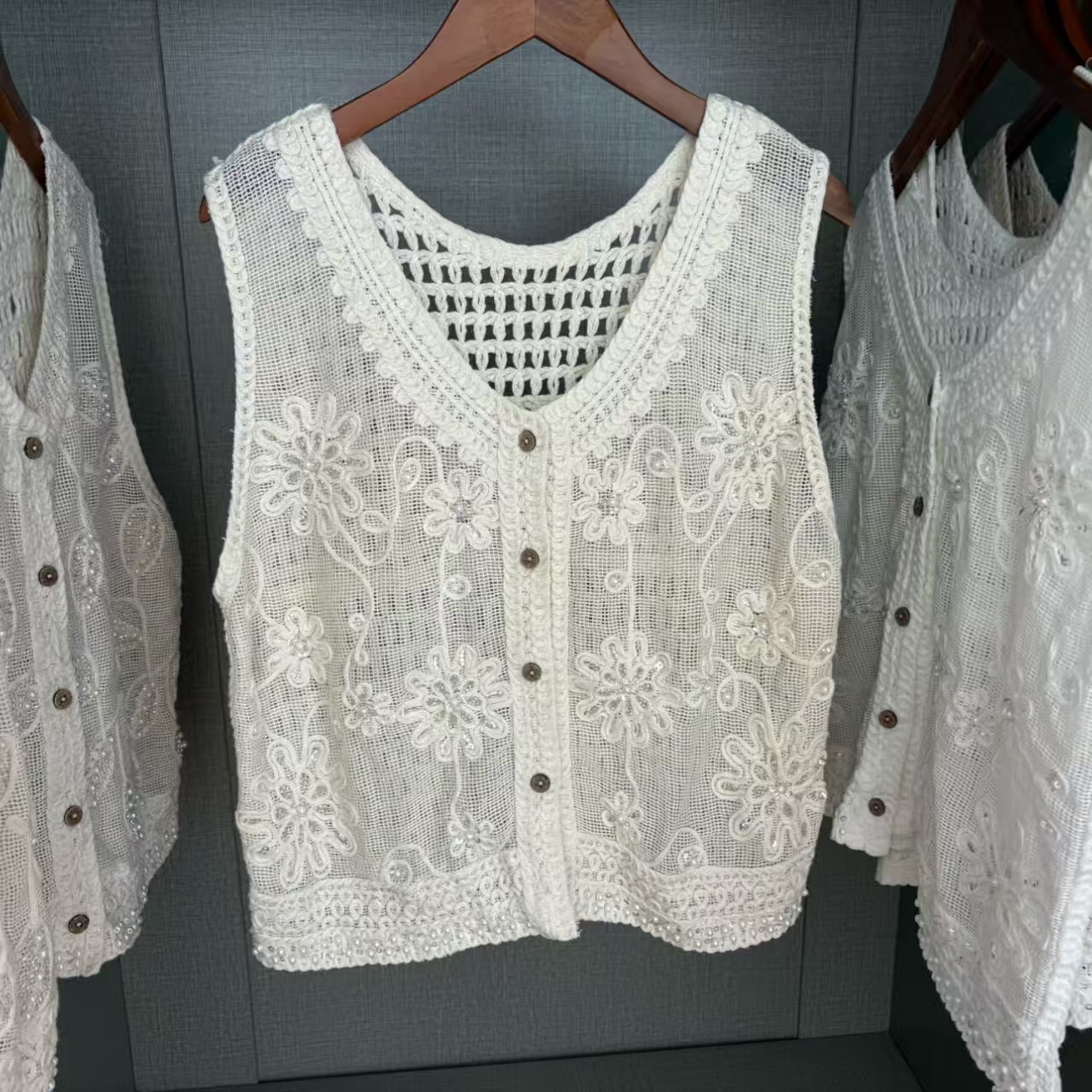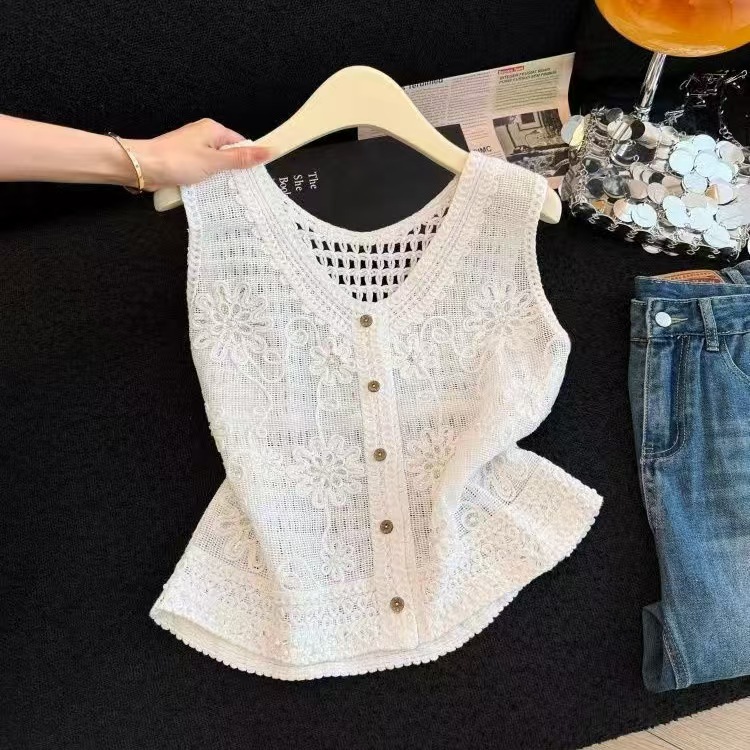 2026 봄 여름 새로운 레트로 품격 고급 센스 홀로우 아웃 자수 쇼트 스타일 민소매 니트 여성 캐미솔