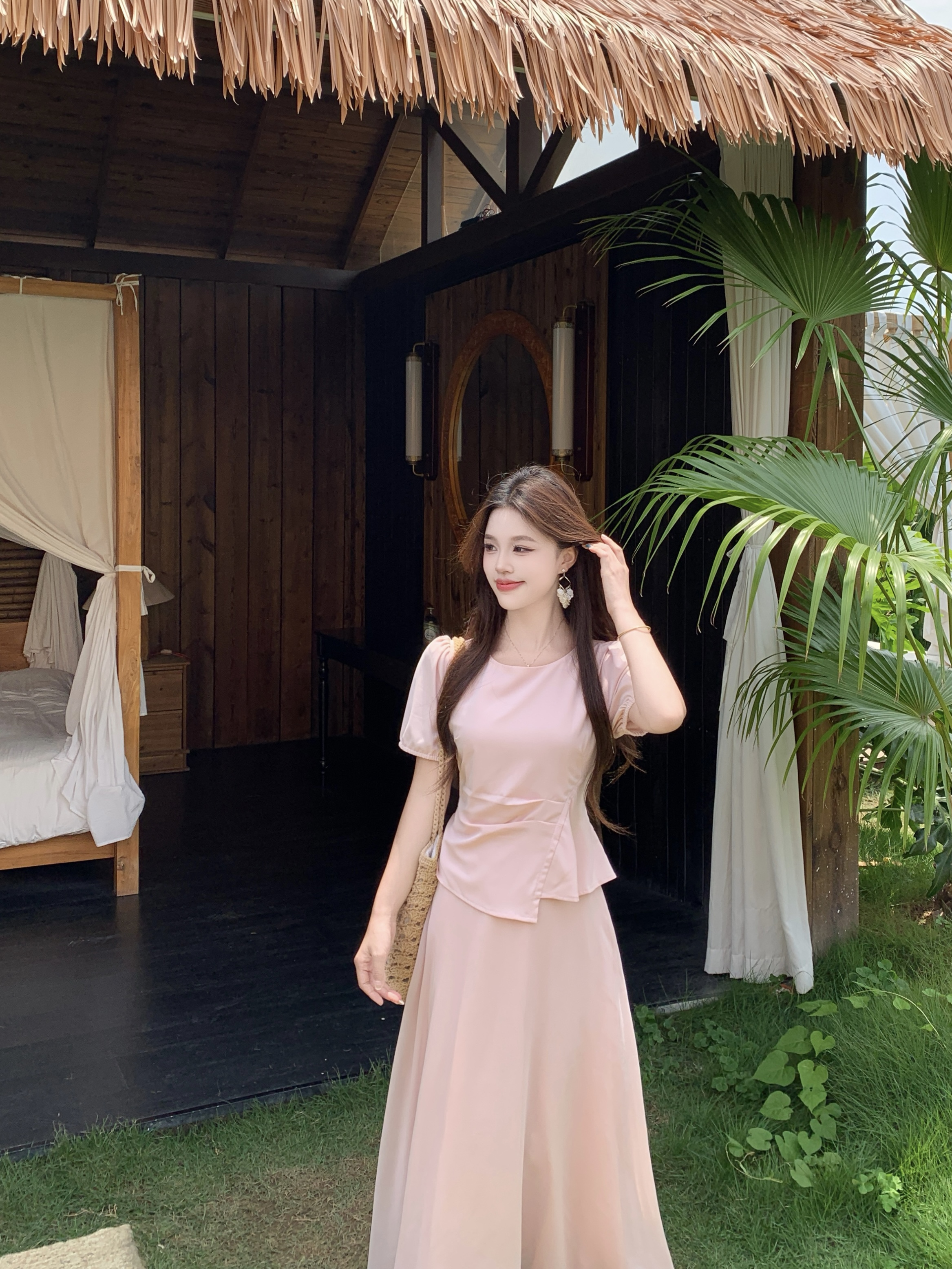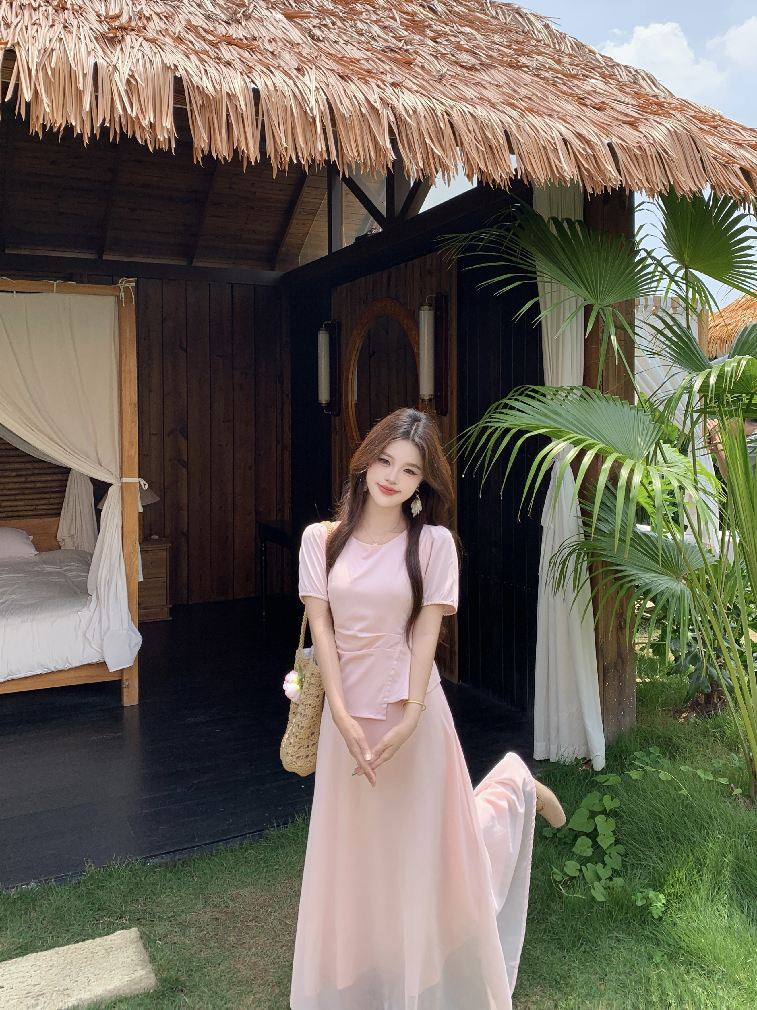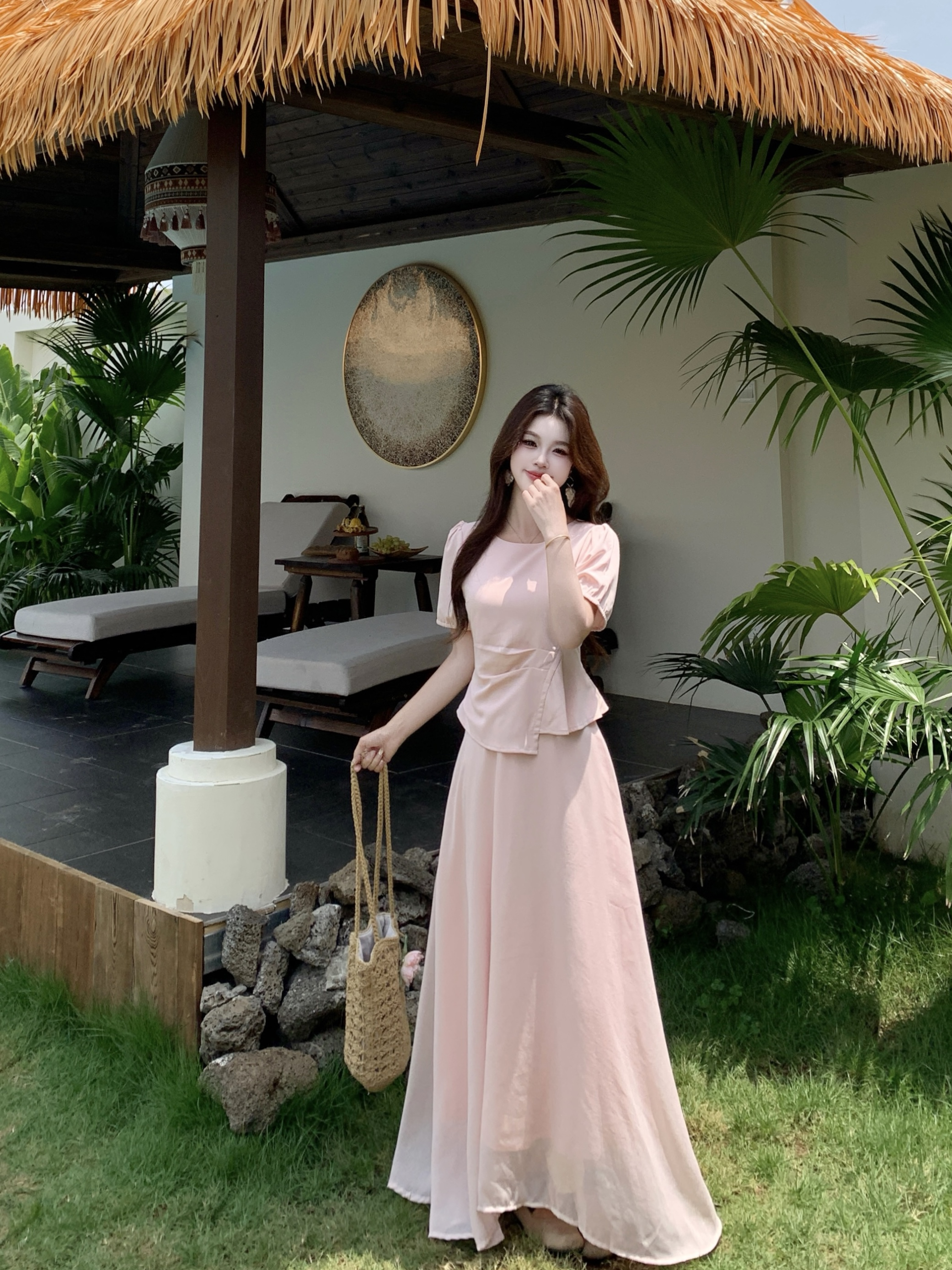 임산부 여름 외출용 얇은 스타일 캐주얼 루즈핏 반팔 맨위 여름 드레스 투피스 세트