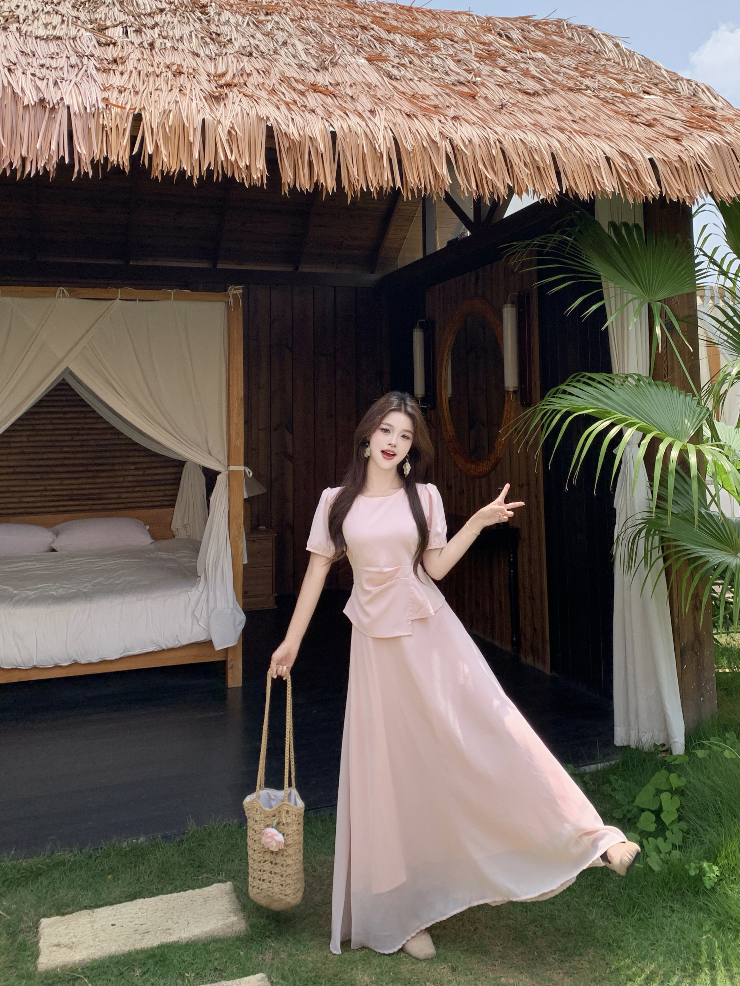 빅 사이즈 26 V넥 허리 수축 슬림해 보이는 살구 안개 치즈 슬립 반팔 드레스 아름다운 꼬집기 허리 외국 가스 빛 럭셔리 치마