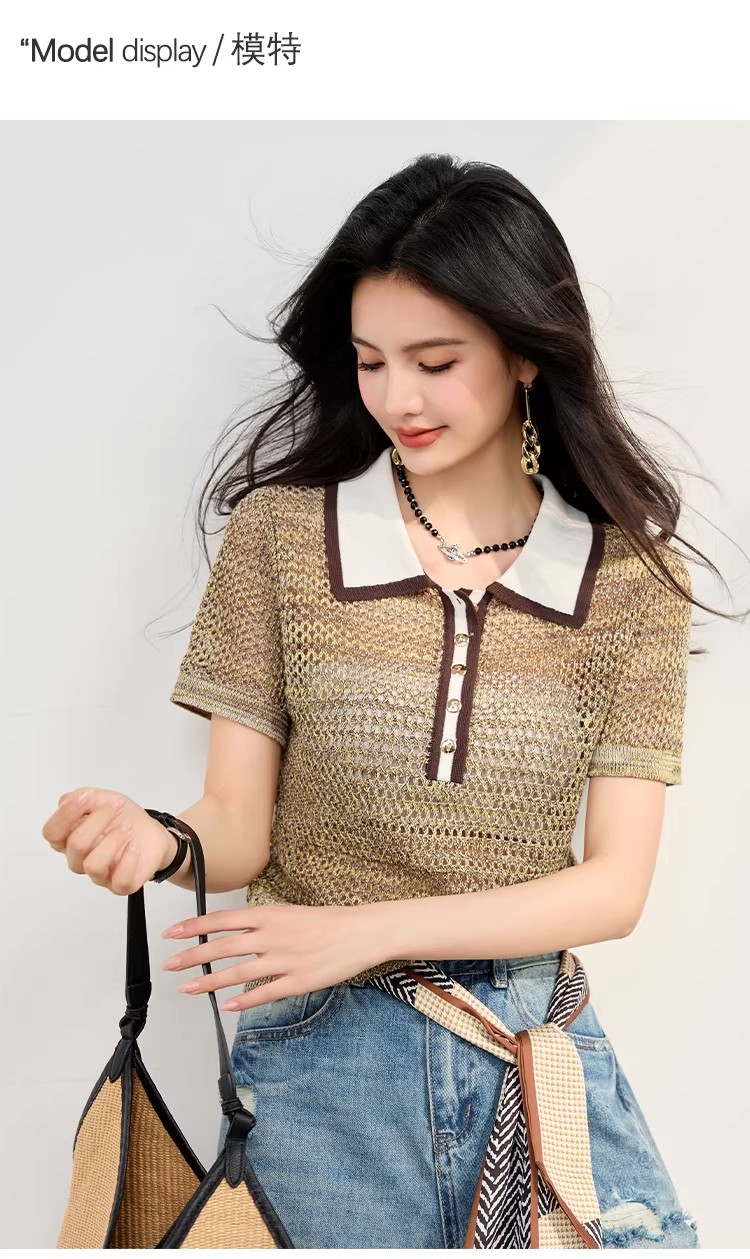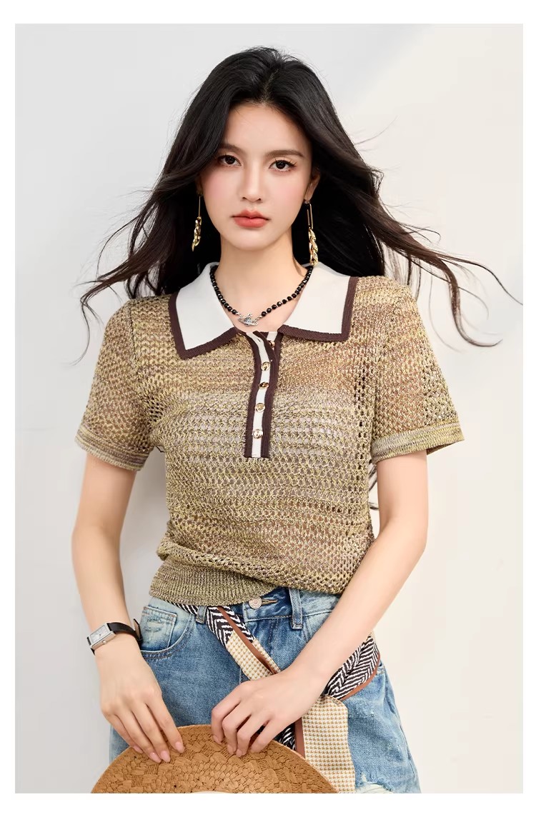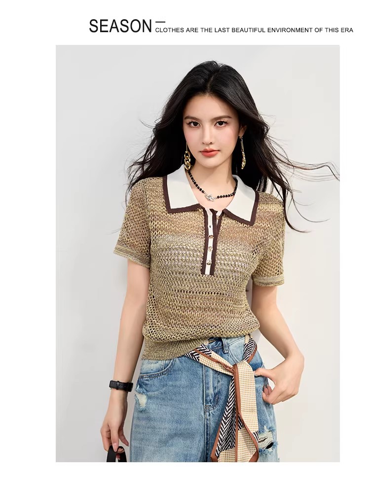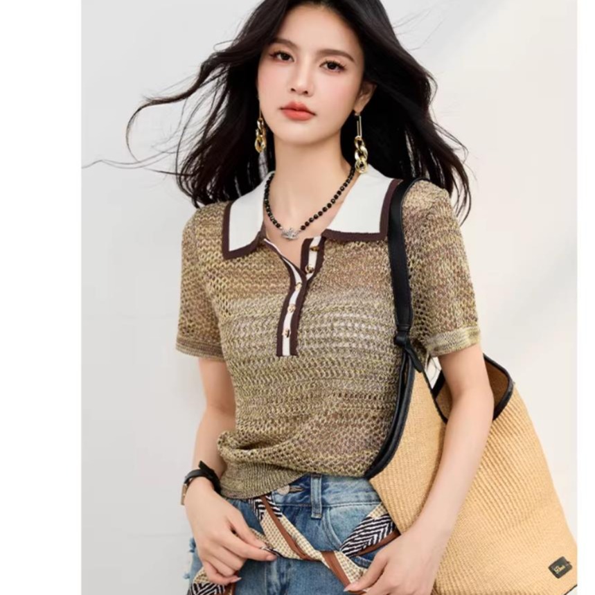 POLO 칼라 레트로 홀로우 아웃 반팔 티셔츠 여성 여름 다용도 슬림해 보이는 배색 니트 블라우스 맨위 2026 새로운