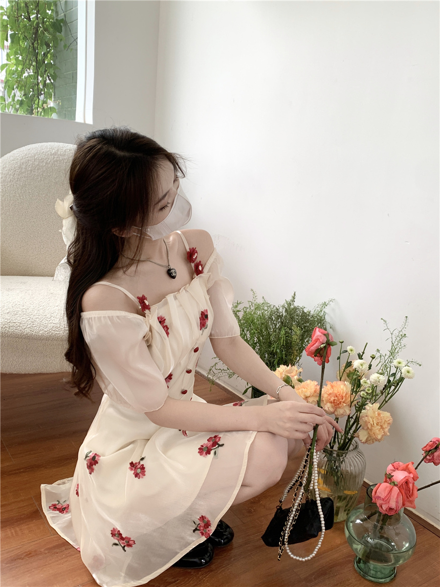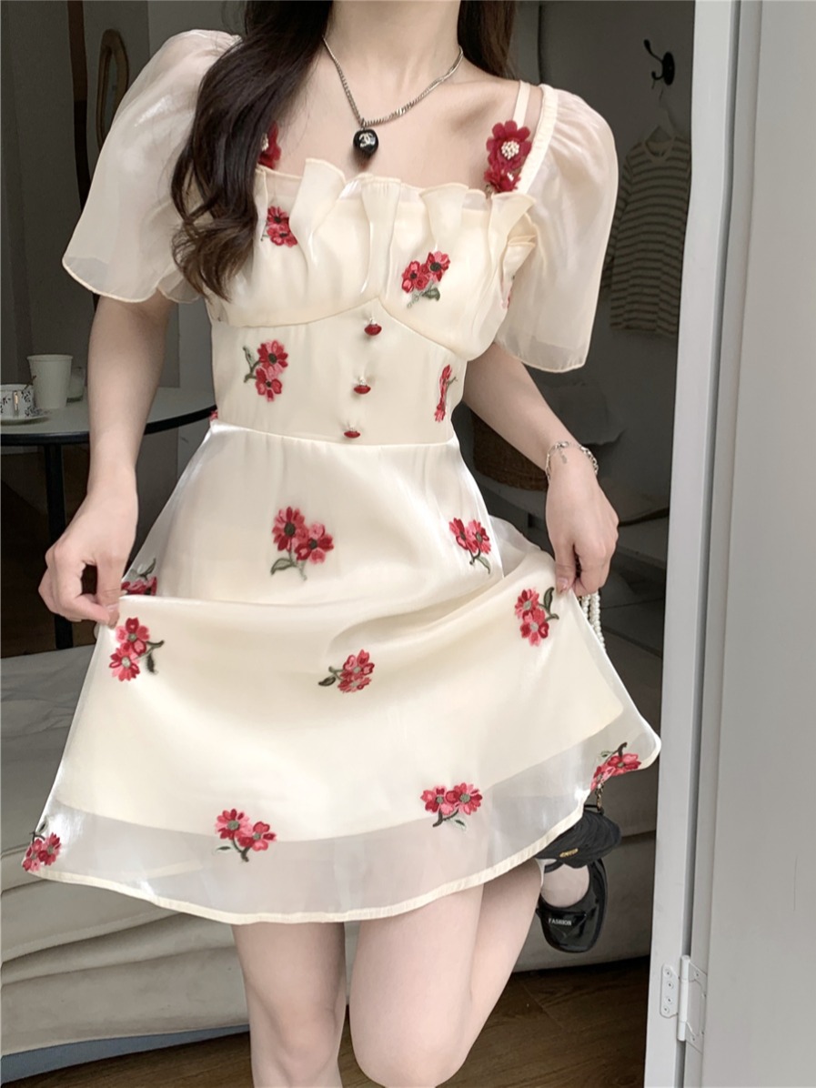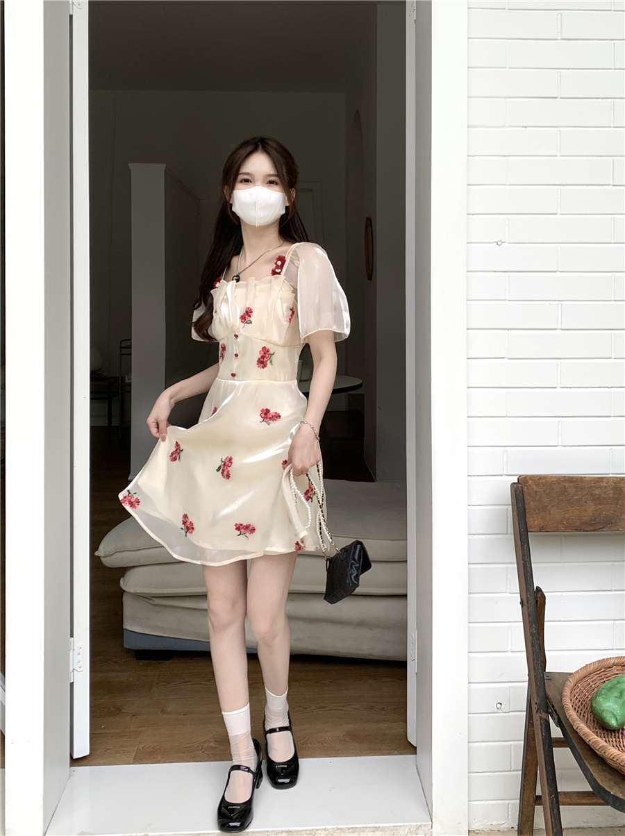 재고 있음 실사 프랑스식 달콤함 첫사랑 꽃무늬 장미 드레스 고급 센스 허리 수축 A라인 스커트 아이들