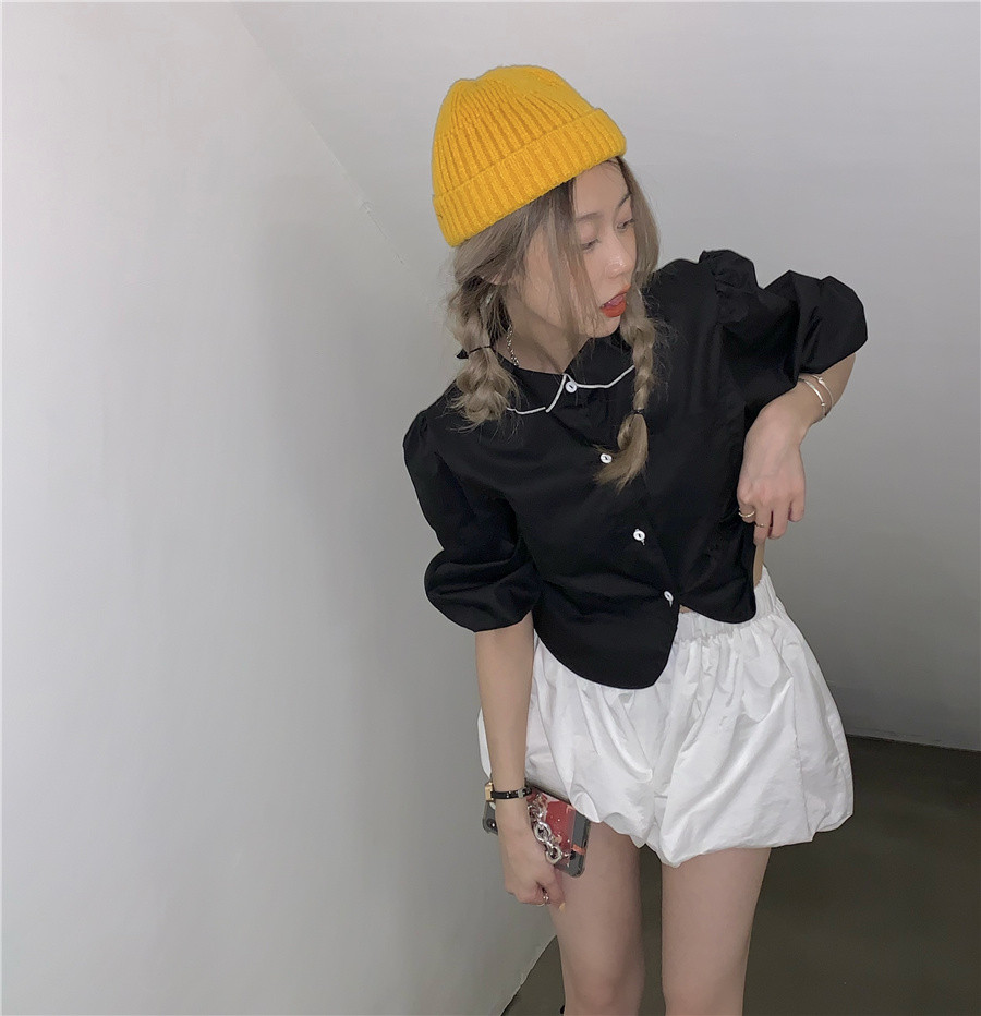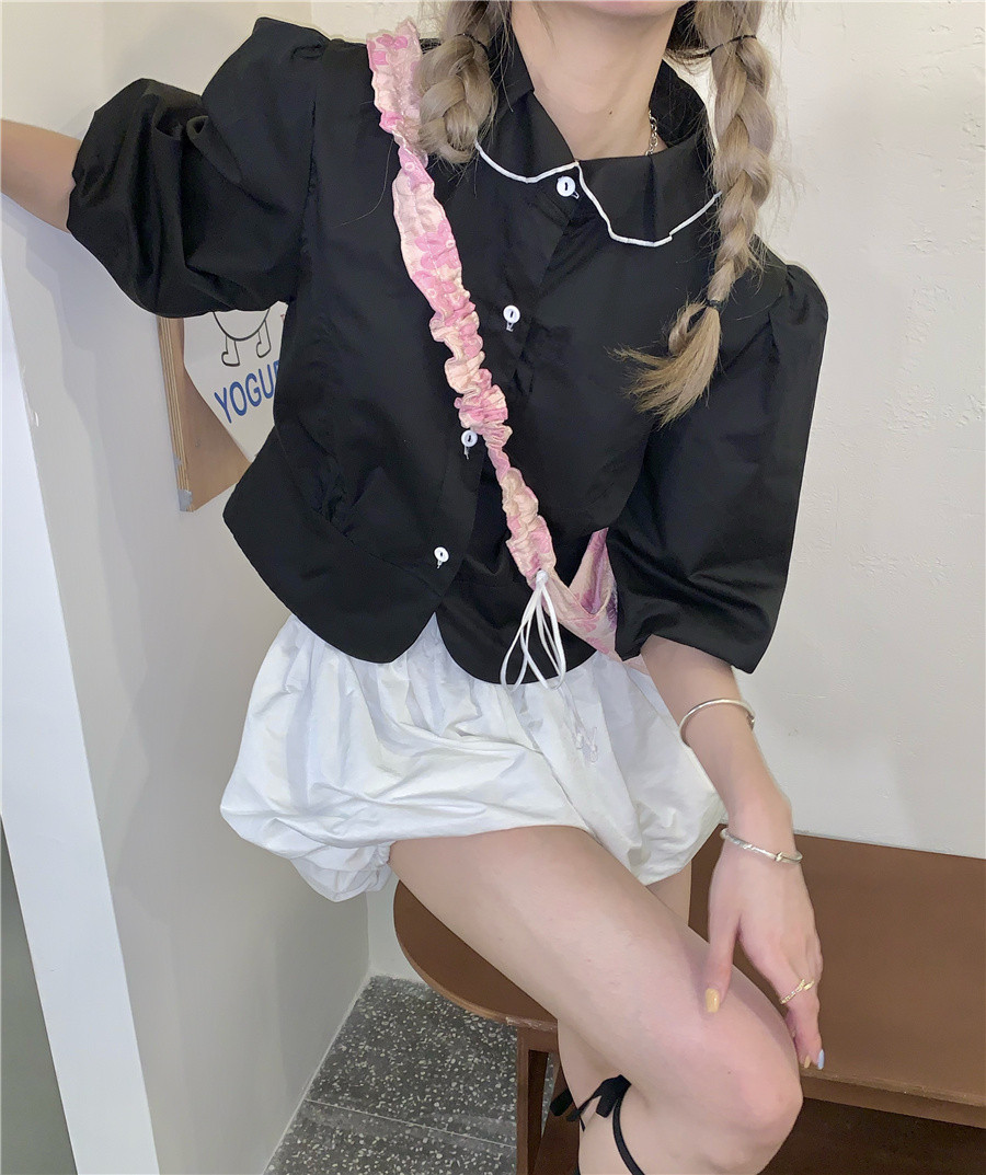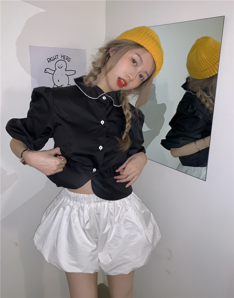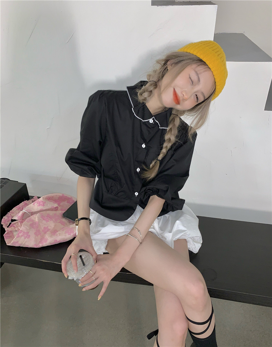 재고 있음 실사 배색 측면 베이비 칼라 벌룬 소매 5 점 소매 셔츠