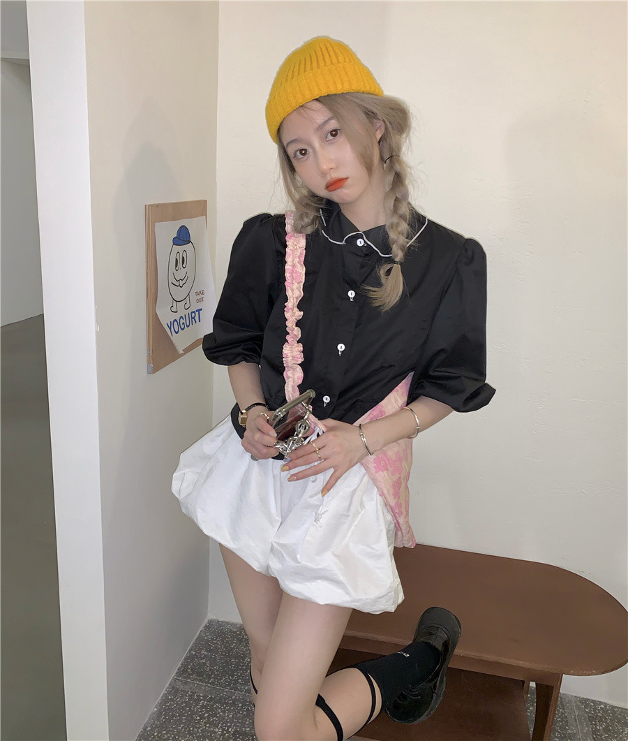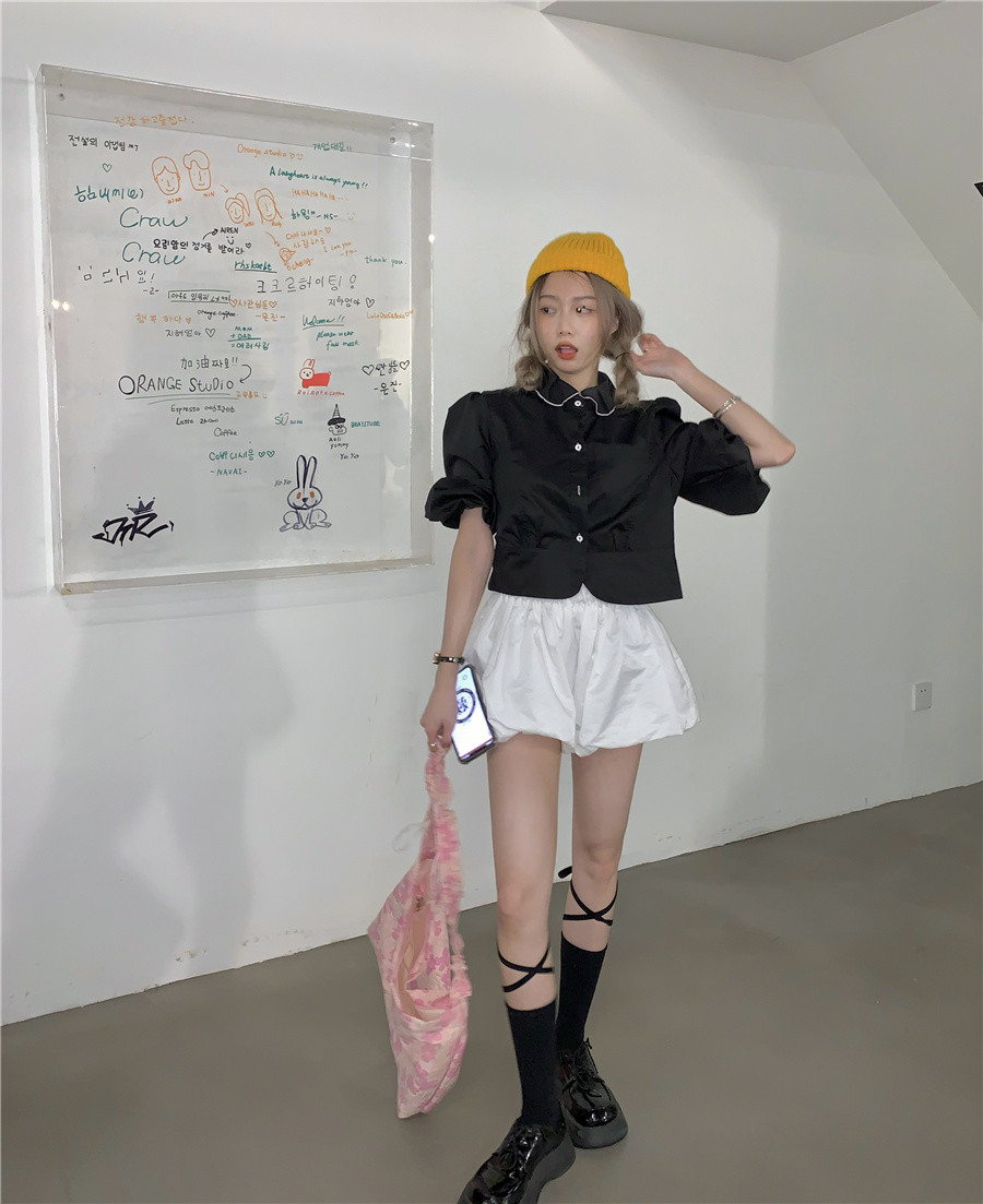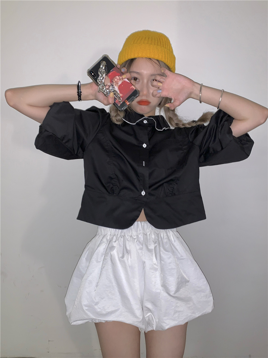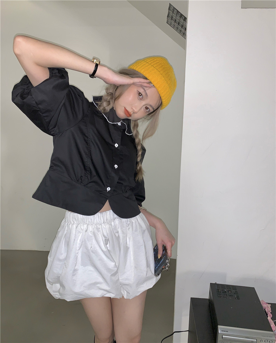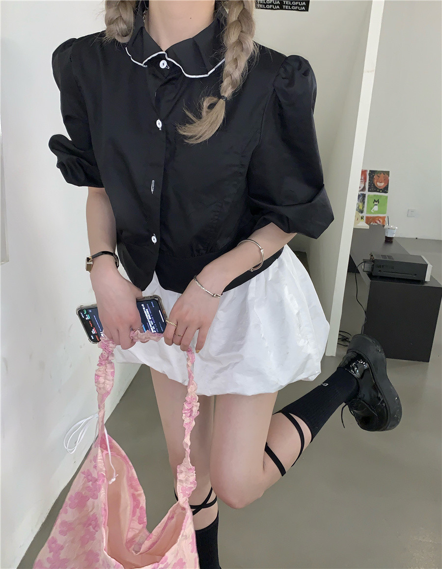 재고 있음 실사 배색 측면 베이비 칼라 벌룬 소매 5 점 소매 셔츠