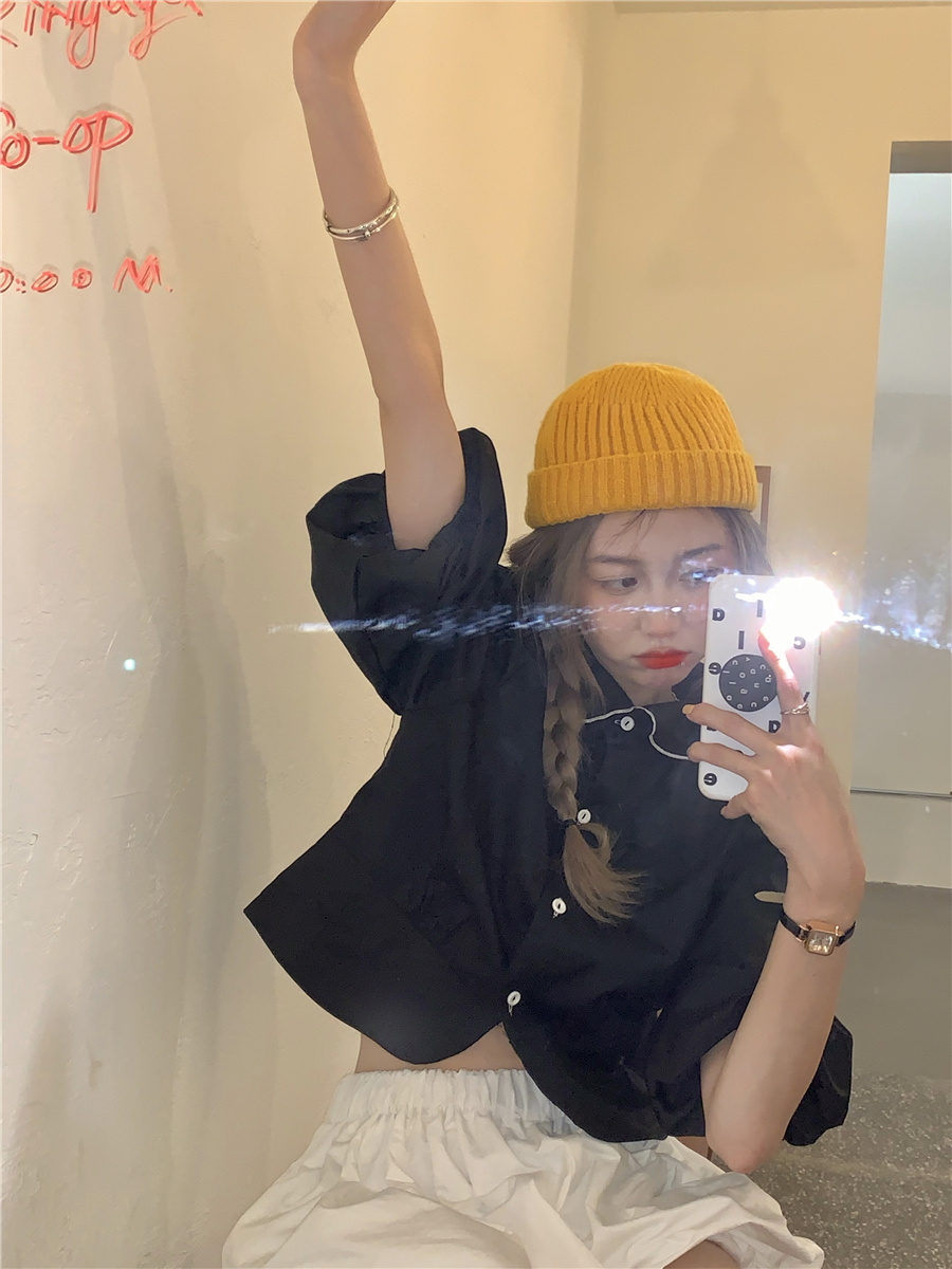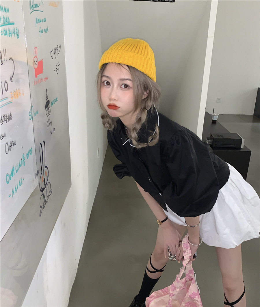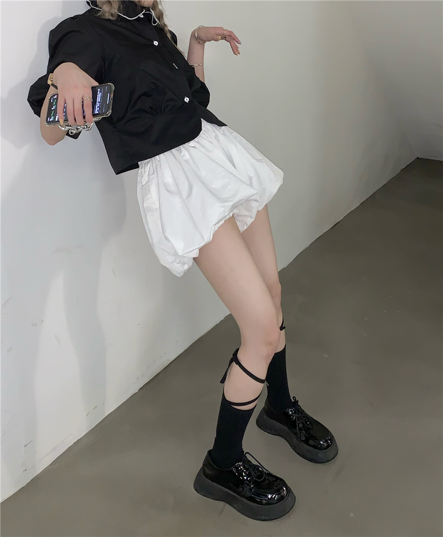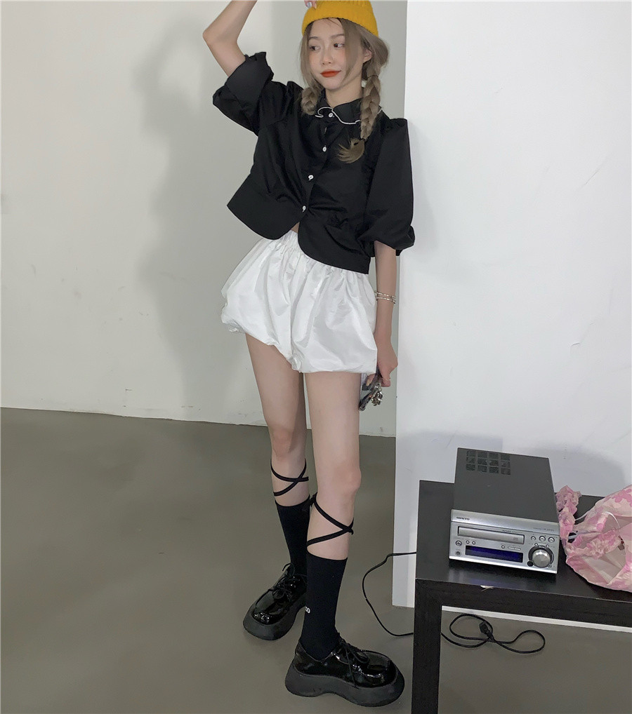 재고 있음 실사 배색 측면 베이비 칼라 벌룬 소매 5 점 소매 셔츠