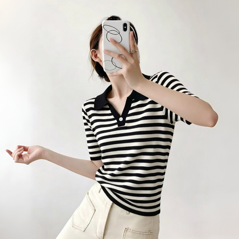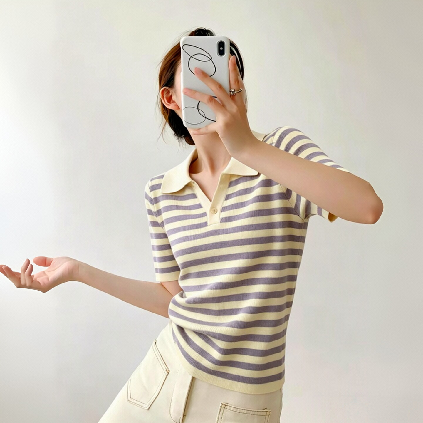 보존 섹션 추천 배색 스트라이프 폴로 칼라 반팔 니트 스웨터 여성 여름 새로운 품격 한 부서 다용도 맨위
