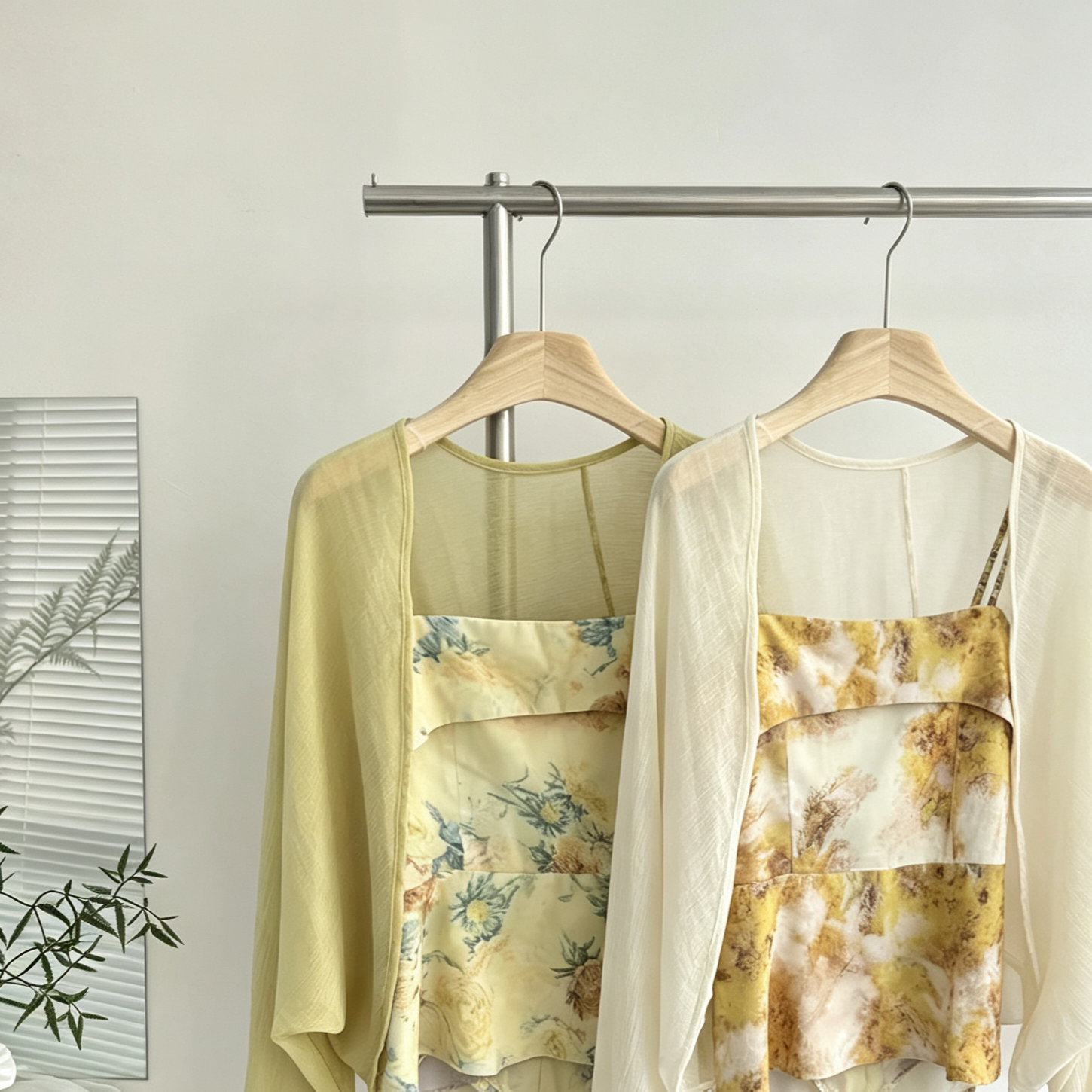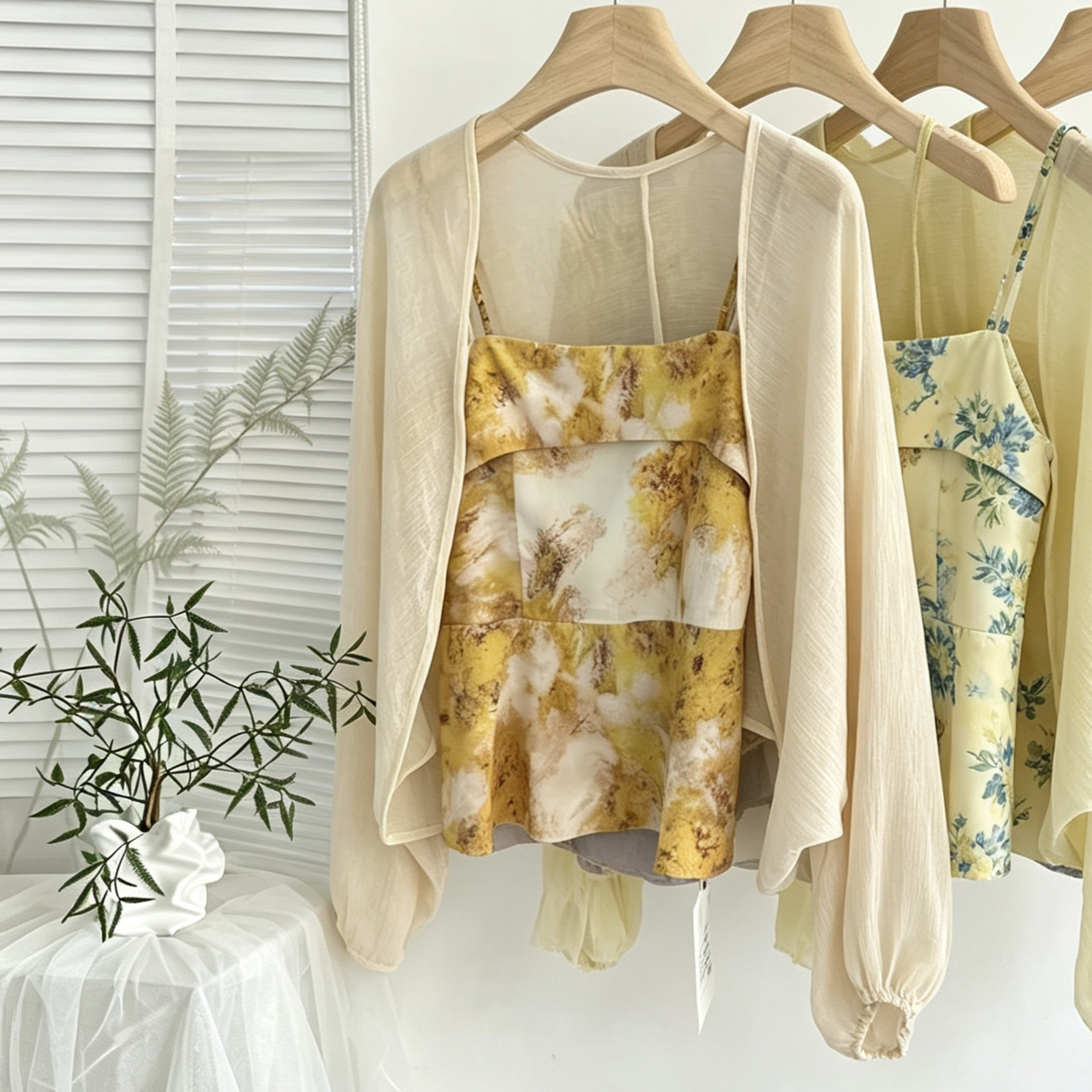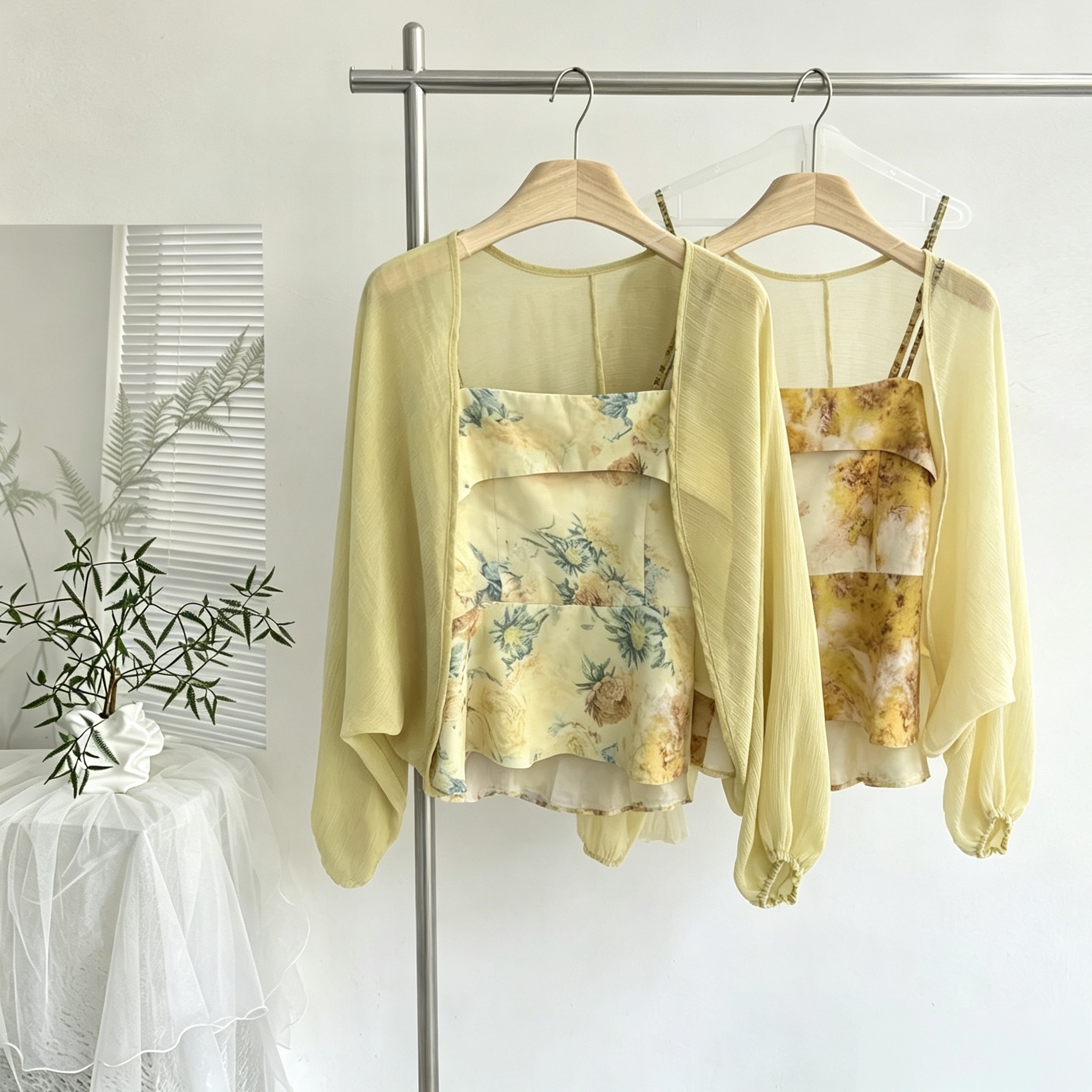 아메리칸 레트로 프린트 슬립 오픈 가디건 두 조각 여성 세트 프랑스식 레트로 Chic 캐주얼 자외선 차단 숄 조끼 맨위