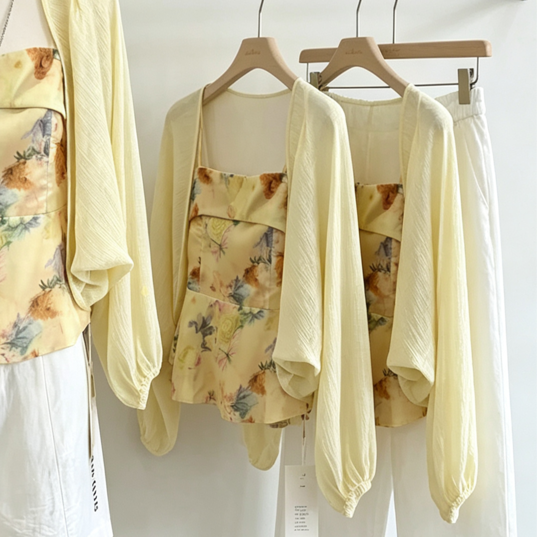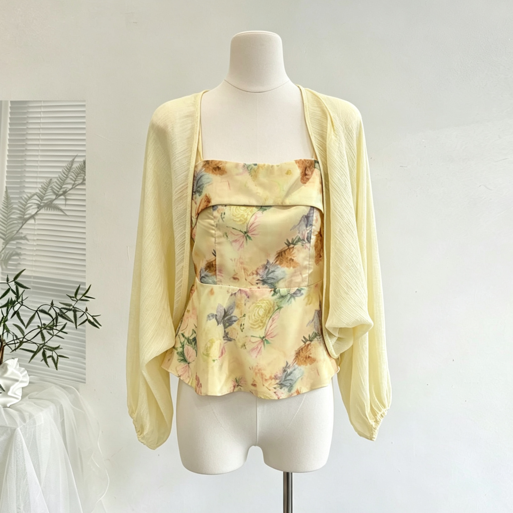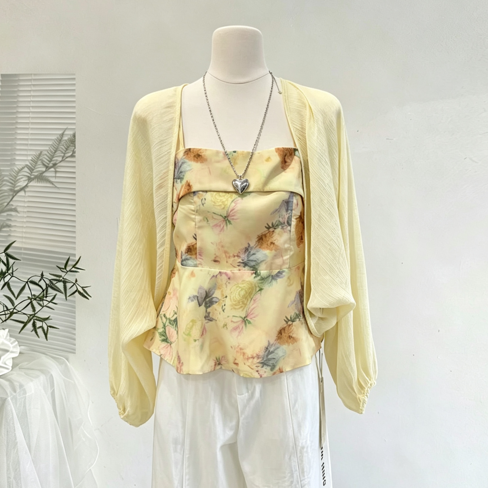 아메리칸 레트로 프린트 슬립 오픈 가디건 두 조각 여성 세트 프랑스식 레트로 Chic 캐주얼 자외선 차단 숄 조끼 맨위