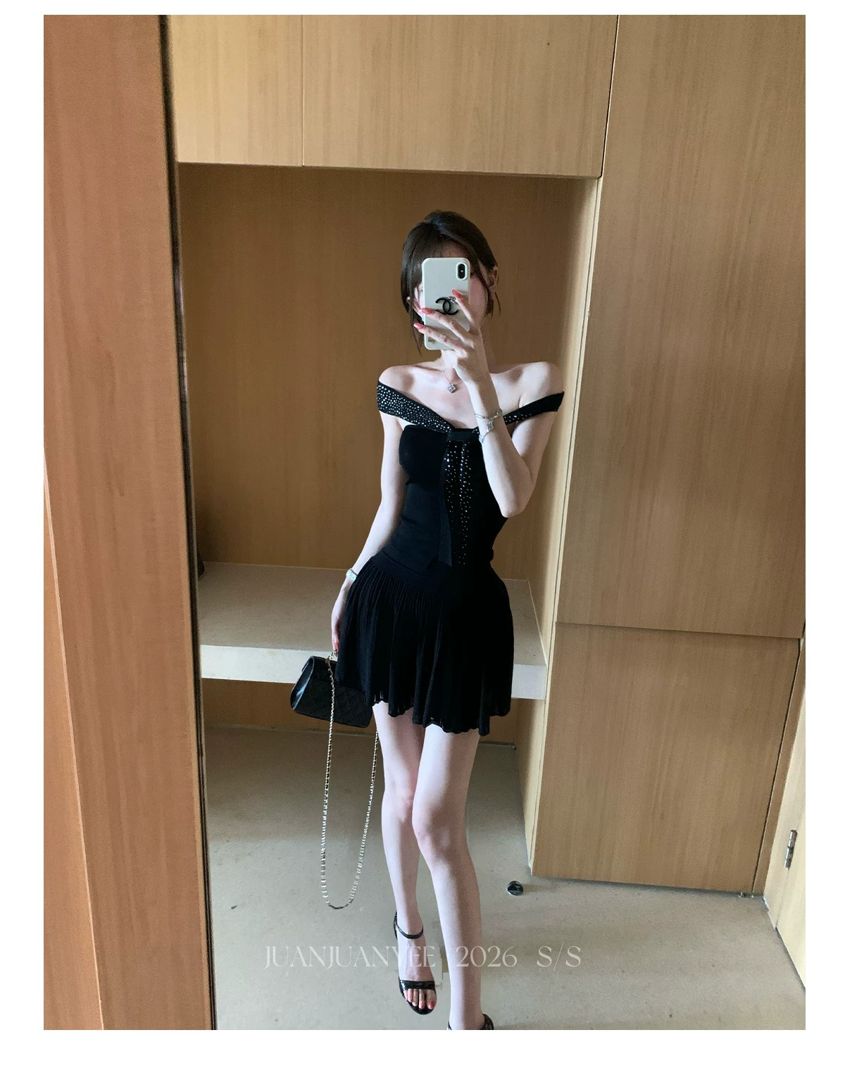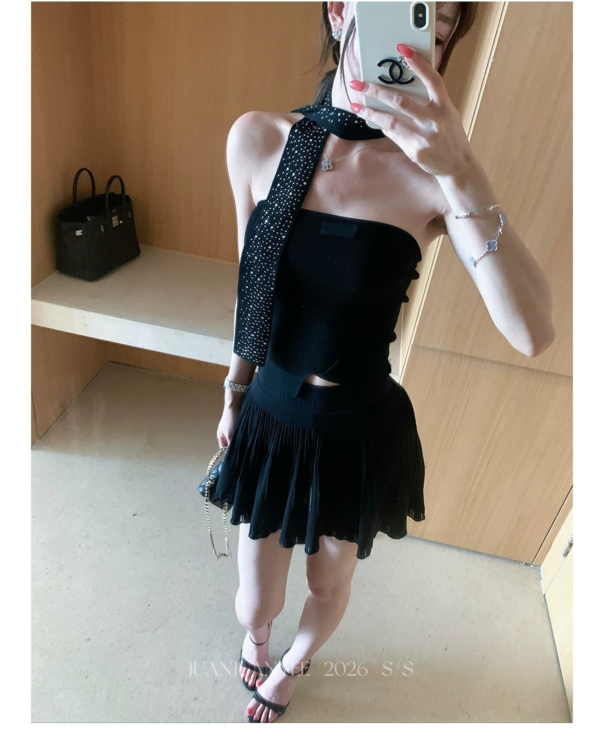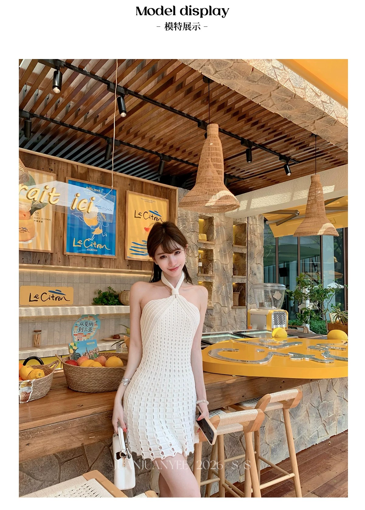 디자인 센스 행침 목 홀로우 아웃 니트 여성 드레스 순수한 욕망 핫걸 바람 허리 수축 몸매 가꾸기 슬림해 보이는 아름다운 타이트 스커트 미니 스커트