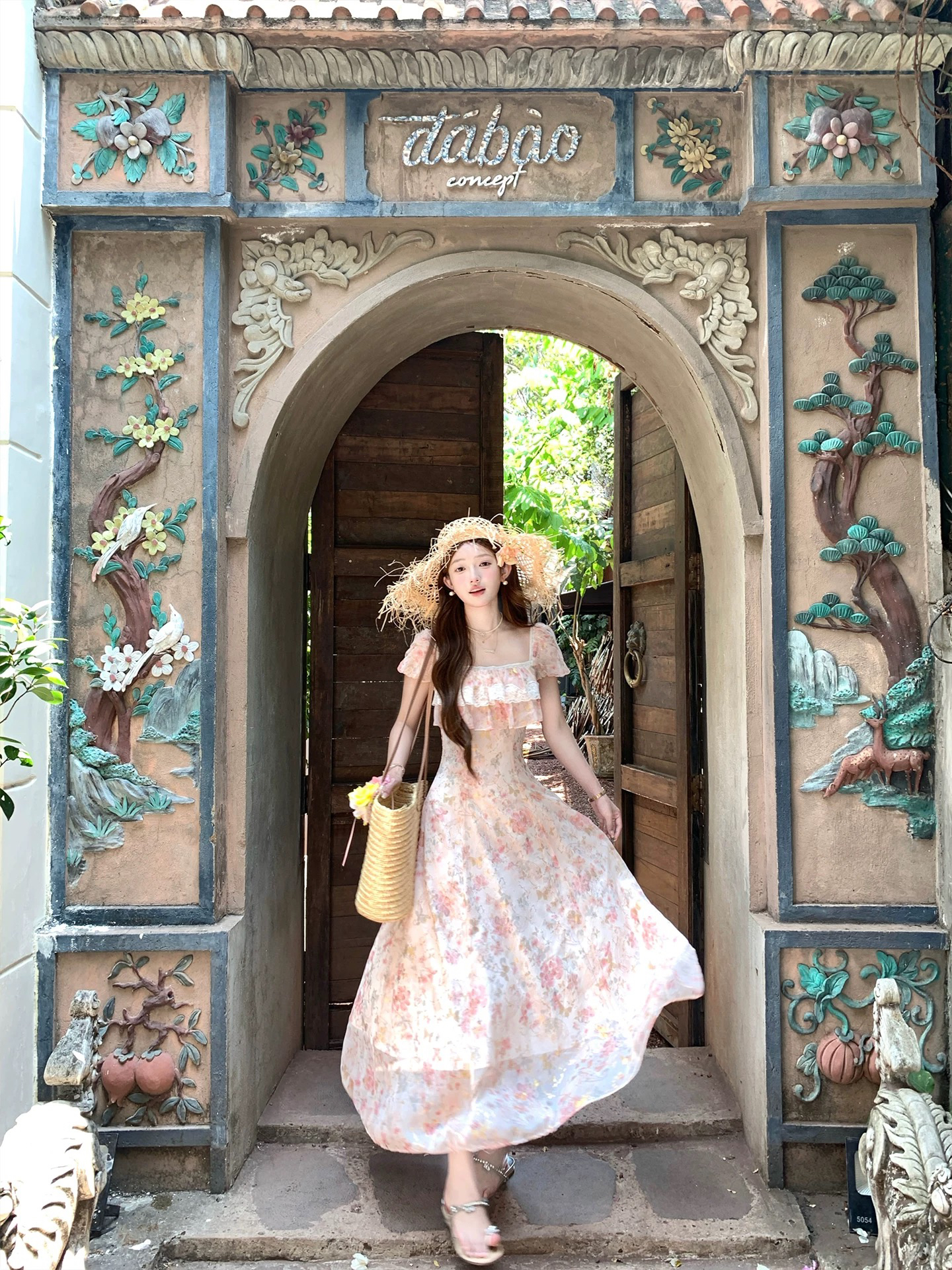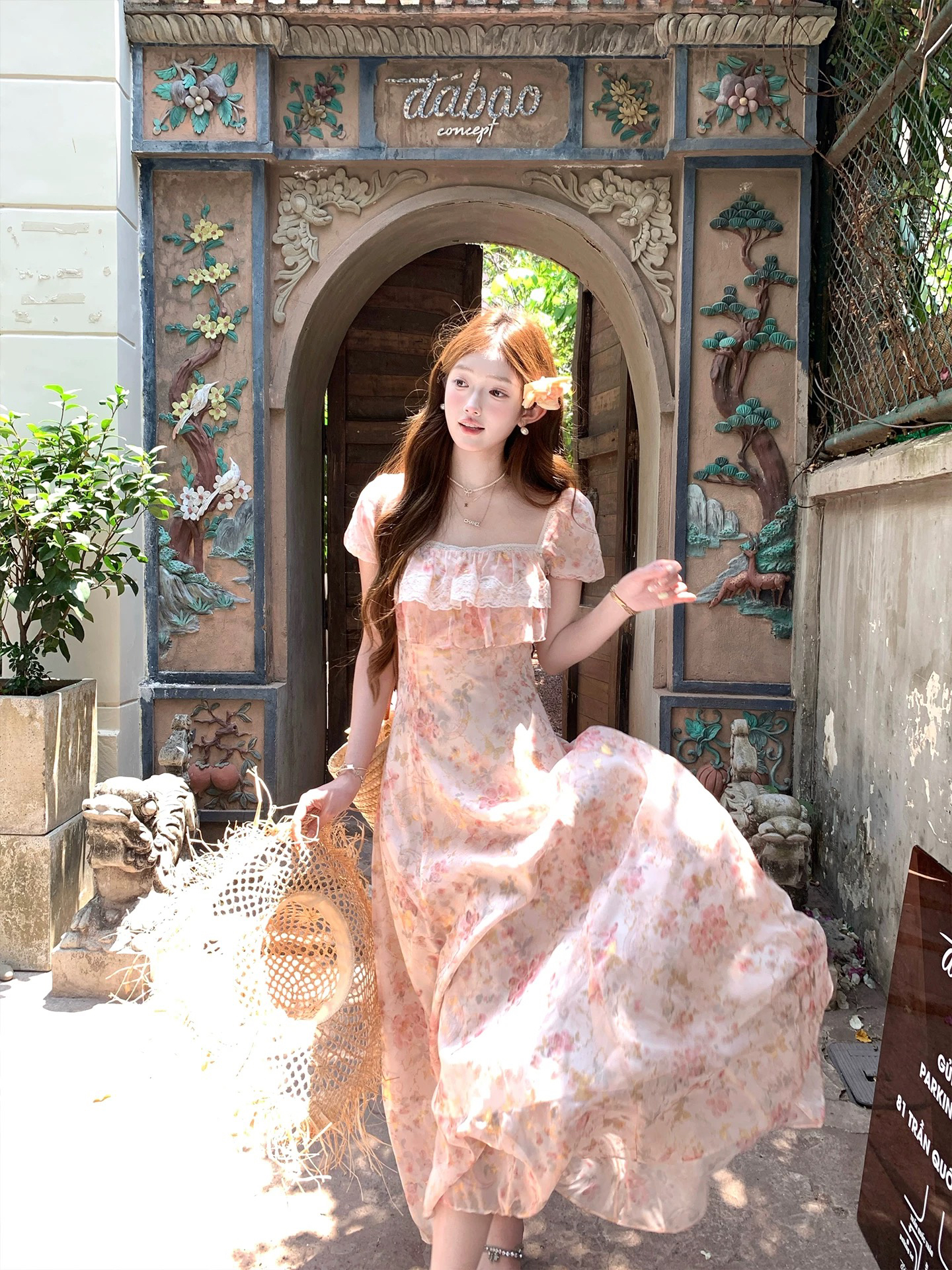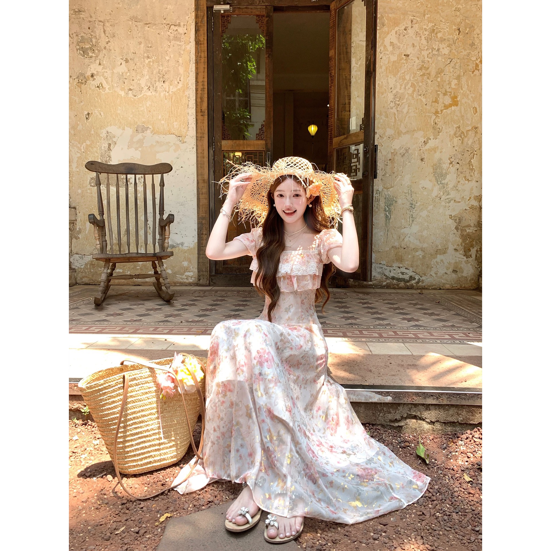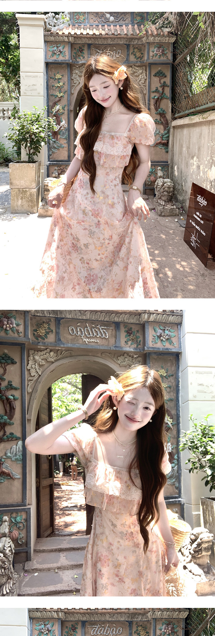 h2an1 studio 丨 맞춤 사쿠라 꽃가루 패치워크 꽃 슬립 드레스 프랑스식 민소매 휴가 롱 스커트