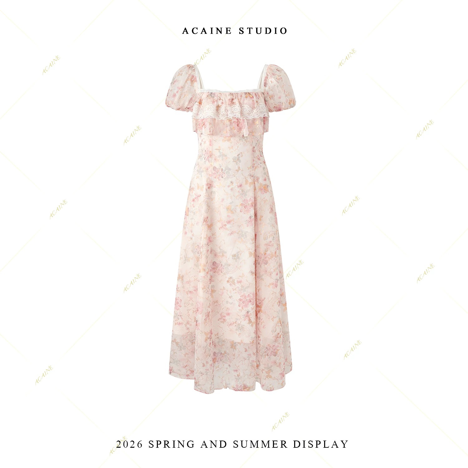 acaine 판금 구름 사쿠라 롱 코트 광장 칼라 거품 소매 프랑스식 허리 수축 꽃무늬 여성 드레스 여름 달콤함 치마