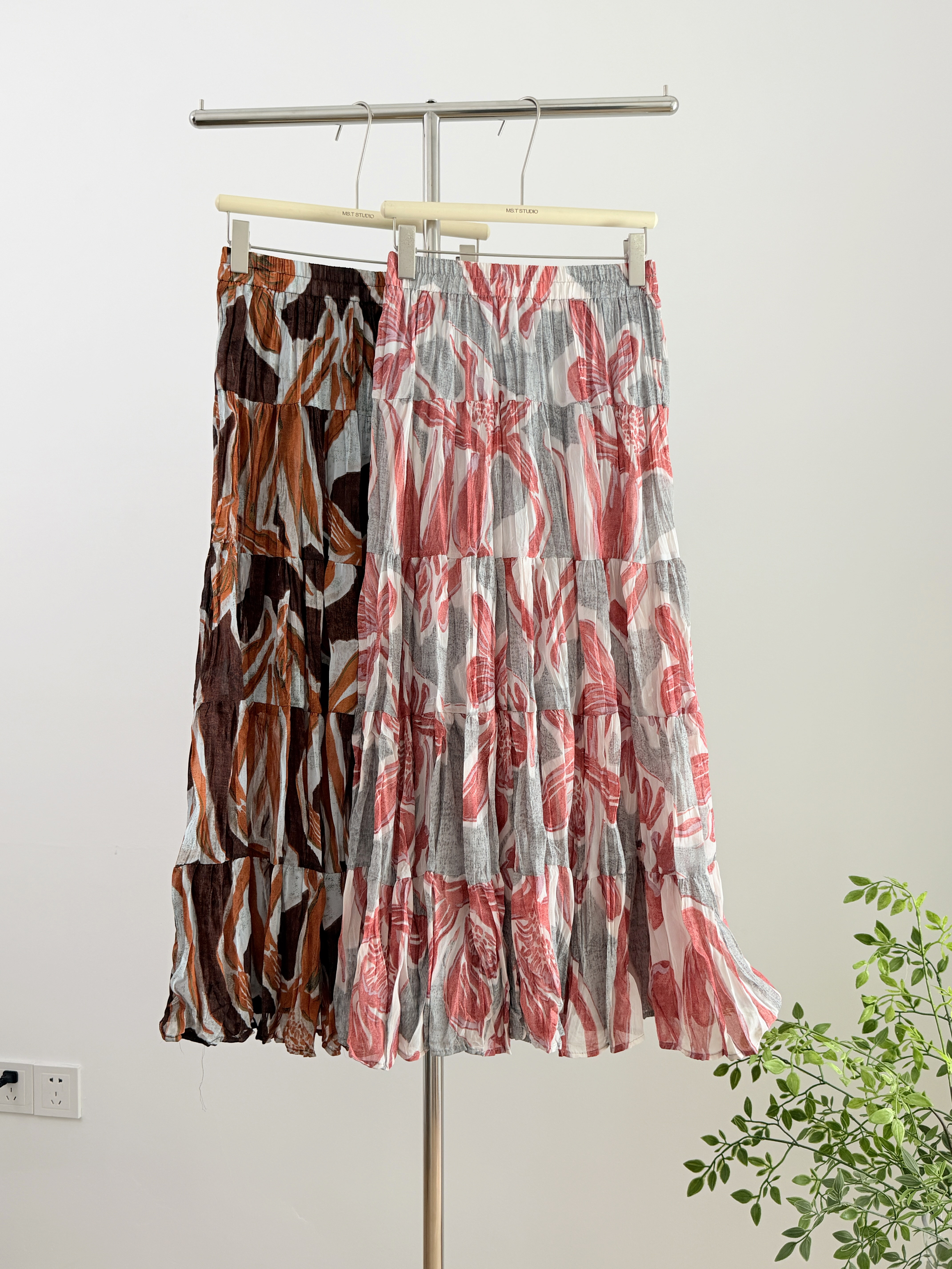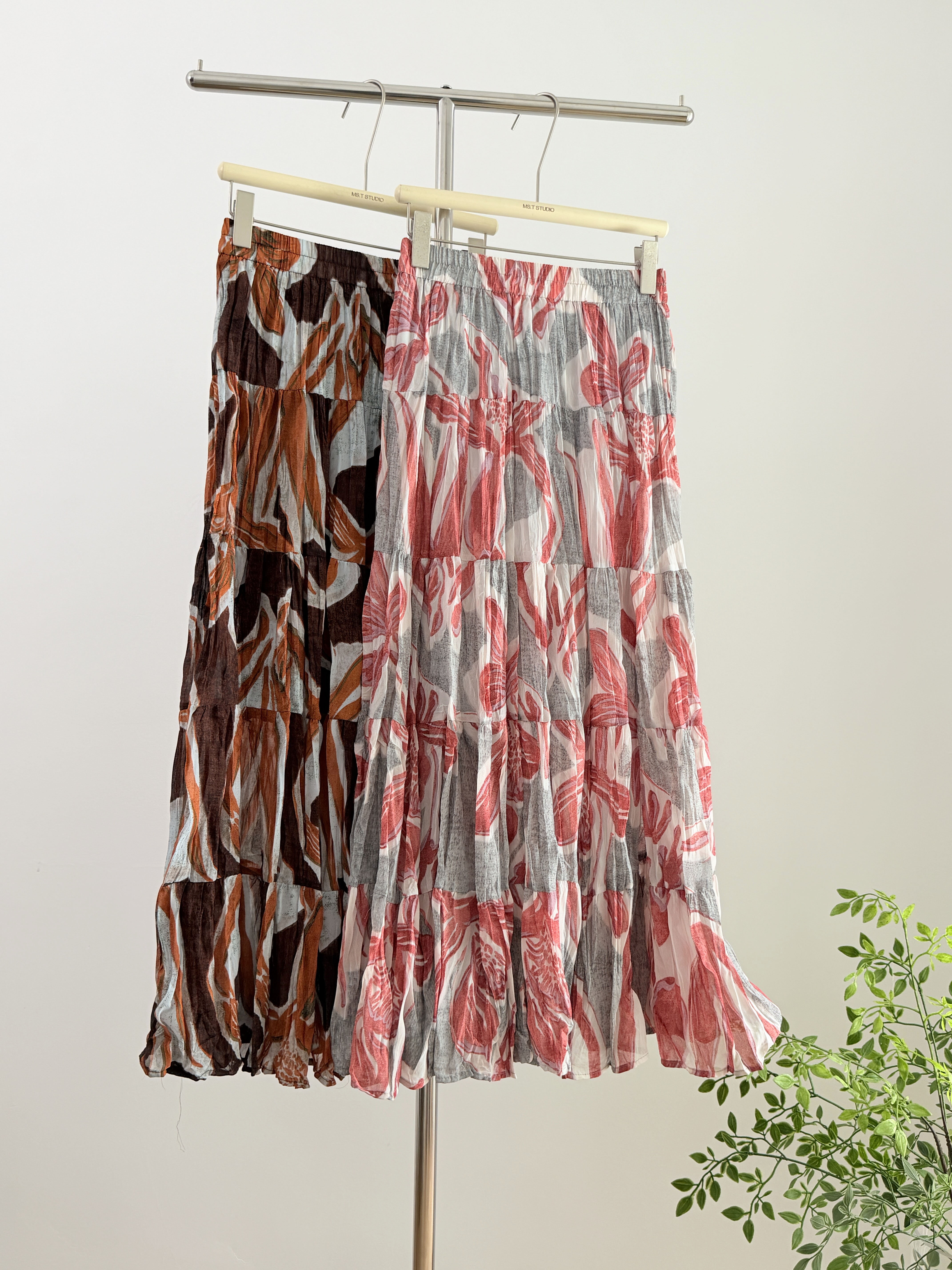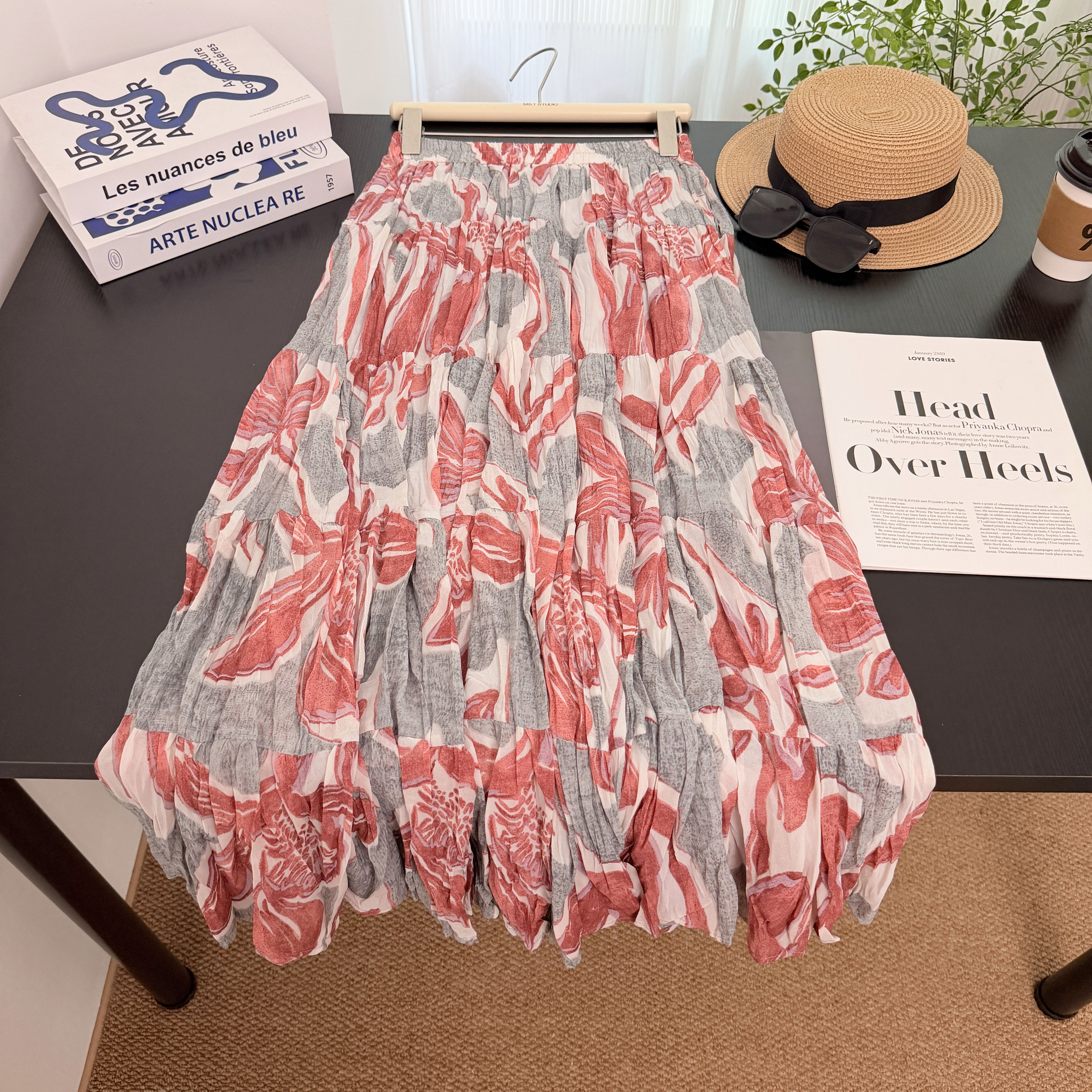 여름 새로운 큰 진자 반신 롱 스커트 여성 2025 새로운 표지 십자가 패치워크 한 마디 케이크 쉬폰 꽃무늬 반신 스커트