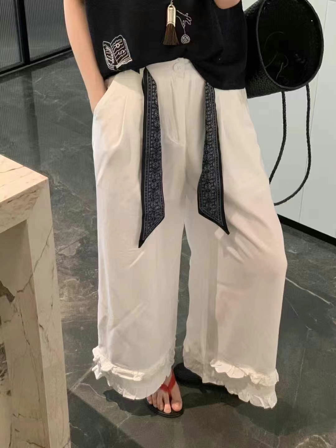 한 부서 무거운 작업 자수 측면 레이스 스트레이트 와이드 레깅스 바지 여름 새로운 슬림해 보이는 허리밴드 캐주얼 바지
