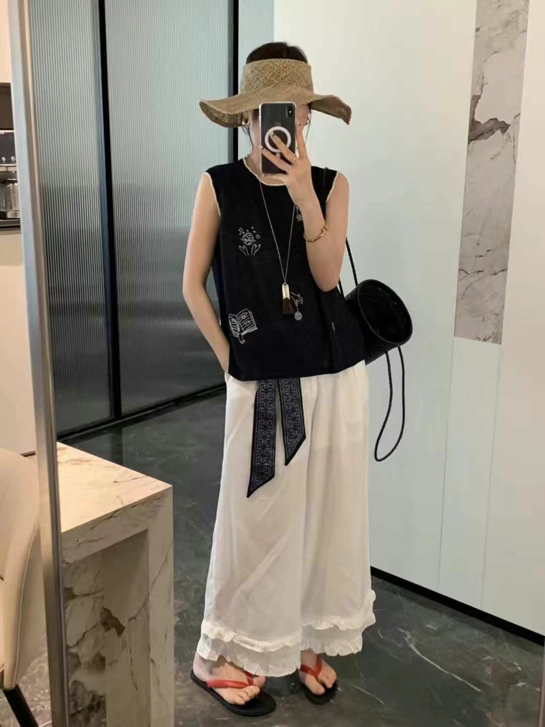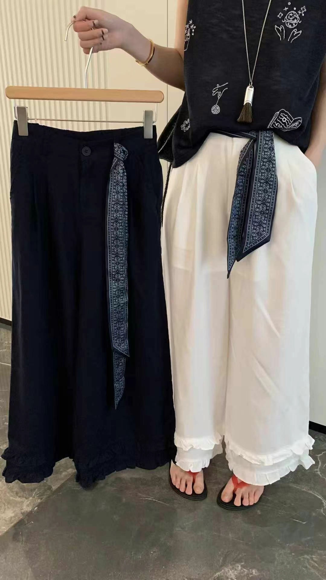 상쾌 여름 화이트 블루 색상 시스템 면 린넨 레이스 와이드 레그 팬츠 통기성 다용도 슬림해 보이는 9 포인트 다용도 캐주얼 바지