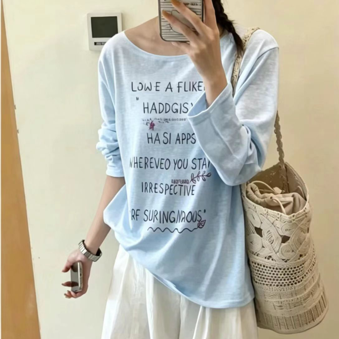 주문 재고 있음 아메리칸 레트로 알파벳 프린트 얇은 스타일 자외선 차단 맨위 V넥 슬림해 보이는 다용도 긴팔 티셔츠 여성 아모이