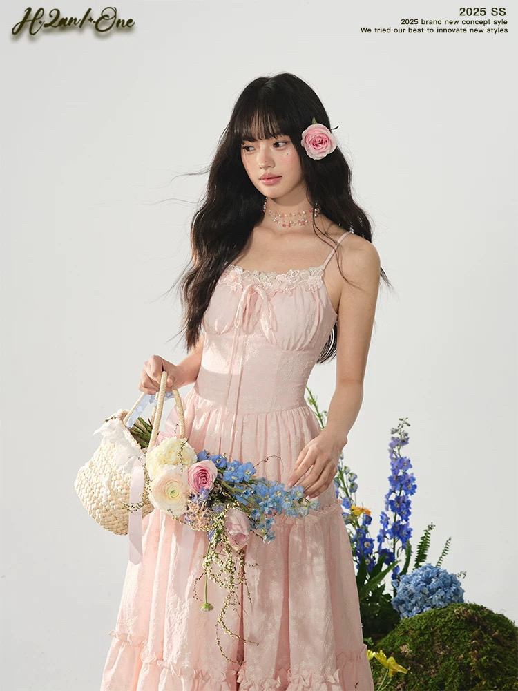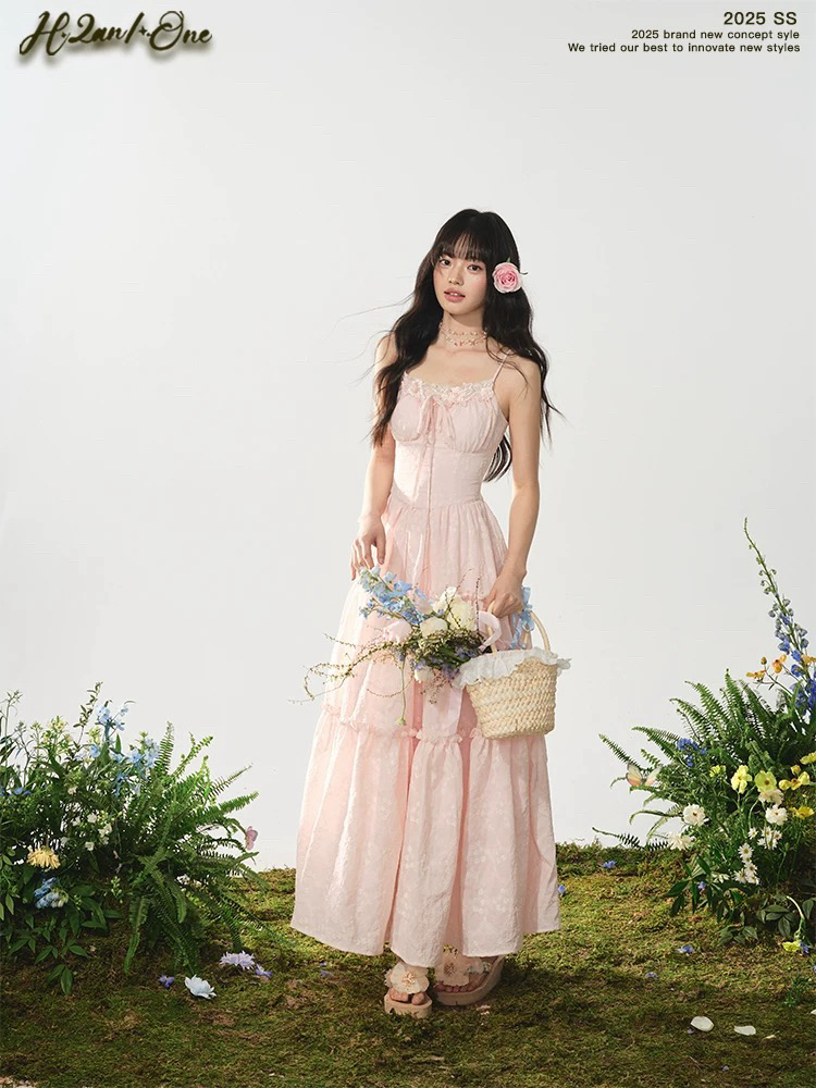 h2an1 studio 丨 맞춤 사쿠라 꽃가루 패치워크 꽃 슬립 드레스 프랑스식 민소매 휴가 롱 스커트