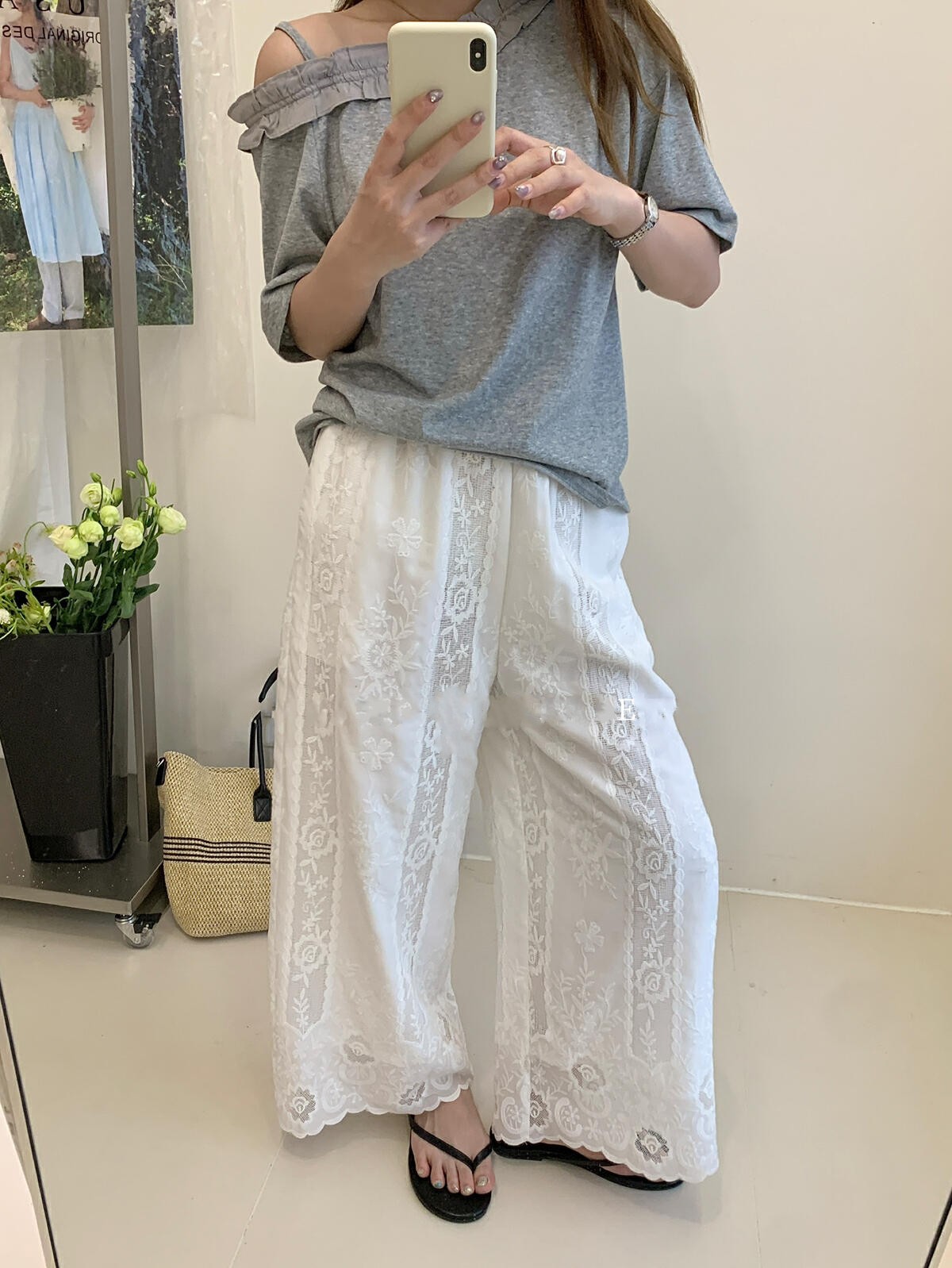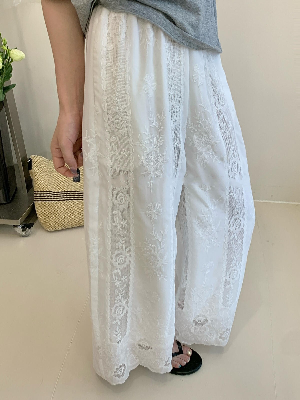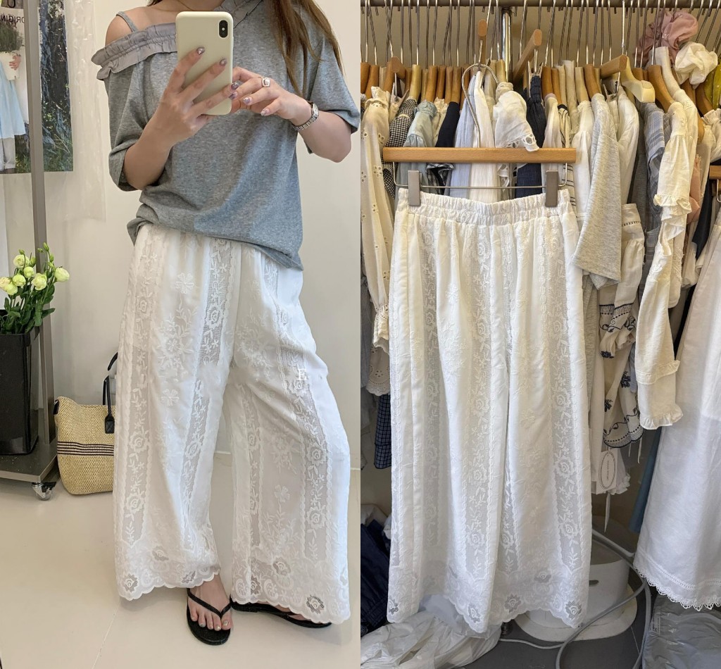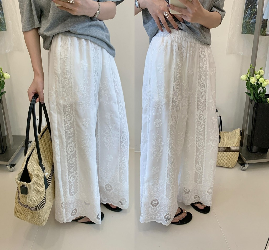 한 부서 무거운 작업 자수 측면 레이스 스트레이트 와이드 레깅스 바지 여름 새로운 슬림해 보이는 허리밴드 캐주얼 바지
