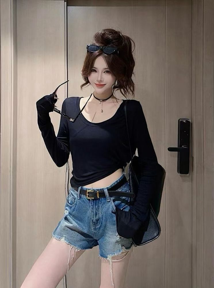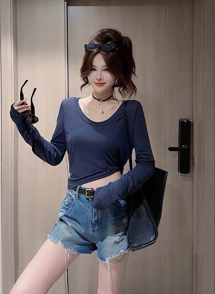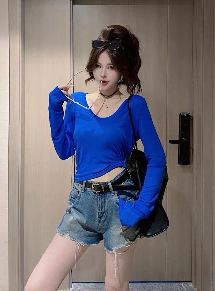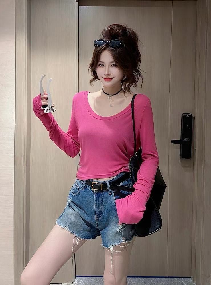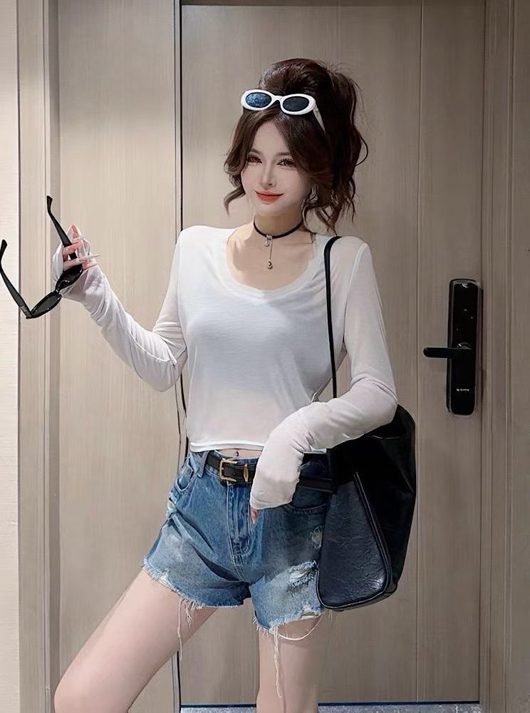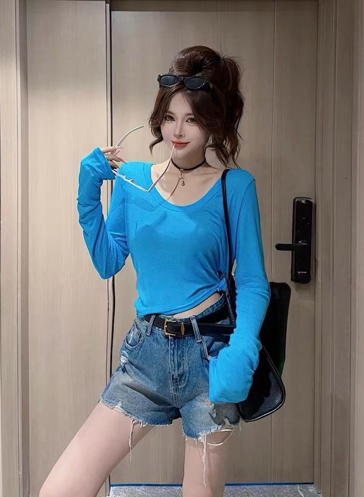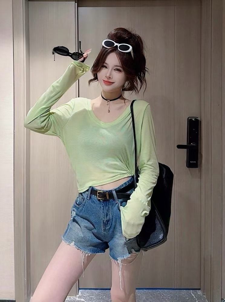 한 부서 도파민 바람 u 칼라 긴팔 티셔츠 여성 여름 얇은 스타일 몸매 가꾸기 슬림해 보이는 다용도 자외선 차단 블라우스 핫걸 맨위