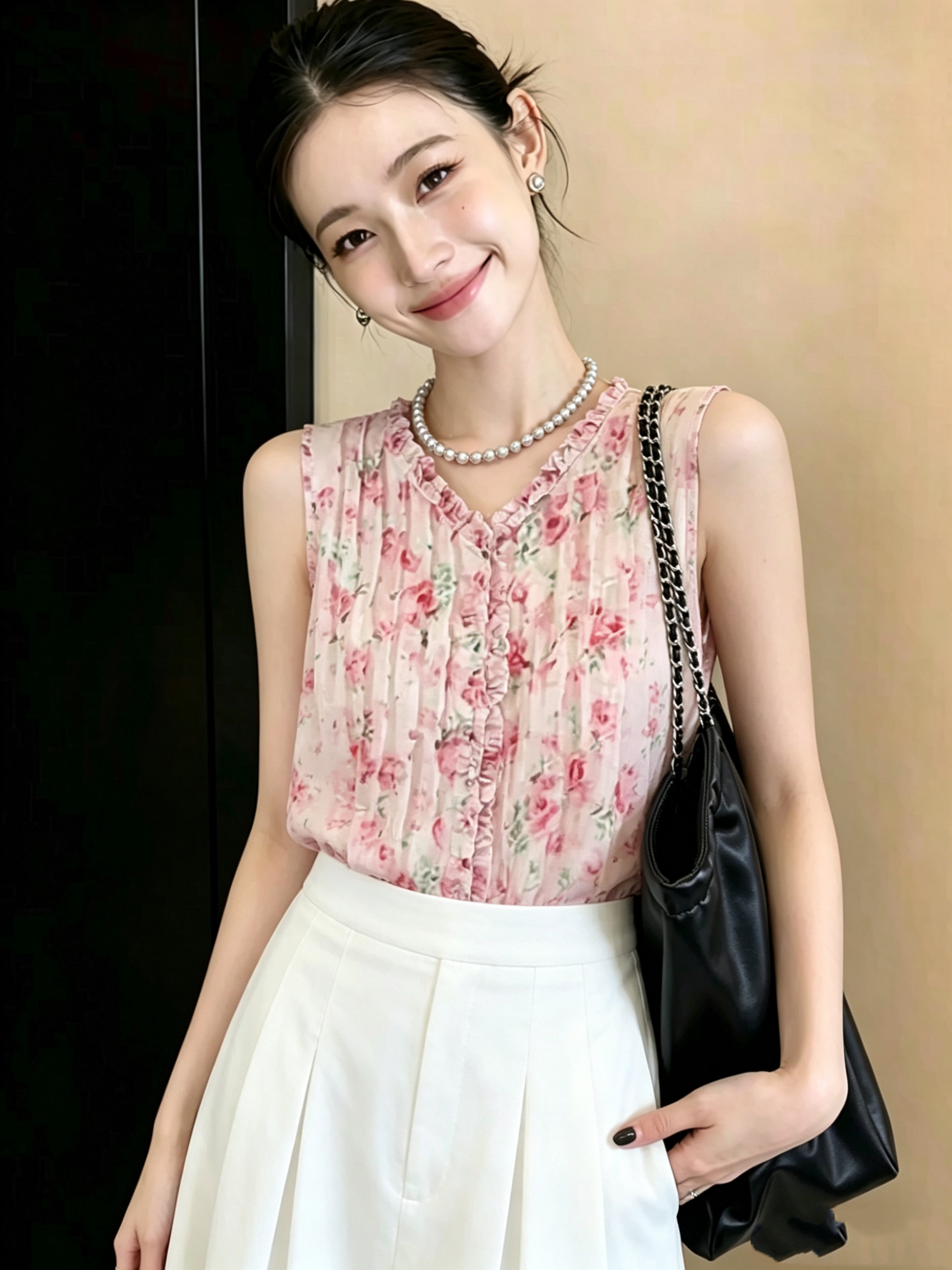 재고 있음 2026 여름 새로운 프린트 프릴 V넥 작은 셔츠 민소매 맨위