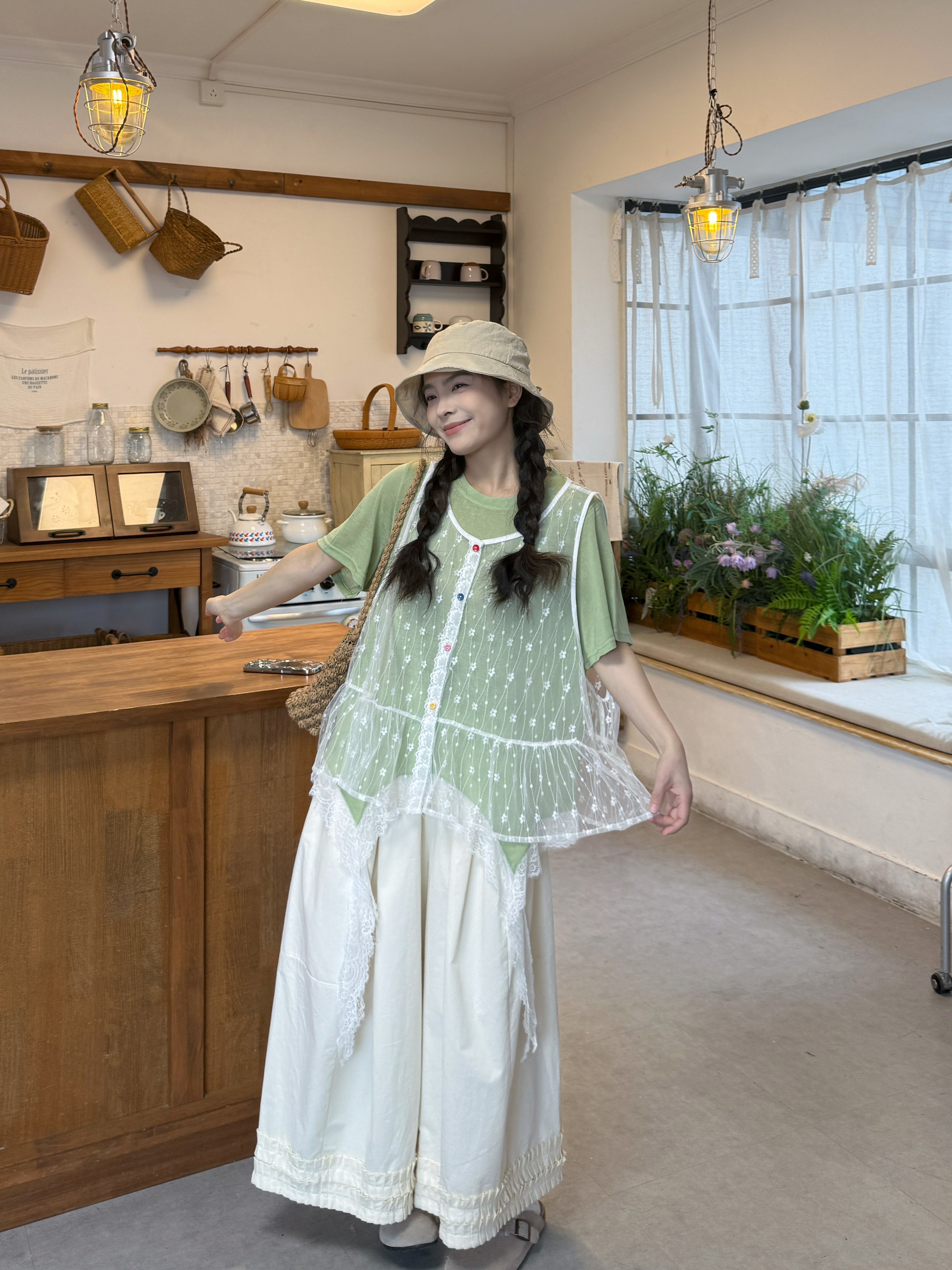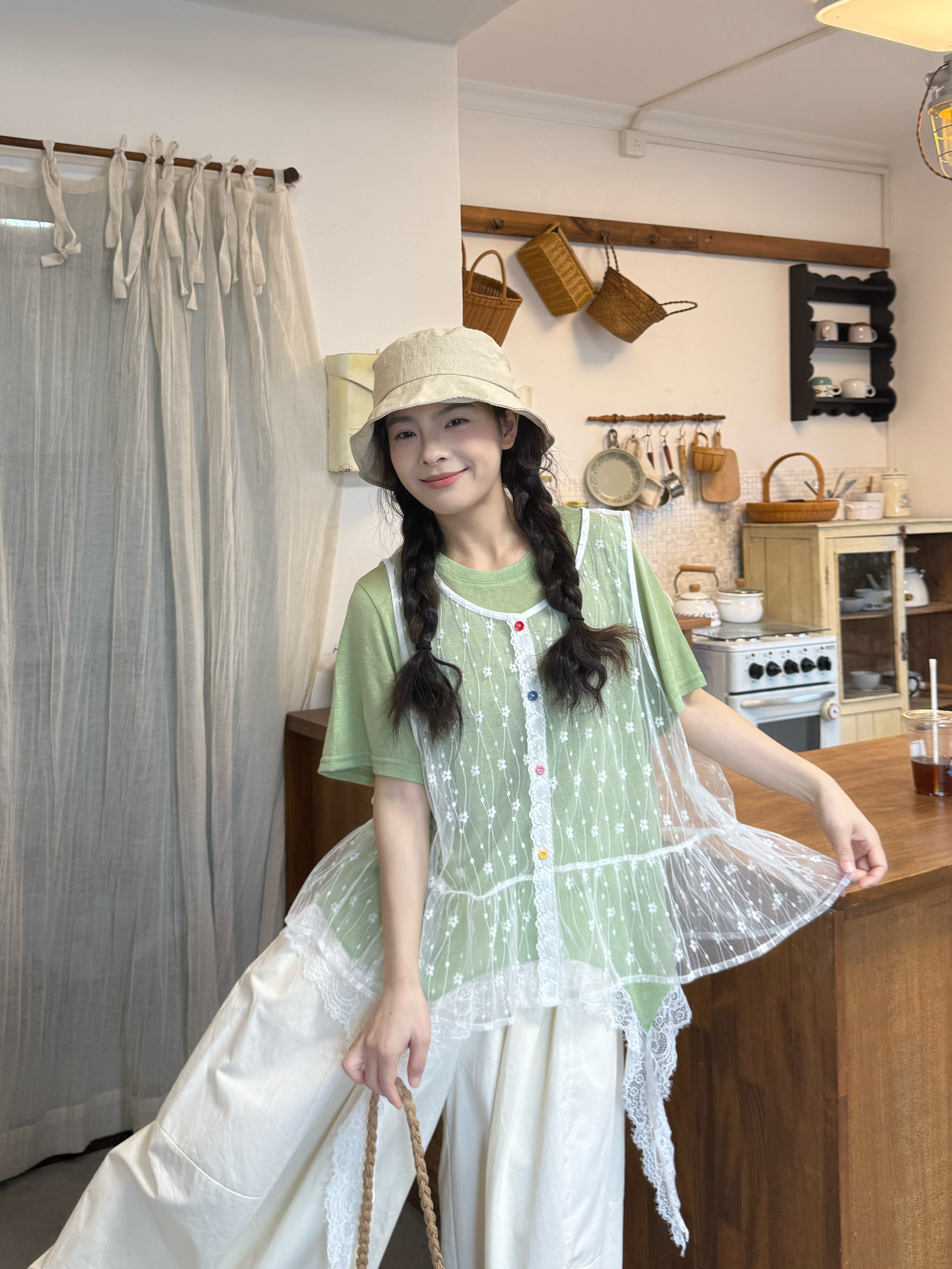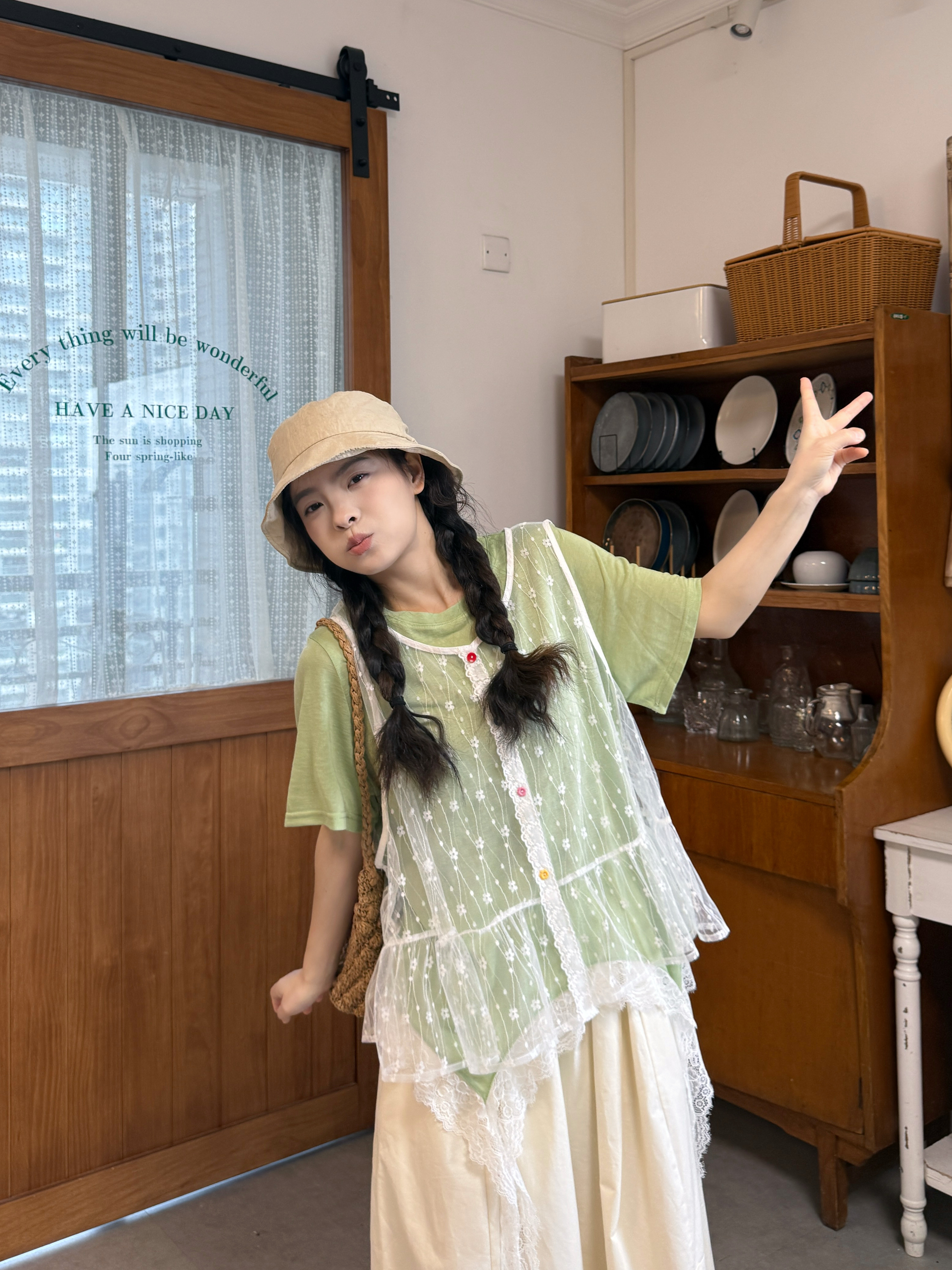 실사 레이스 레이스 루즈핏 자수 반팔 셔츠