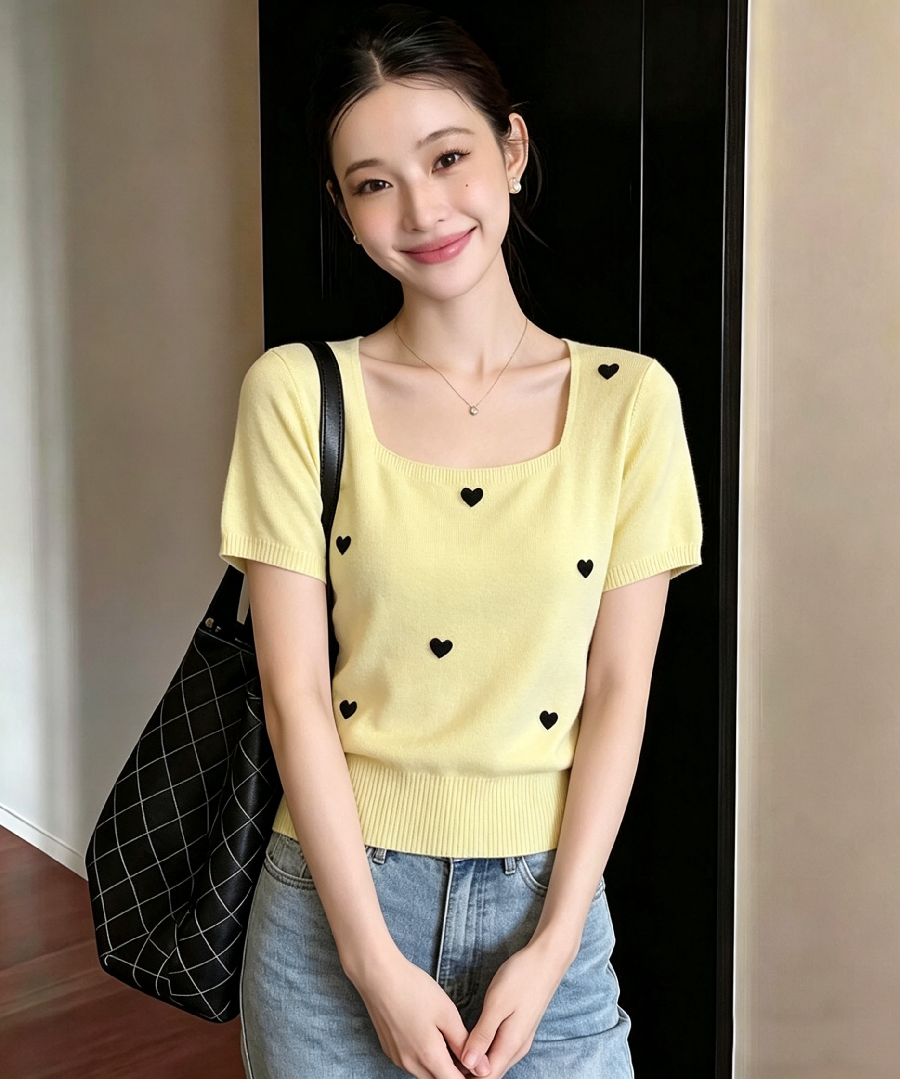 프랑스식 광장 칼라 긍정적 인 어깨 반팔 티셔츠 여성 여름 디자인 센스 하트 달콤함 아름다운 니트 쇼트 스타일 켜기