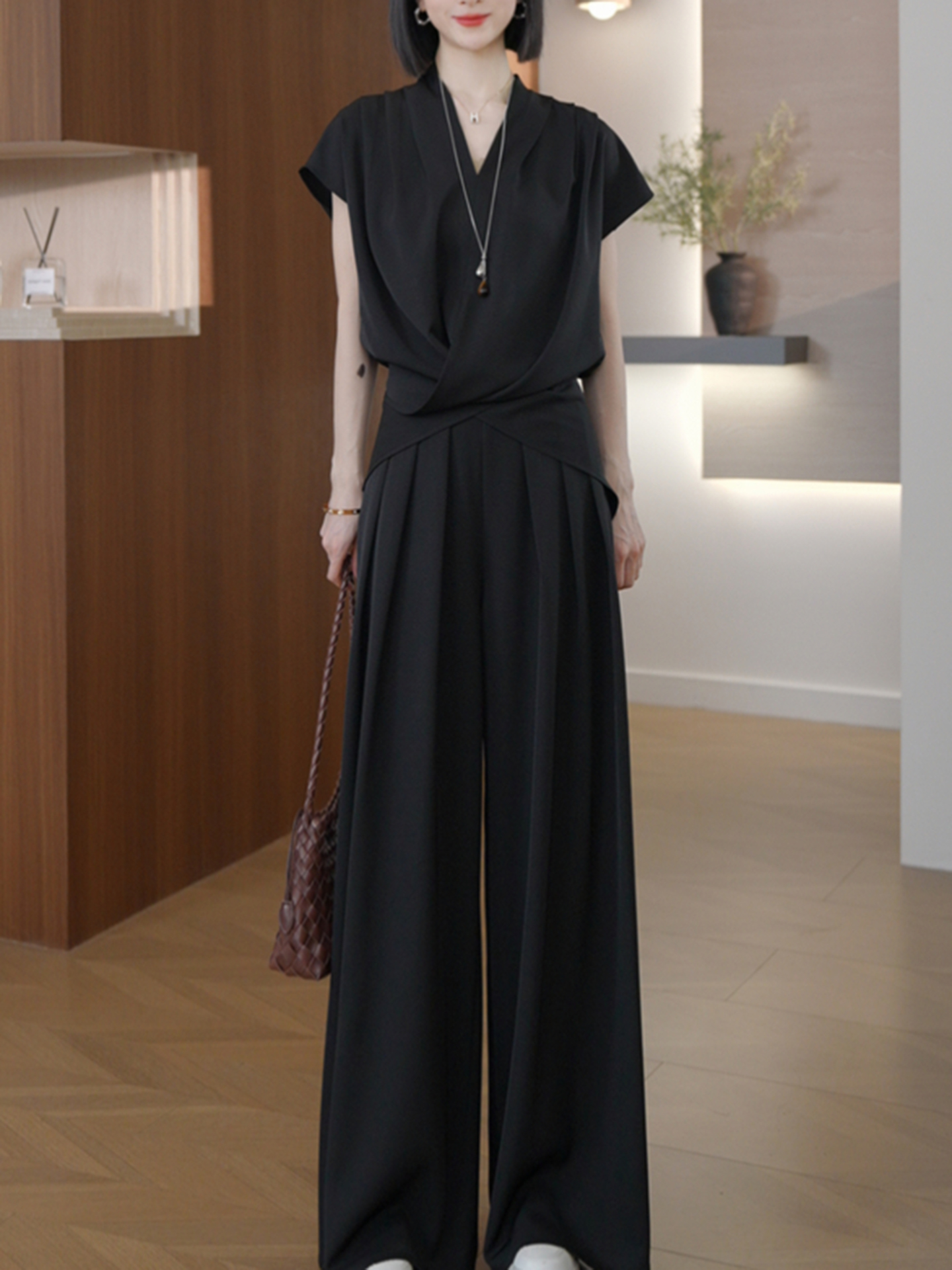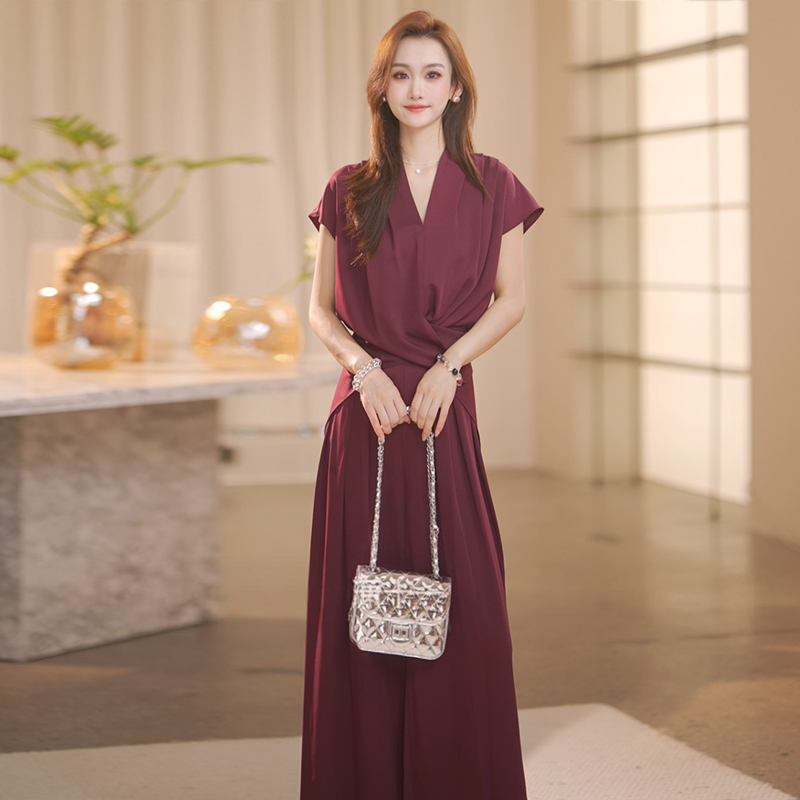 경관 그림 프랑스식 빛 요리 한 우아함 착용 가져 가라. 민소매 베스트 여름 새로운 고급 절묘한 와이드 레그 팬츠 투피스 슈트