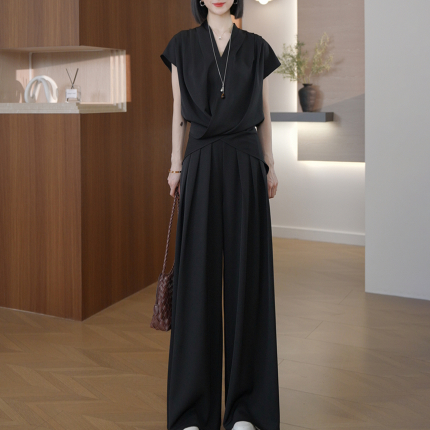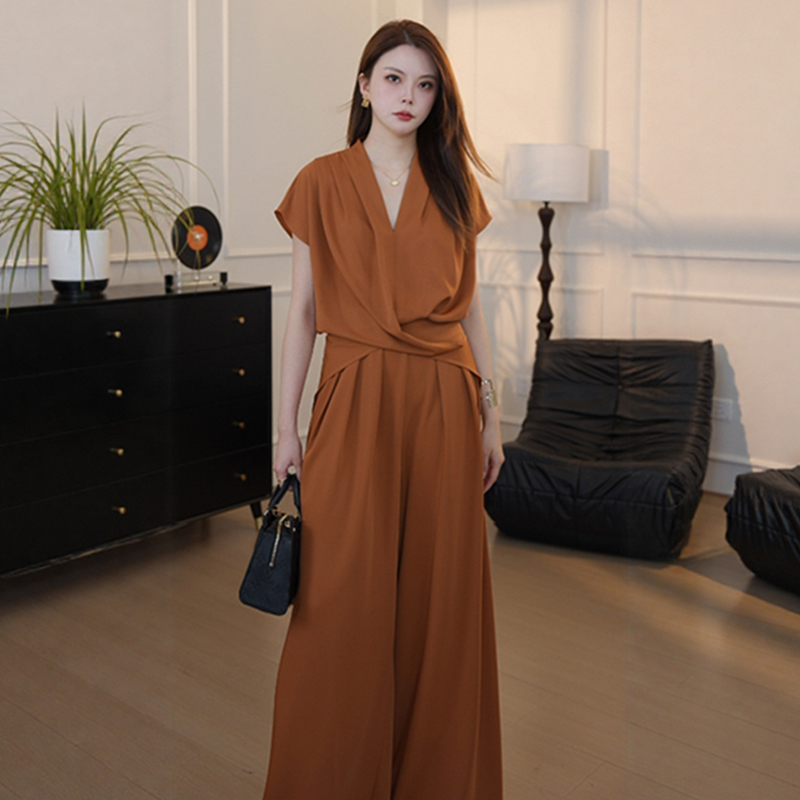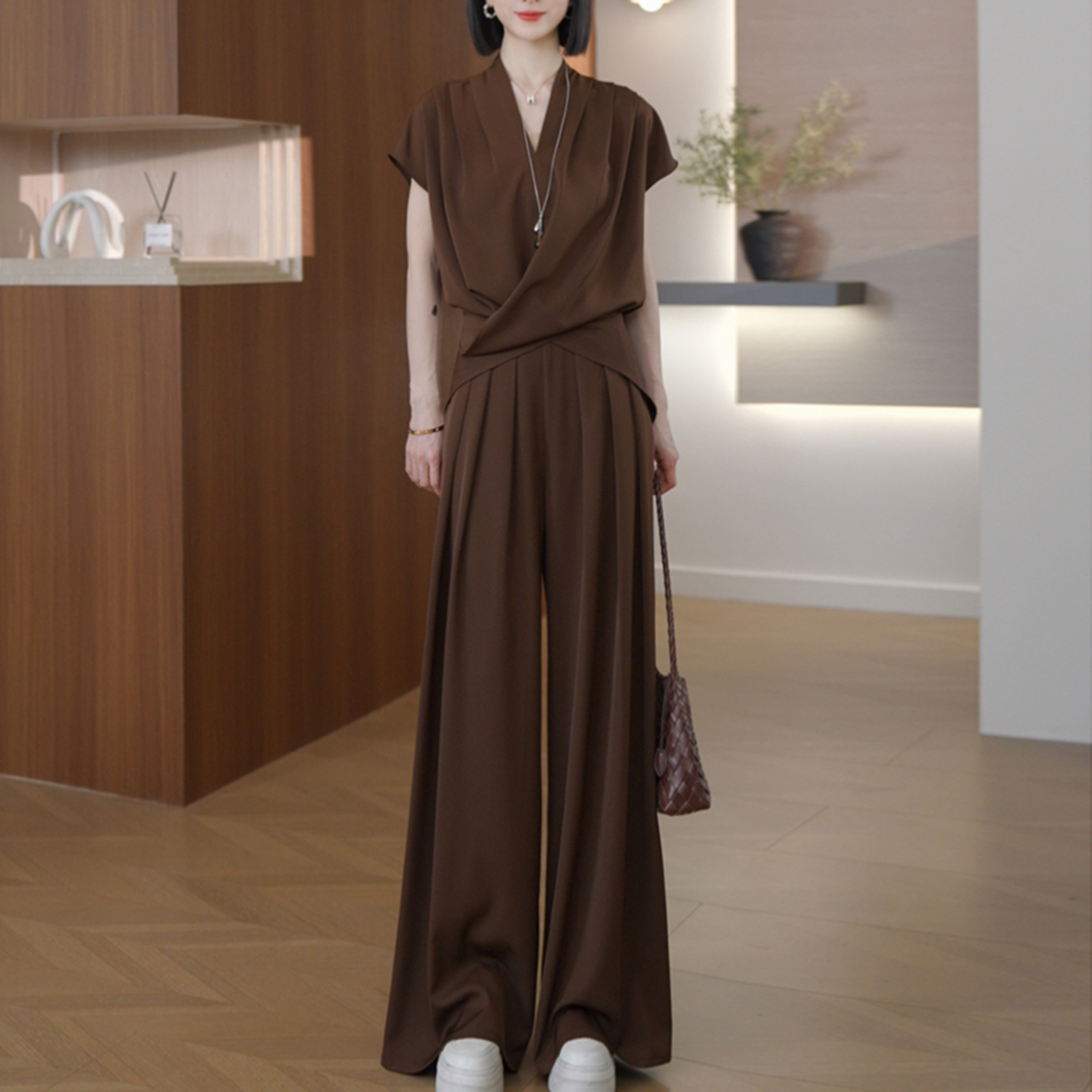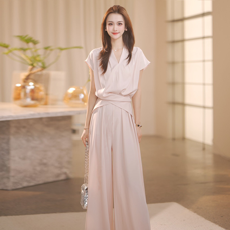 경관 그림 한국 스타일 느긋한 디자인 세트 연령 감소 디스플레이 화이트 2026 여름 새로운 V넥 리프트 새틴 맨위 와이드 레그 팬츠