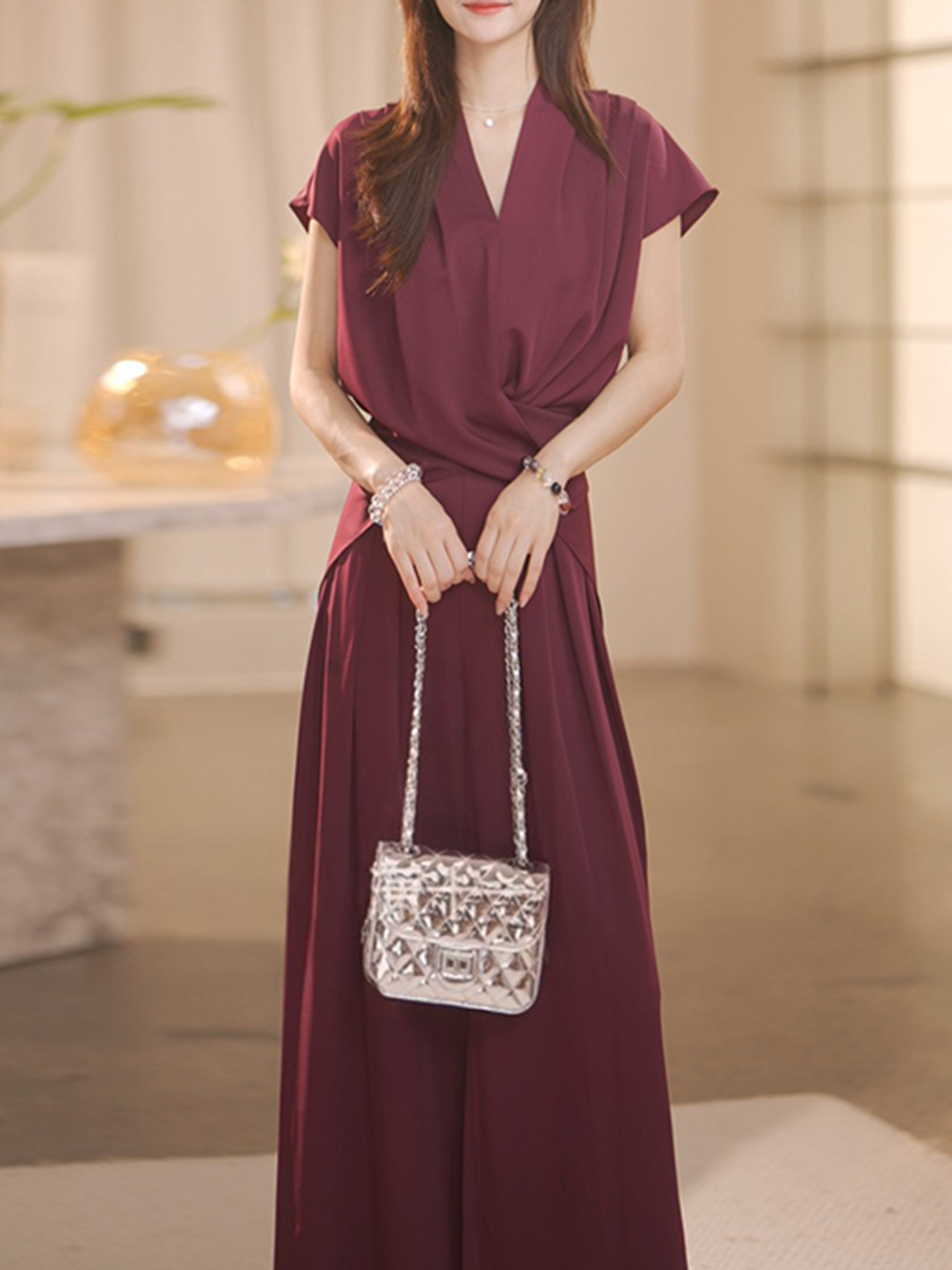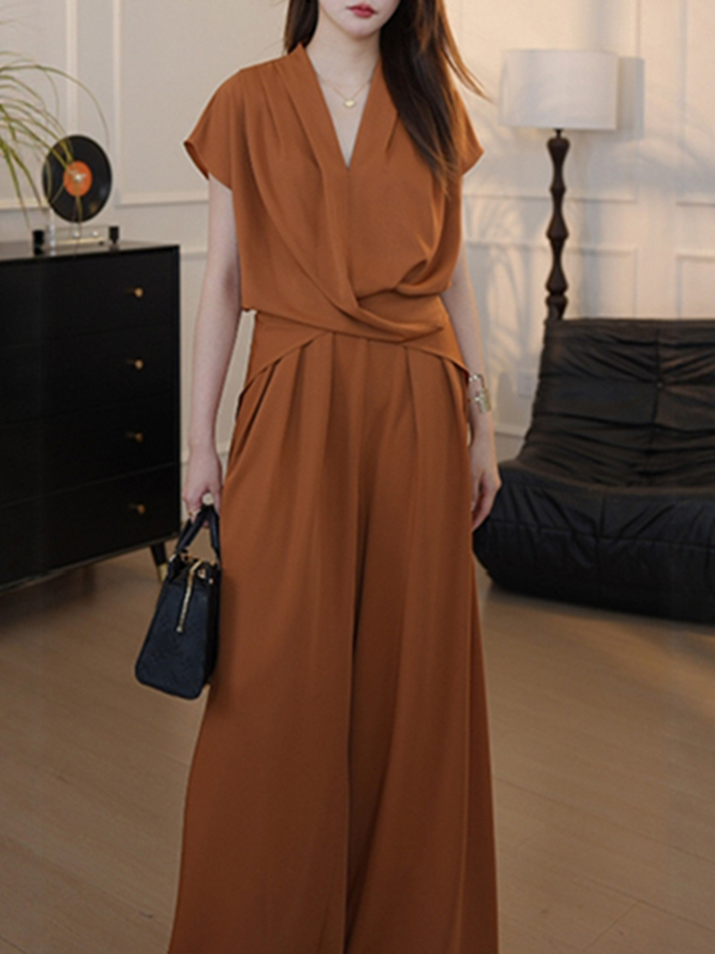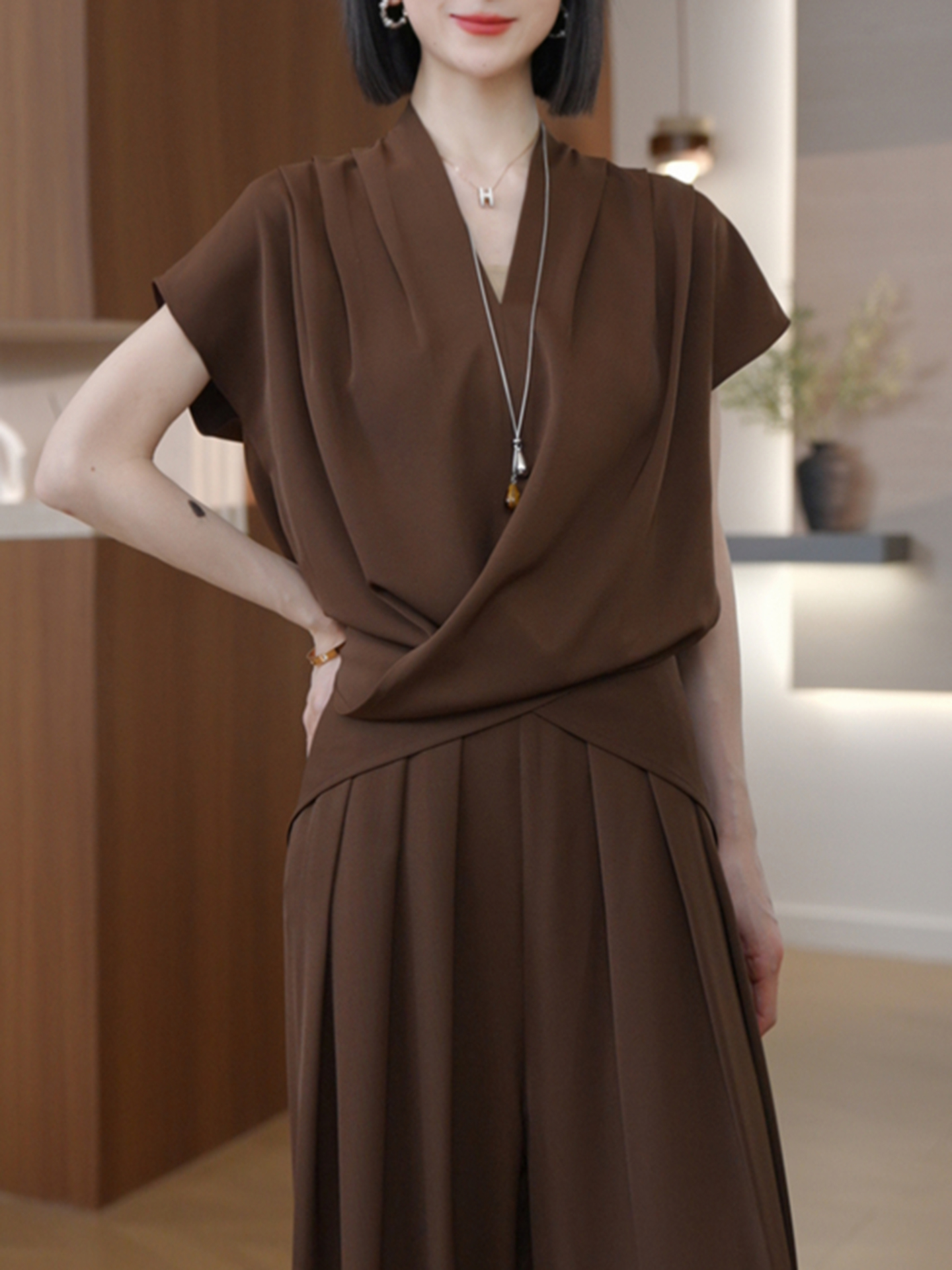 경관 그림 한국 스타일 느긋한 디자인 세트 연령 감소 디스플레이 화이트 2026 여름 새로운 V넥 리프트 새틴 맨위 와이드 레그 팬츠