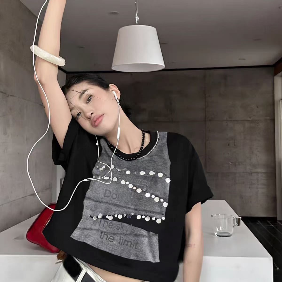 한 부서 무거운 작업 스팽글 알파벳 프린트 반팔 티셔츠 여성 2026 여름 슬림해 보이는 다용도 맨위
