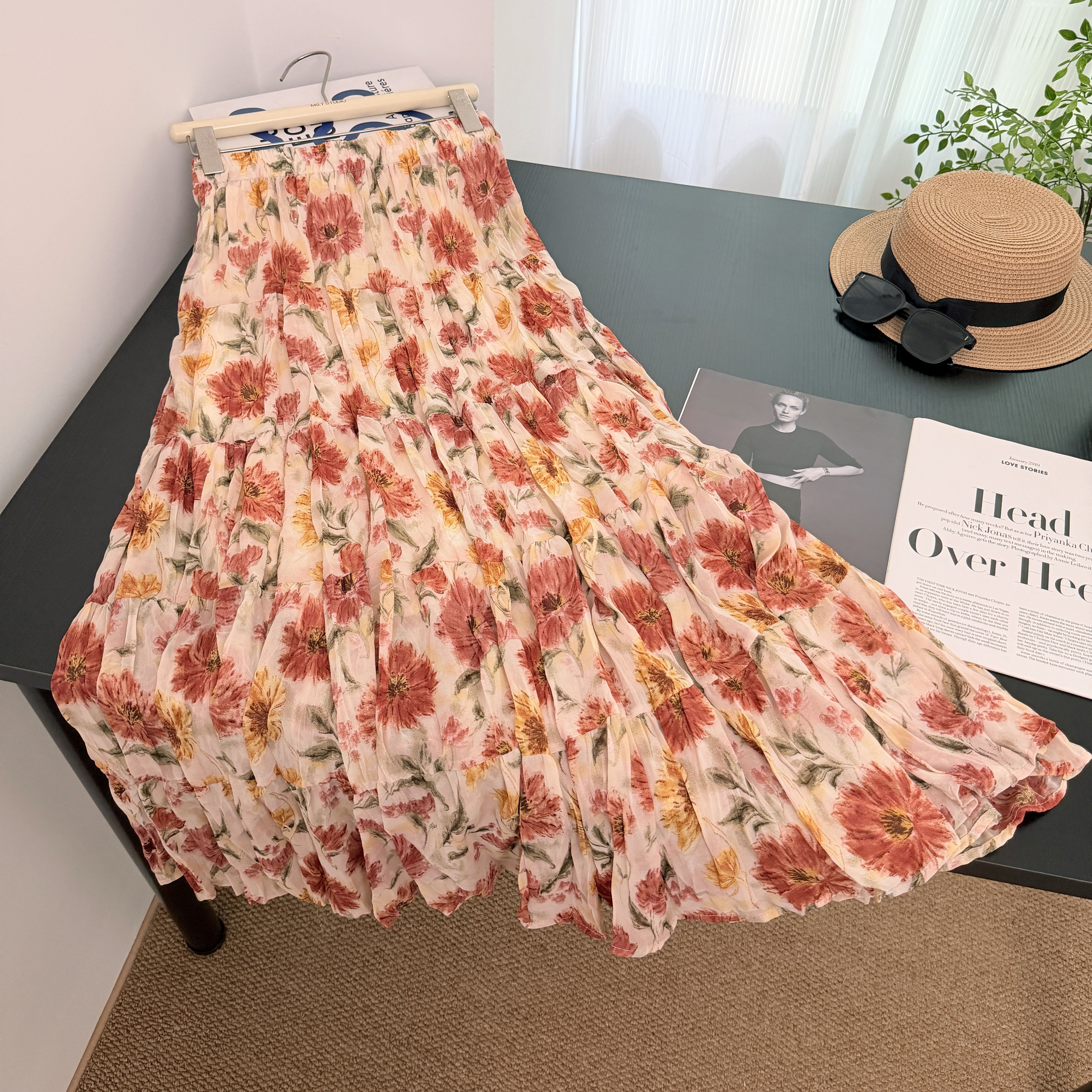 실사 쉬폰 꽃무늬 반신 스커트 여성 2026 새로운 봄 여름 하이웨이스트 우아한 큰 진자 한 마디 케이크 드레스 꽃무늬 치마