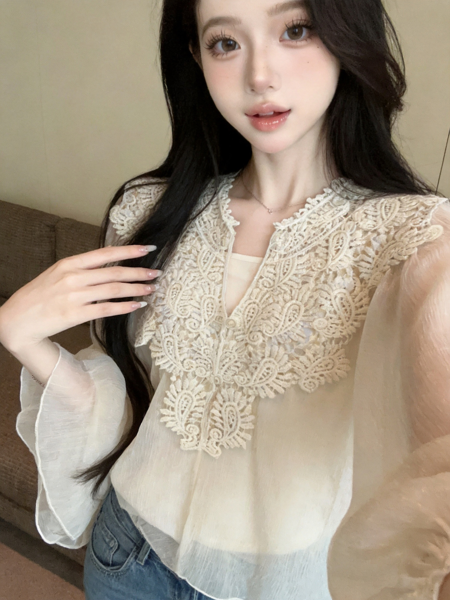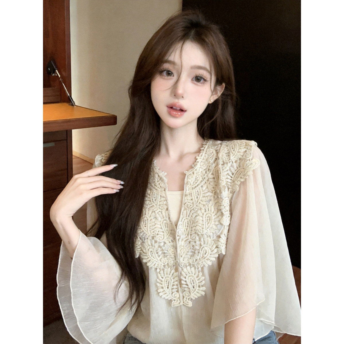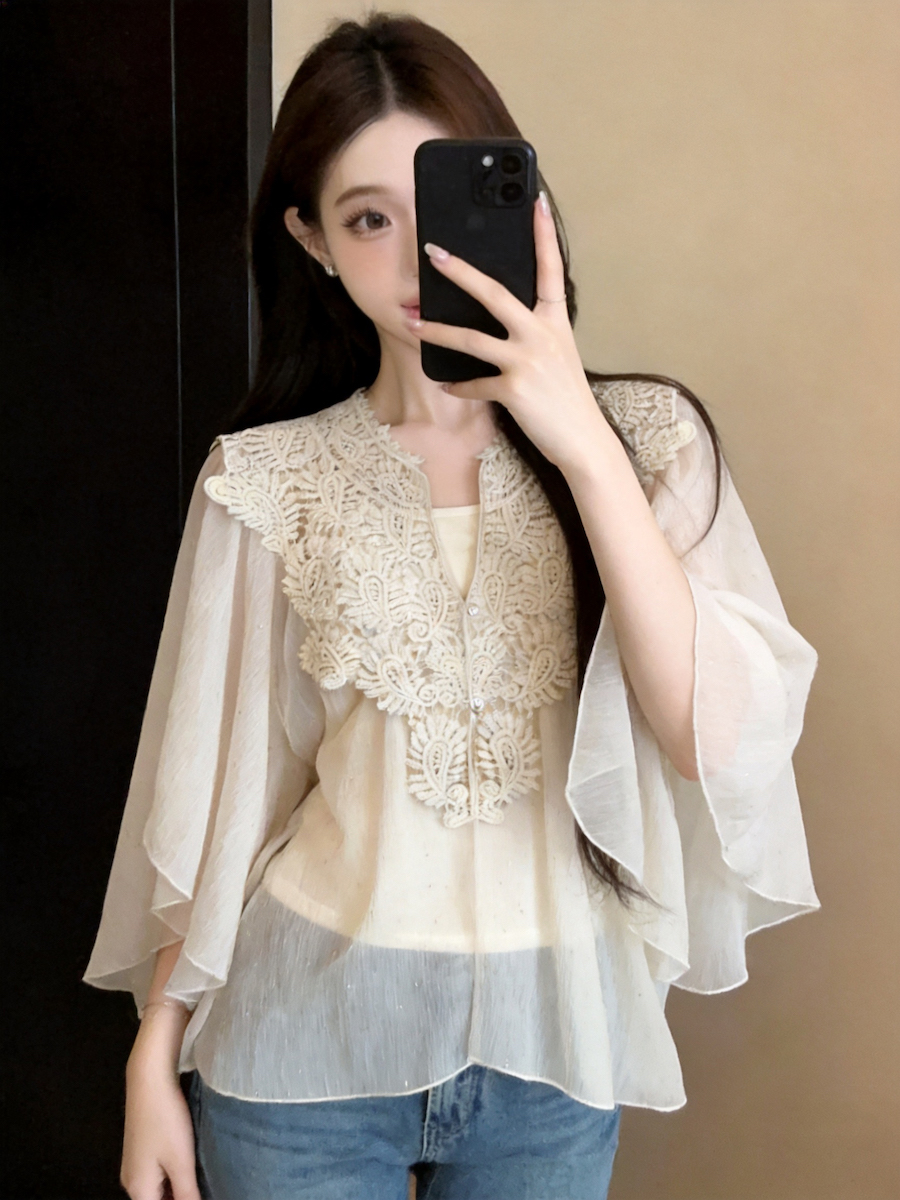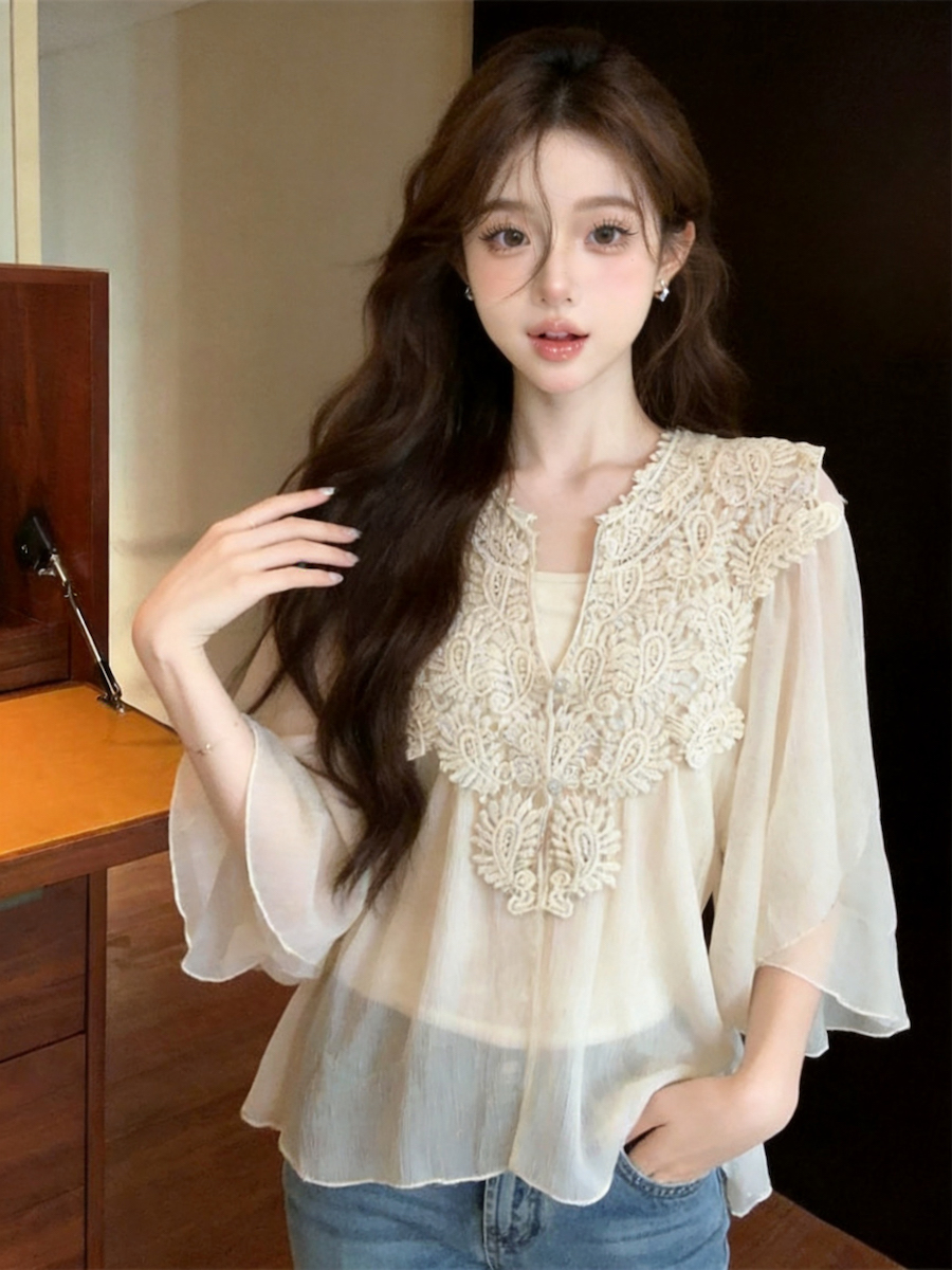 정가 있음 보호 한 부서 레이스 조각 레이스 V넥 시폰 셔츠 여성 루즈핏 반팔 작은 셔츠 슬립 맨위