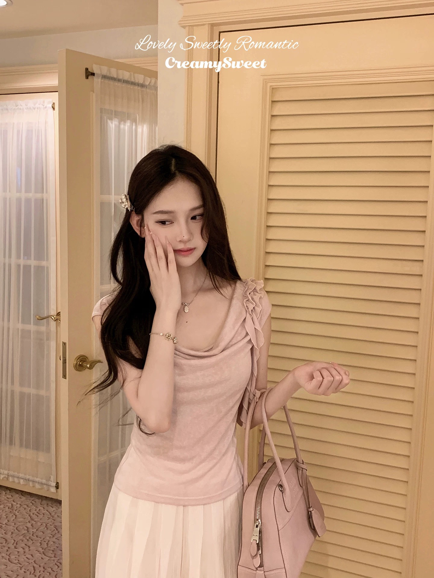 morning bloom 프랑스식 V넥 꽃무늬 반팔 티셔츠 여성 여름 한 부서 보트넥 프릴 쇼트 스타일 맨위