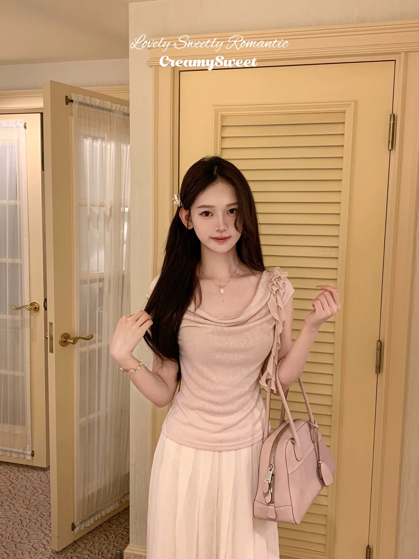 xzichic 중간 소매 t lady 센스 우아함 비스듬한 어깨 오프숄더 둘 착용 티셔츠 여성 여름 우아함 품격 맨위