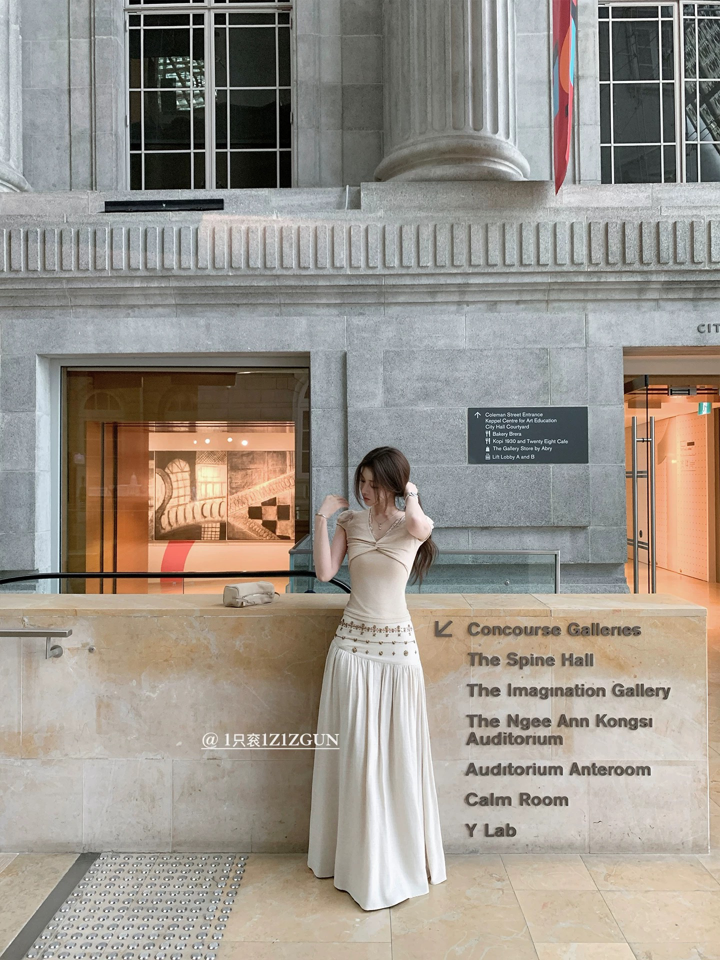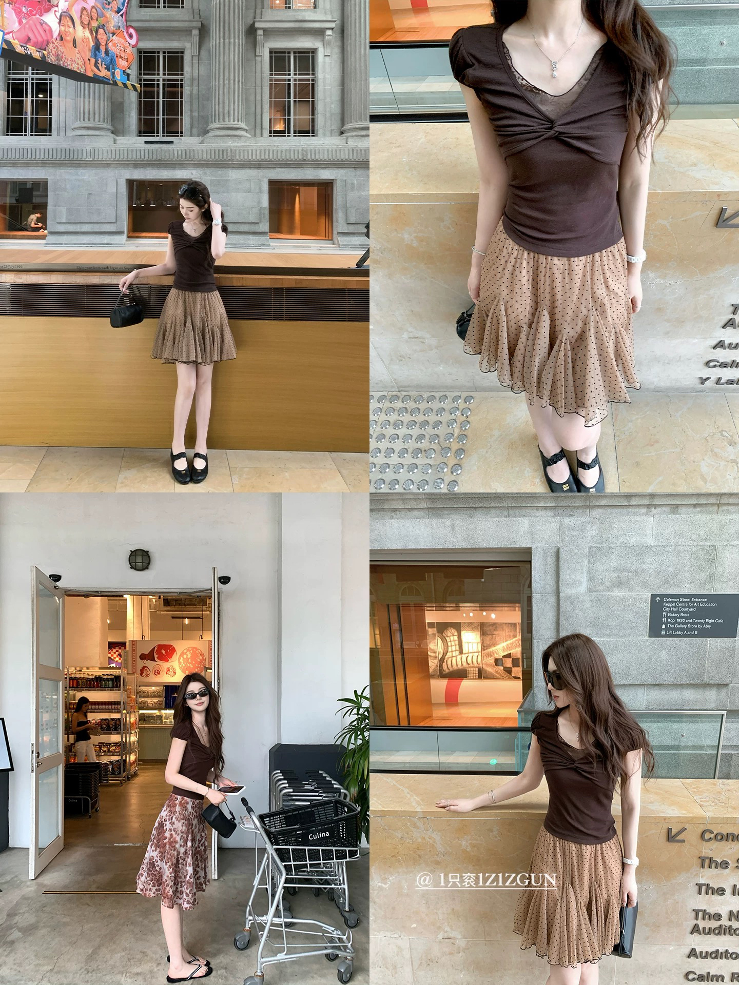 cookadaily 인어 레이스 자카드 대 라운드 넥 반팔 스트레이트 소녀 바람 미니멀리즘 다용도 중간 길이 스커트 그룹
