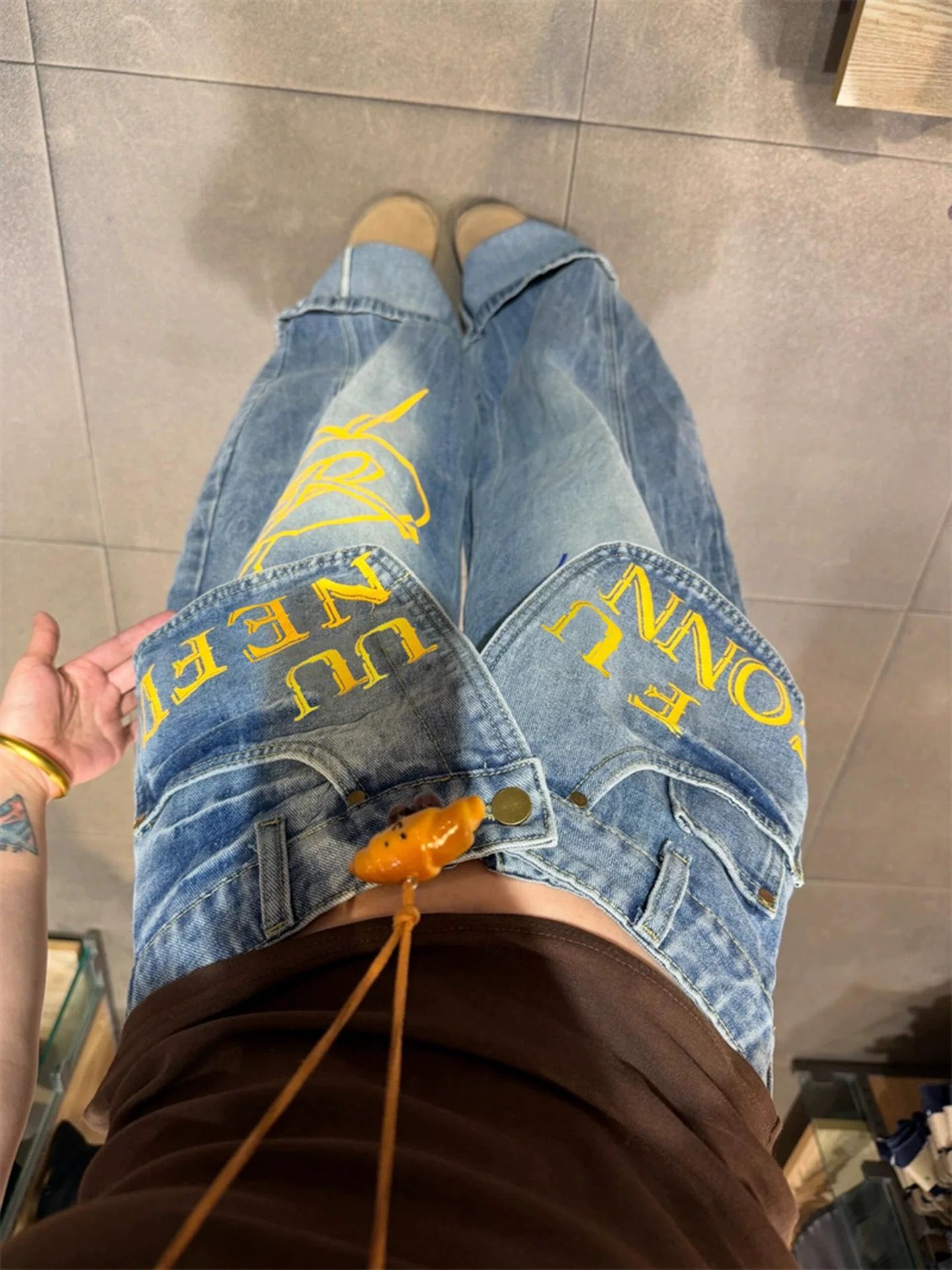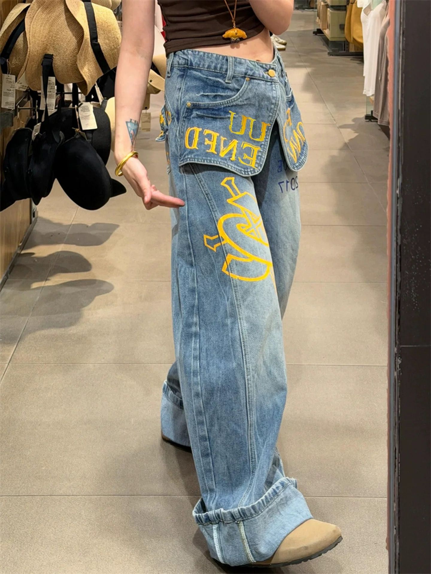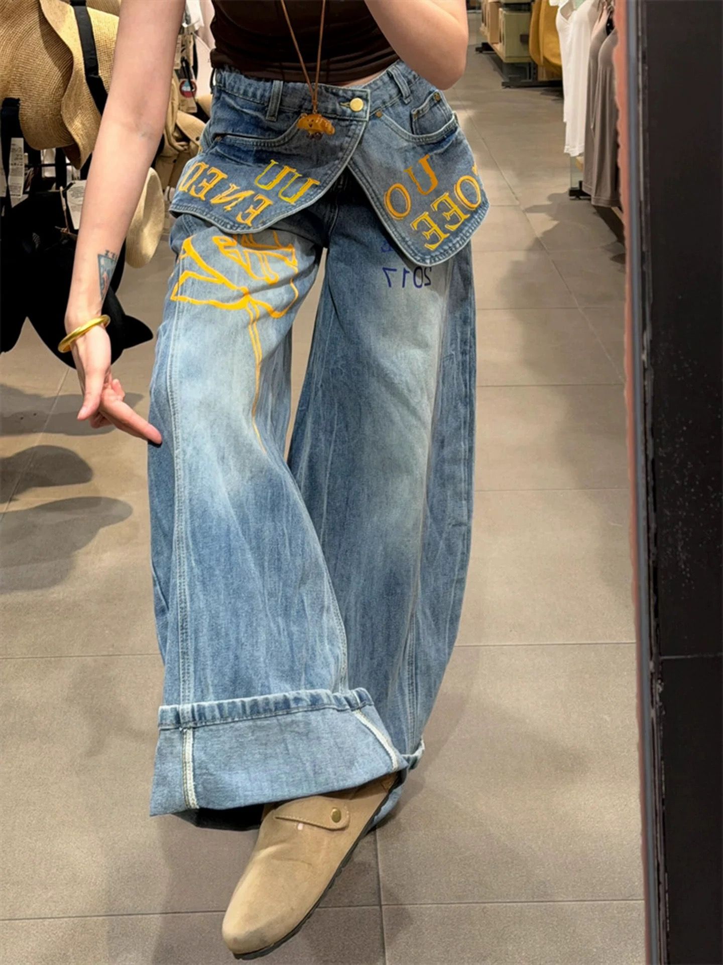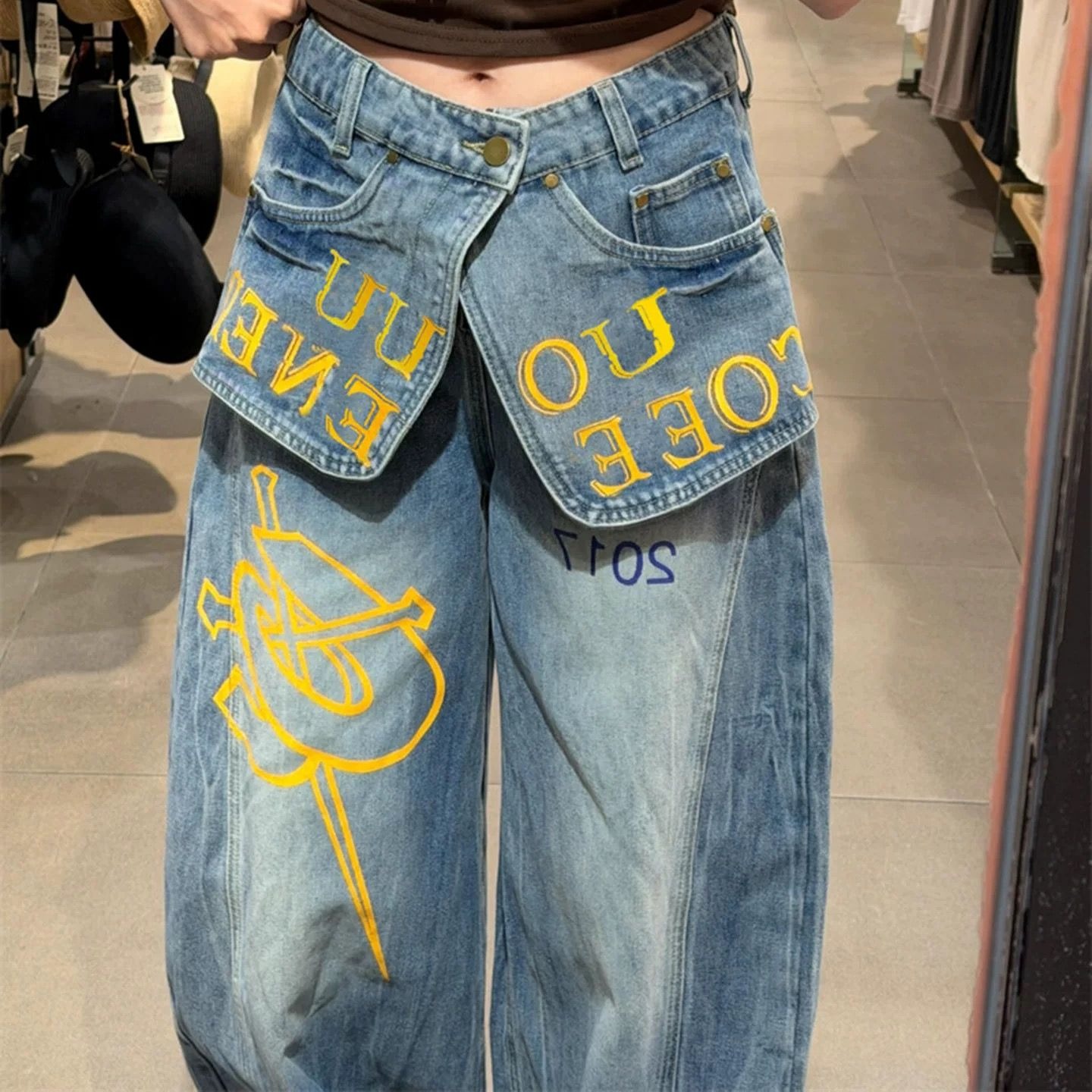 아메리칸 핫걸 낙서 알파벳 프린트 더블 허리 가져 가라. 조각 페이크 레이어드 청바지 여성 봄 가을 디자인 센스 와이드 레그 팬츠 트렌디