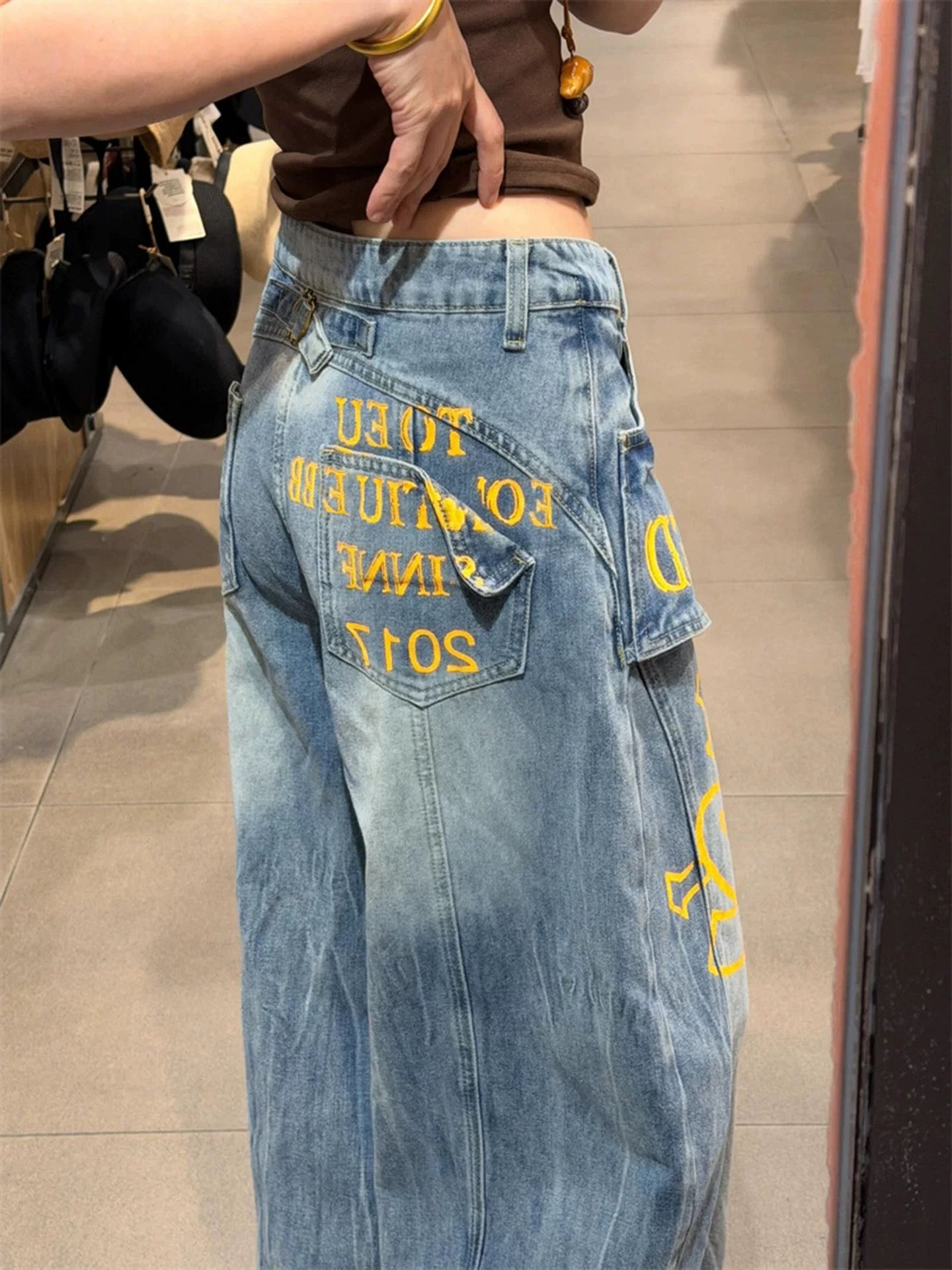아메리칸 레트로 지퍼 패치워크 청바지 여성 봄 여름 디자인 센스 하이웨이스트 루즈핏 스트레이트 와이드 레그 팬츠 바닥 청소 긴 바지