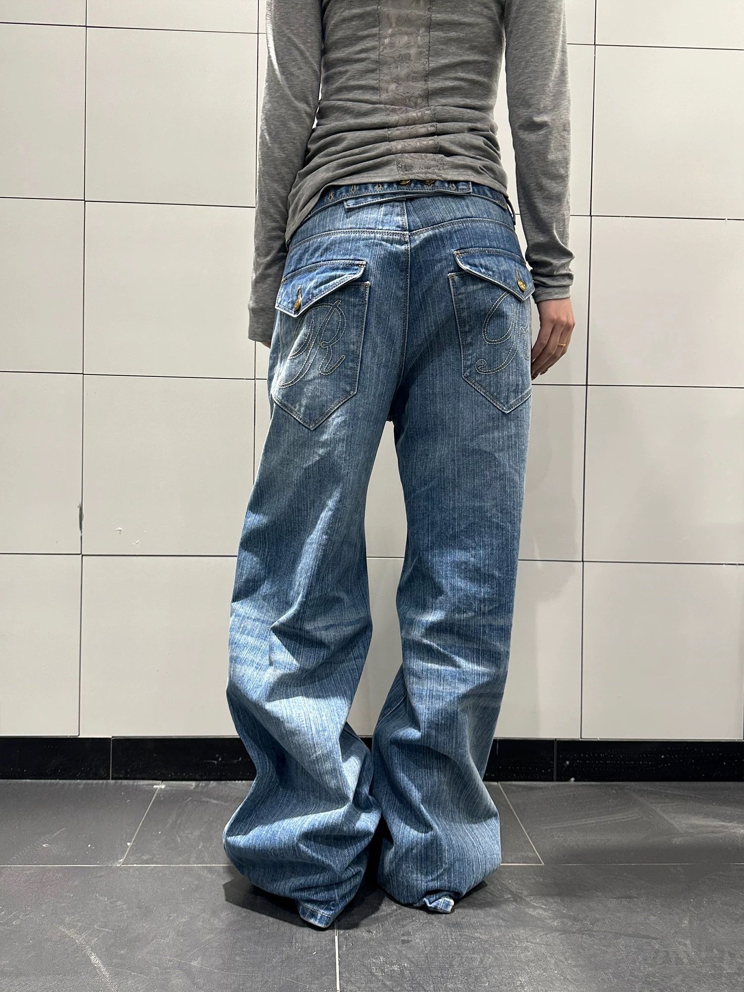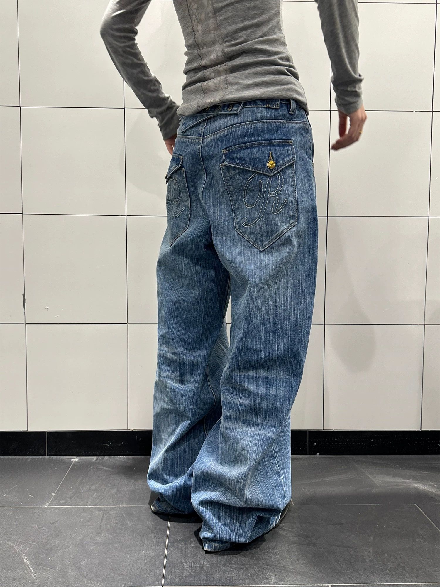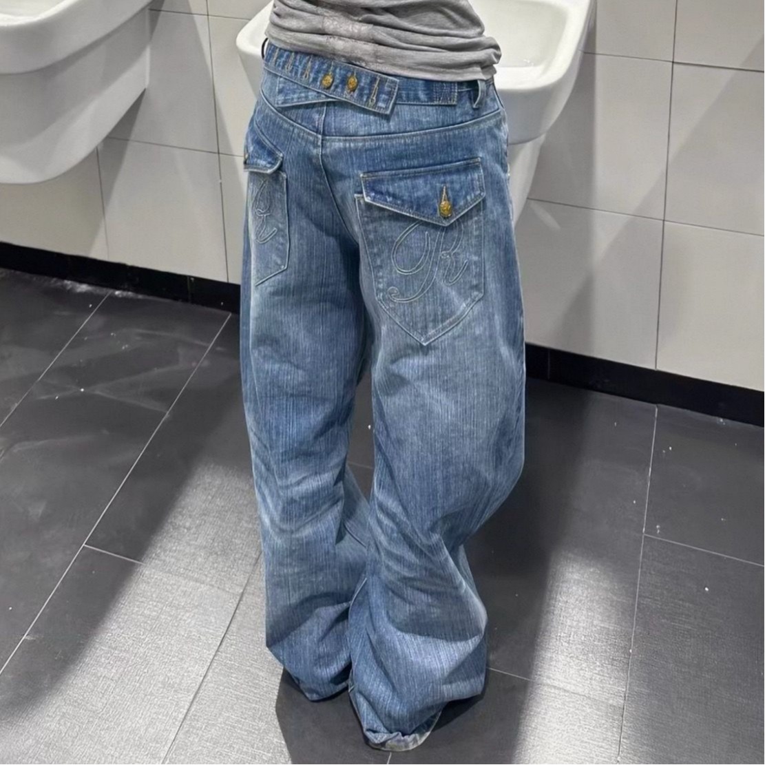 아메리칸 레트로 파리 버클 대나무 마디 청바지 남녀 루즈핏 캐주얼 워싱 디자인 센스 모통이 칼 다용도 긴 바지 트렌디