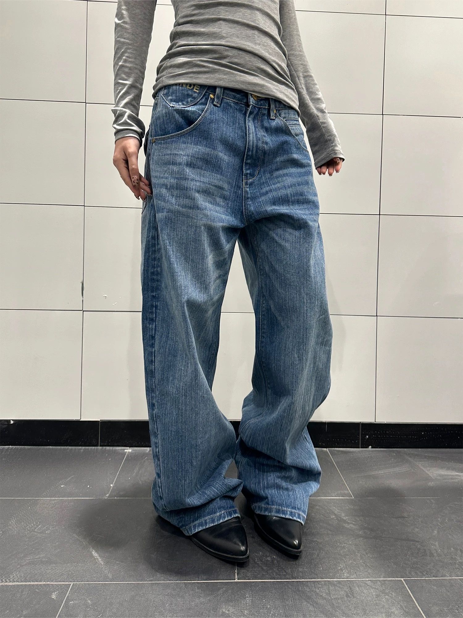 아메리칸 레트로 지퍼 패치워크 청바지 남녀 디자인 센스 하이웨이스트 루즈핏 스트레이트 와이드 레그 팬츠 바닥 청소 롱 바지
