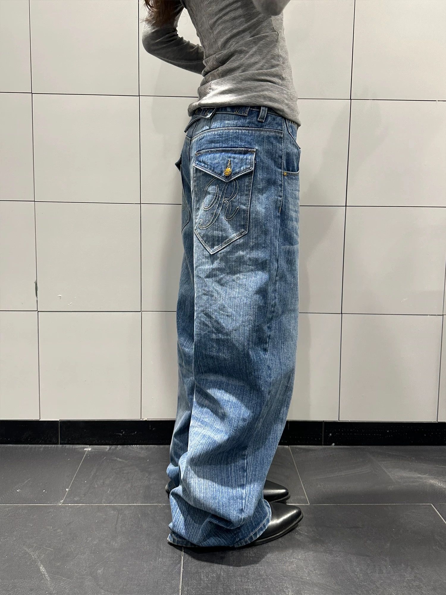 아메리칸 레트로 워싱 캐주얼 워크웨어 팬츠 여성 핫걸 거리 루즈핏 스트레이트 벌채 반출 바지 트렌디