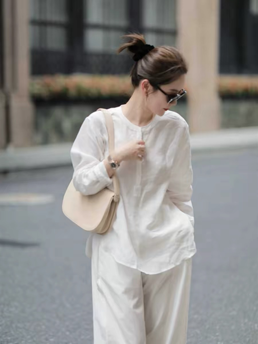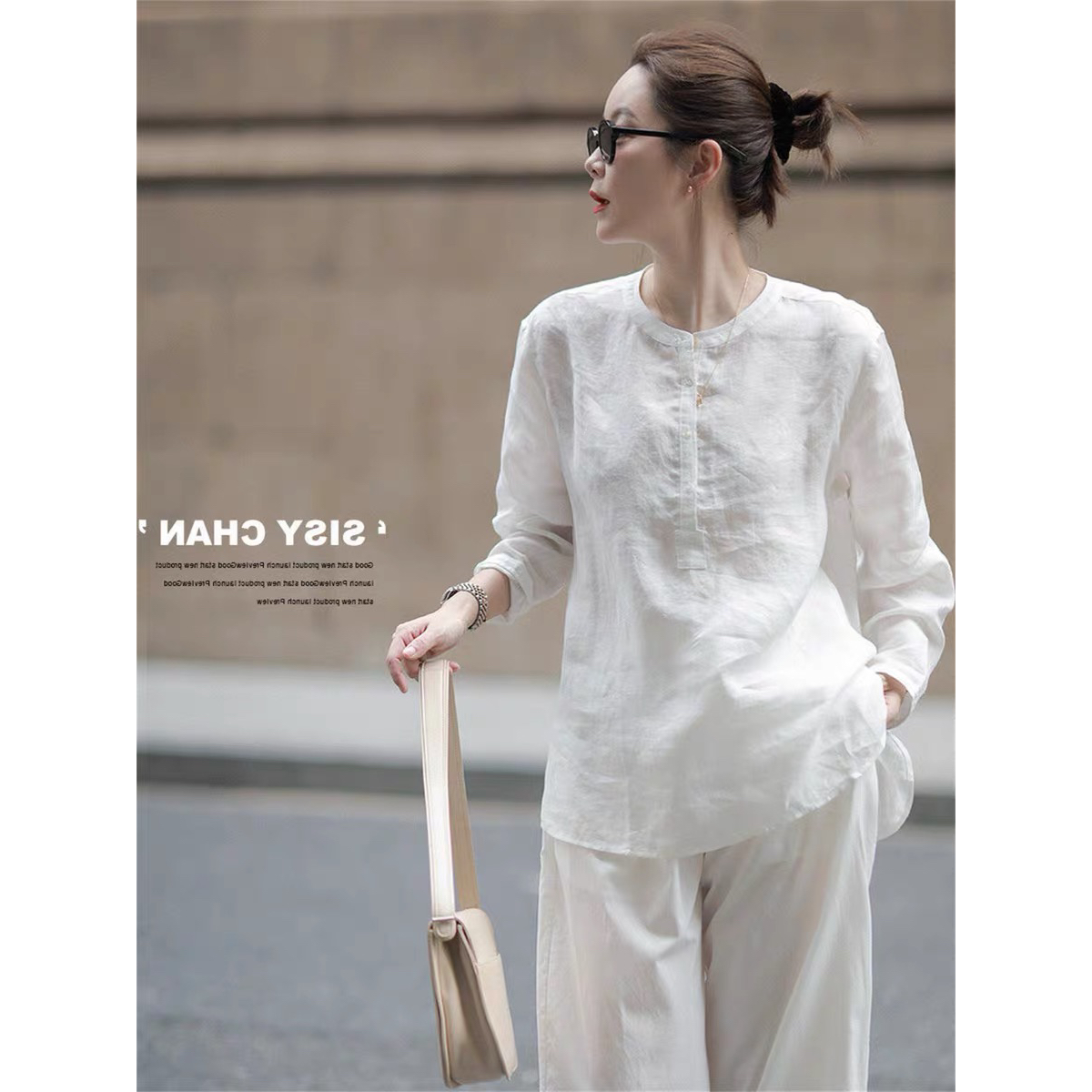 lur 스탠드 칼라 아마 파란색 여성 셔츠 여름 루즈핏 슬림해 보이는 자외선 차단 외출용 캐주얼 긴팔 셔츠