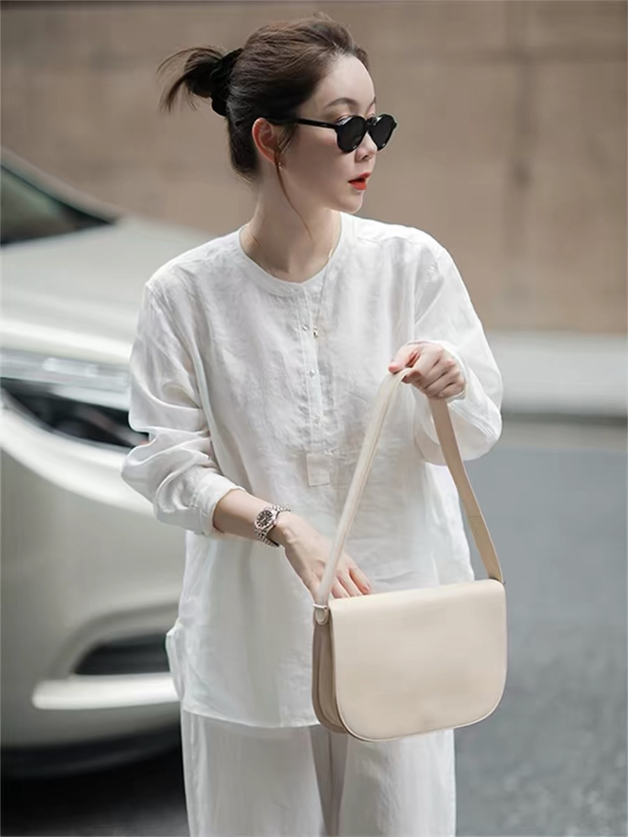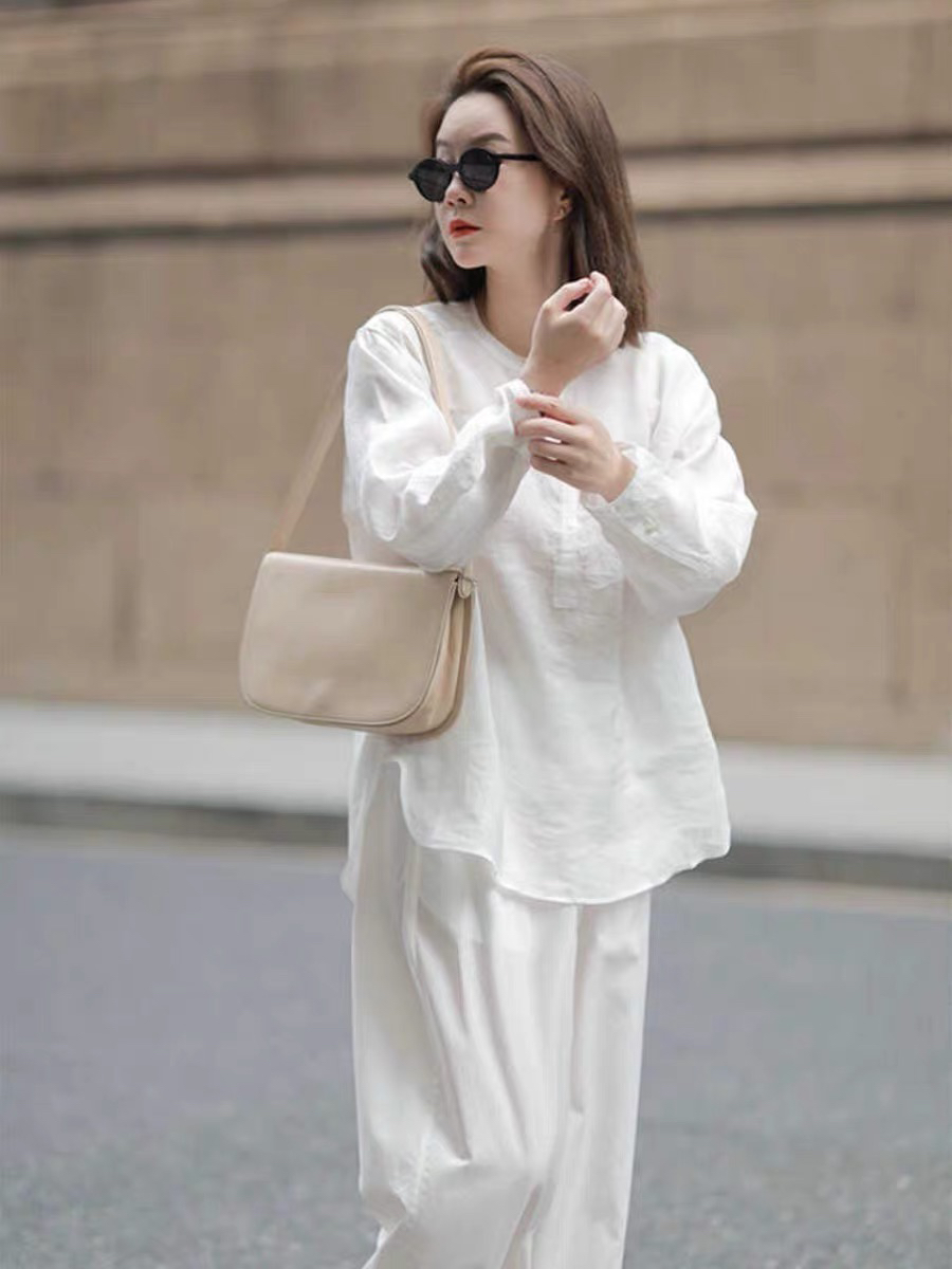 프랑스식 화이트 면 린넨 여성 셔츠 여름 얇은 스타일 아마 거품 소매 셔츠 품격 중간 소매 5 점 소매 맨위