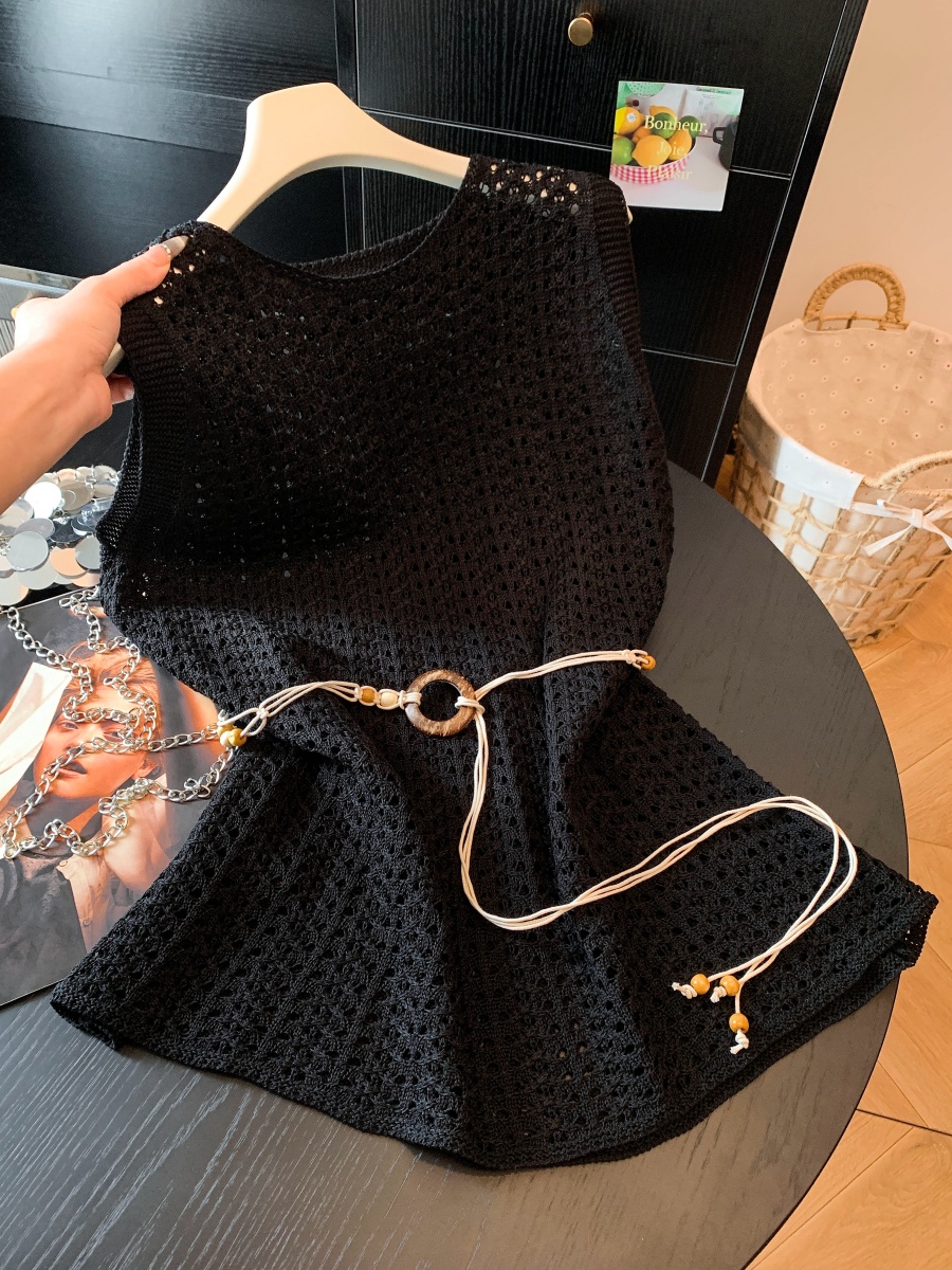 오래된 돈 바람 고급 센스 아마 홀로우 아웃 니트 조끼 외출용 여성 여름 얼음 실크 어깨 핫걸 쇼트 스타일 민소매 맨위
