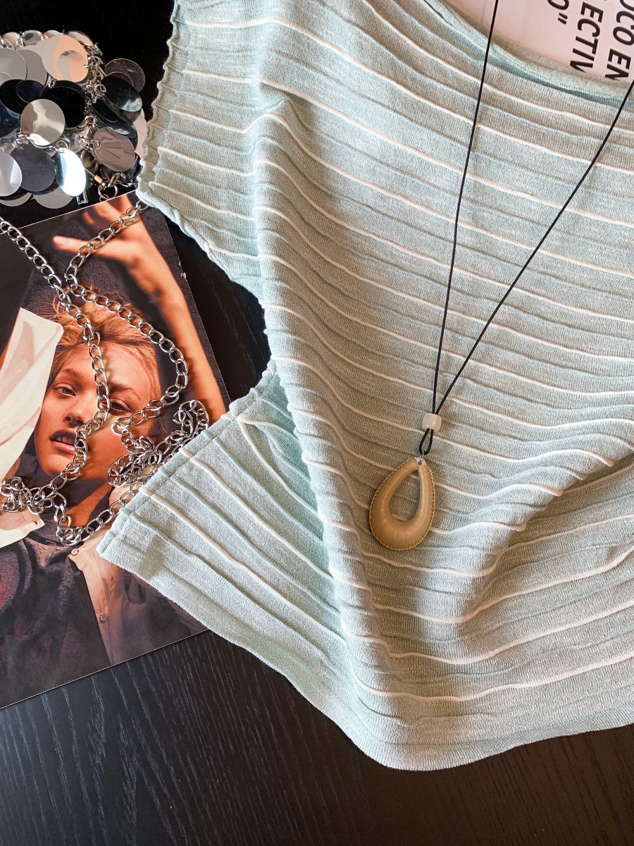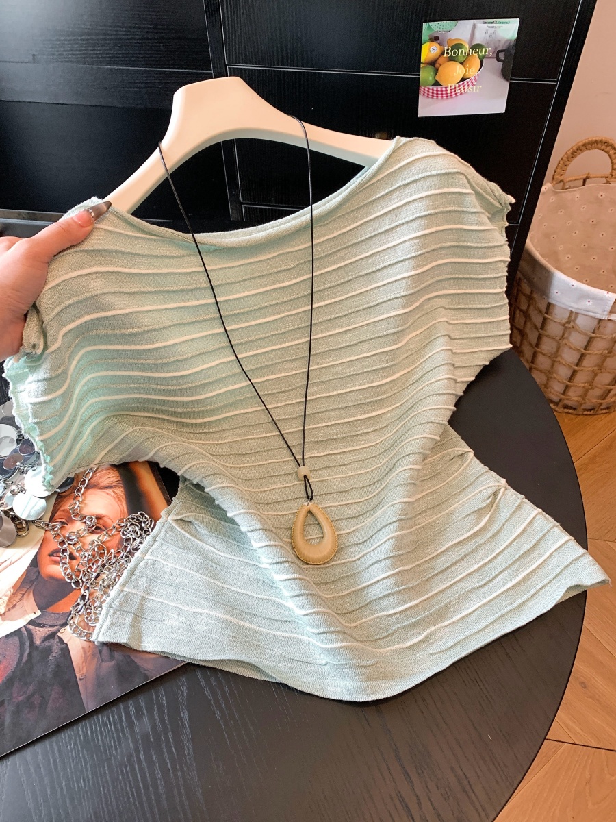 패션 외국 가스 연령 감소 오프숄더 반팔 니트 스웨터 여성 여름 루즈핏 슬림해 보이는 디자인 센스 작은 대중 스트라이프 맨위