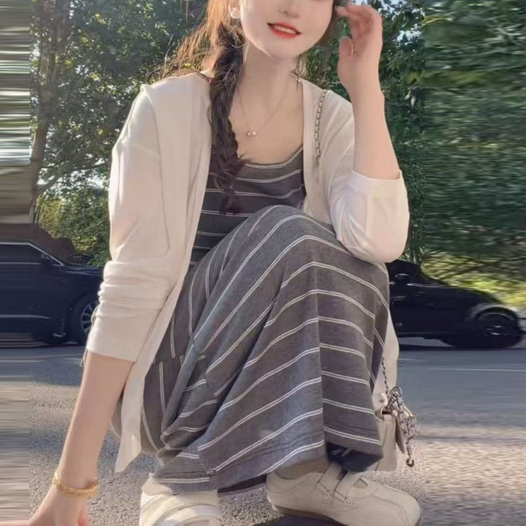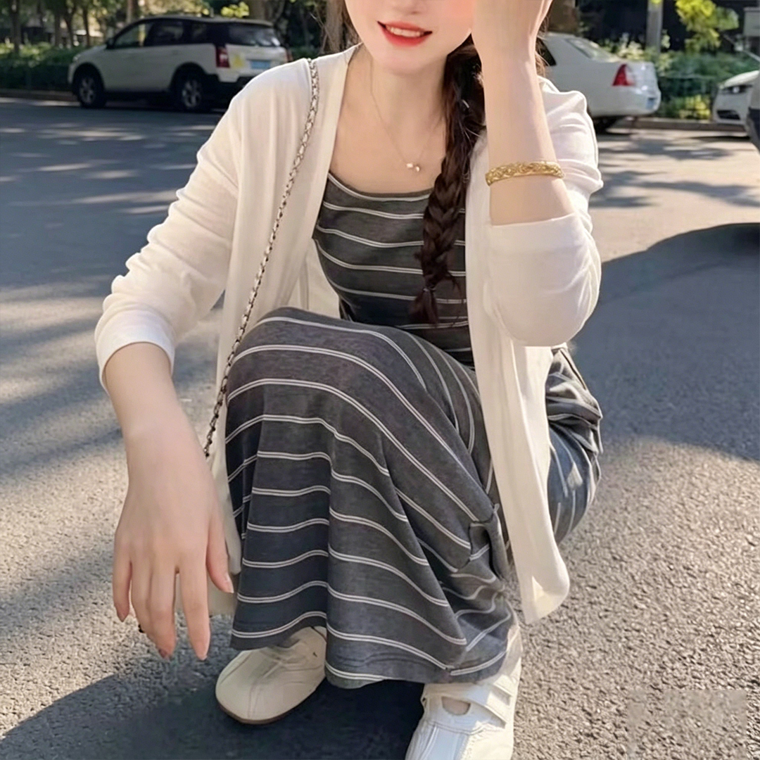 경관 그림 2026 여름 새로운 디자인 슬림해 보이는 다용도 니트 오픈 가디건 스트라이프 슬립 반신 스커트 3종 세트