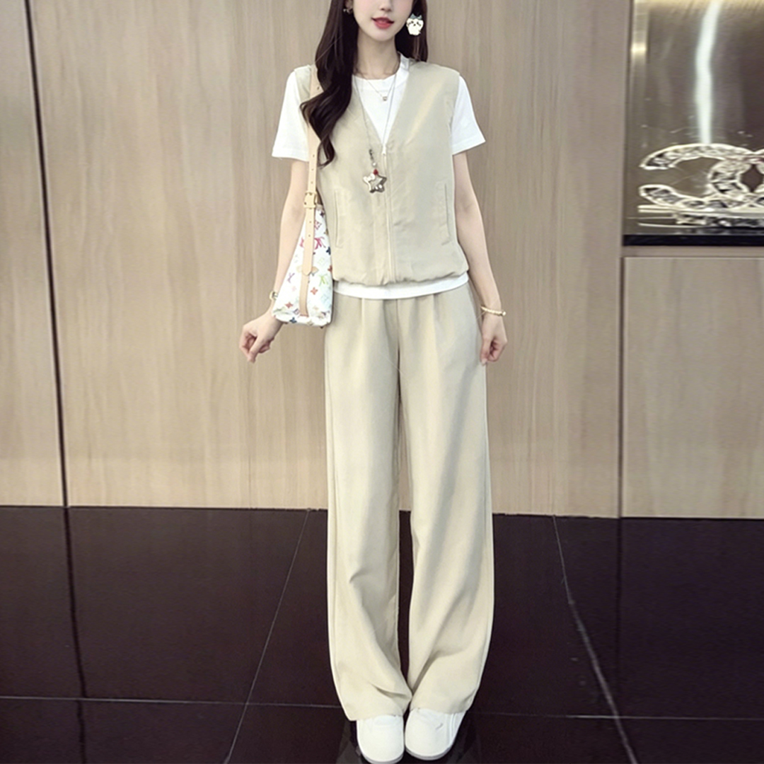 경관 그림 2026 여름 새로운 품격 세트 여성 슬림해 보이는 패션 연령 감소 페이크 레이어드 맨위 와이드 레그 팬츠 투피스 세트