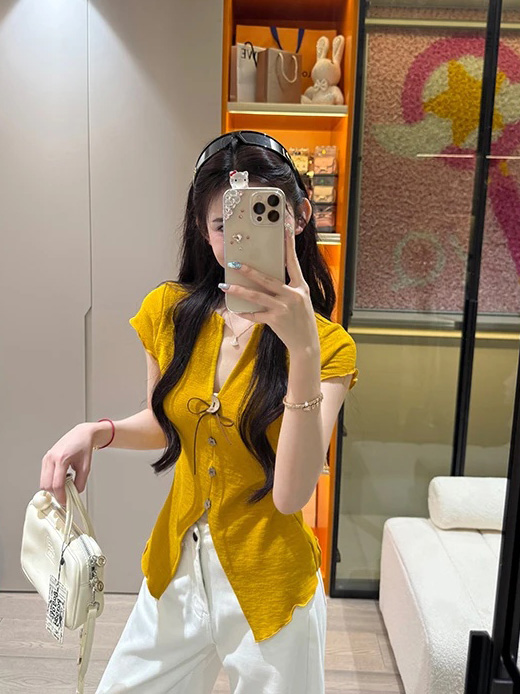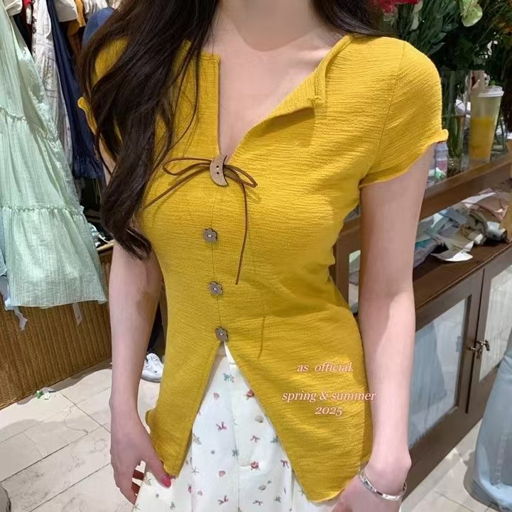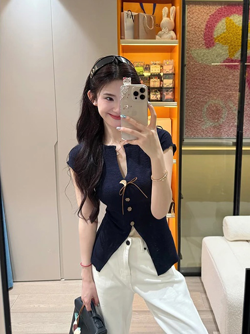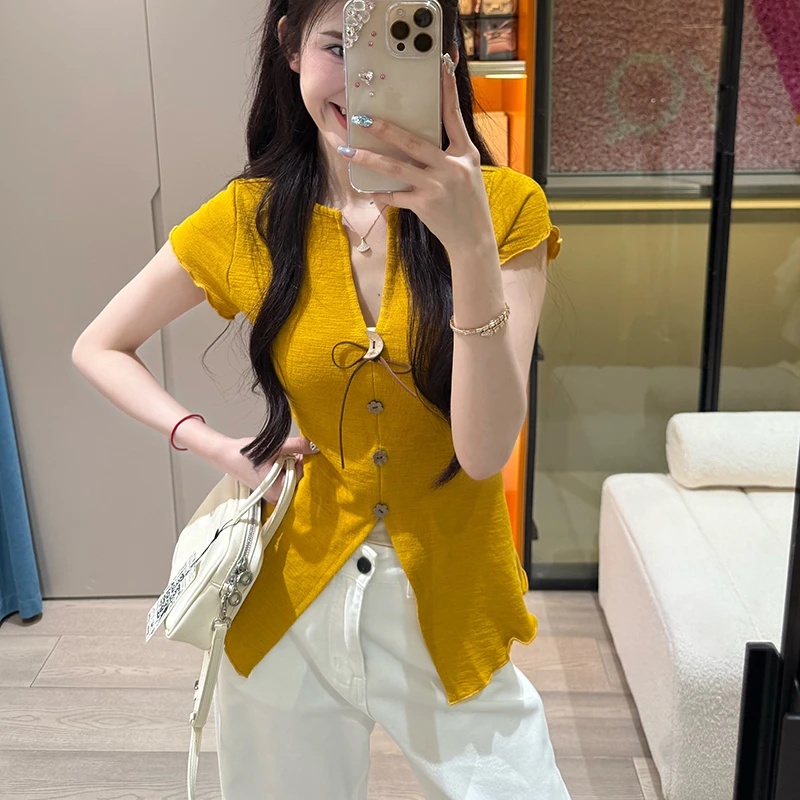 프랑스식 품격 V넥 화이트 반팔 여성 티셔츠 2026 새로운 여름 작은 대중 몸매 가꾸기 슬림해 보이는 트임 니트 맨위