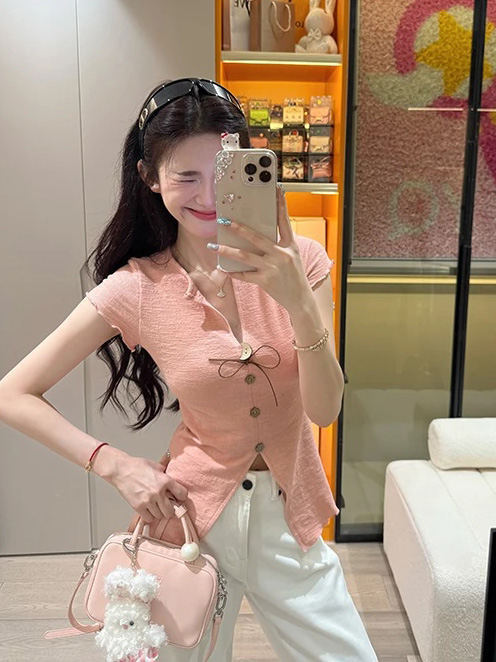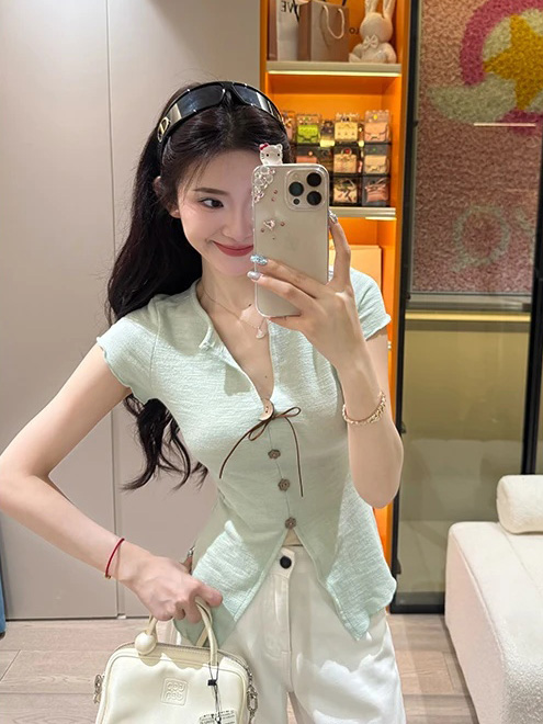 한 부서 레이스업 나비 매듭 폴로 칼라 반팔 티셔츠 여성 여름 새로운 몸매 가꾸기 쇼트 스타일 맨위 chic