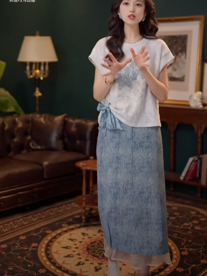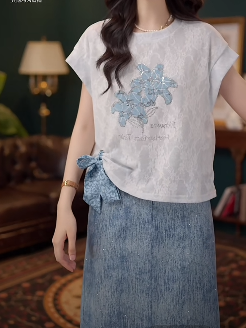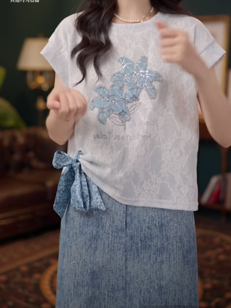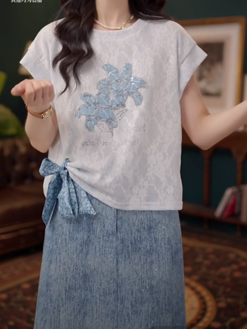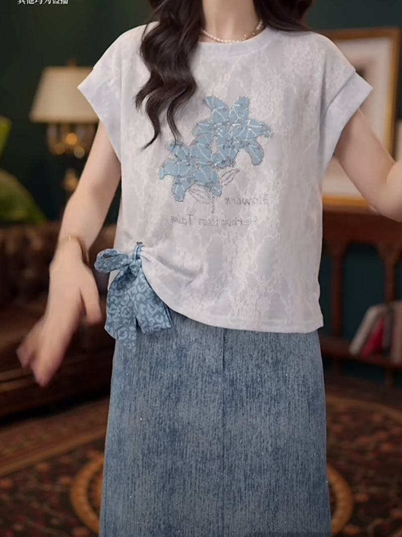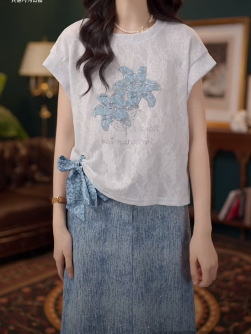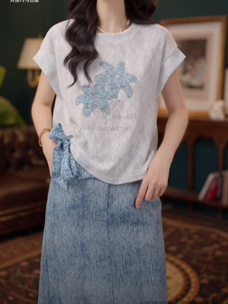 레트로 항구 바람 연령 감소 티셔츠 외국 가스 다용도 꽃 라운드 넥 반팔 10 반 스커트