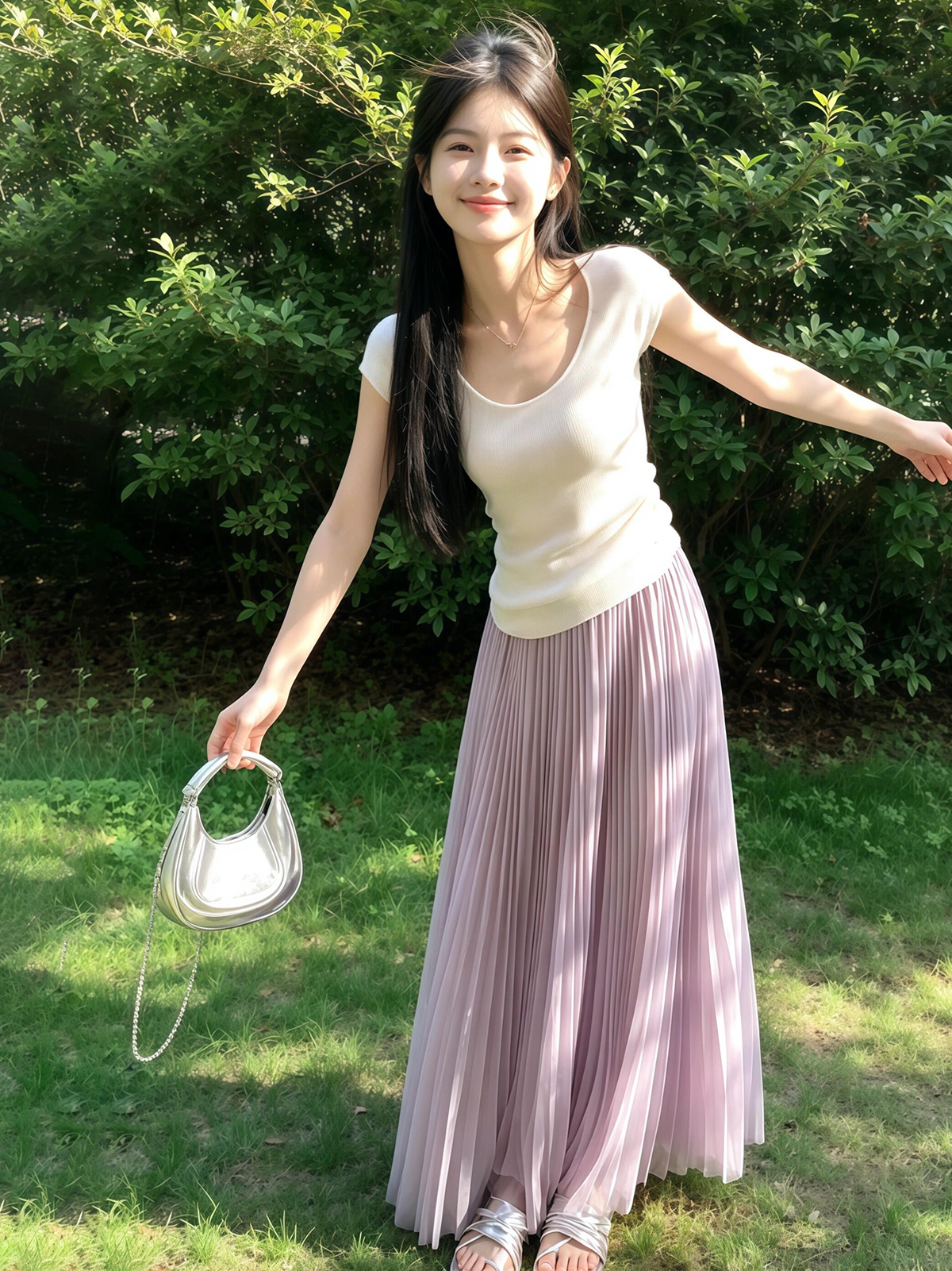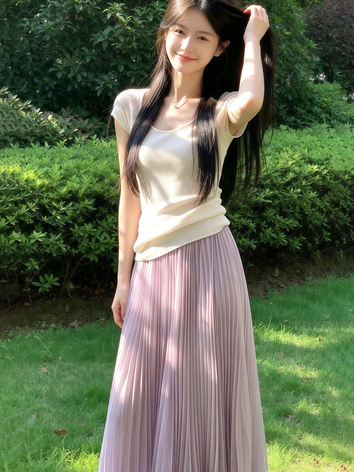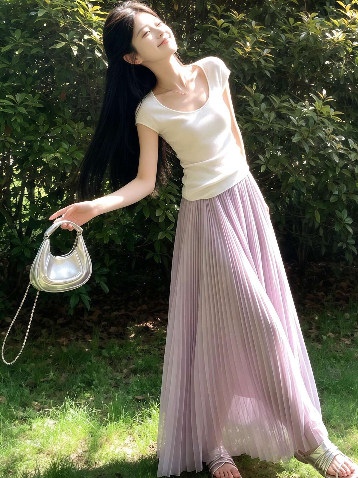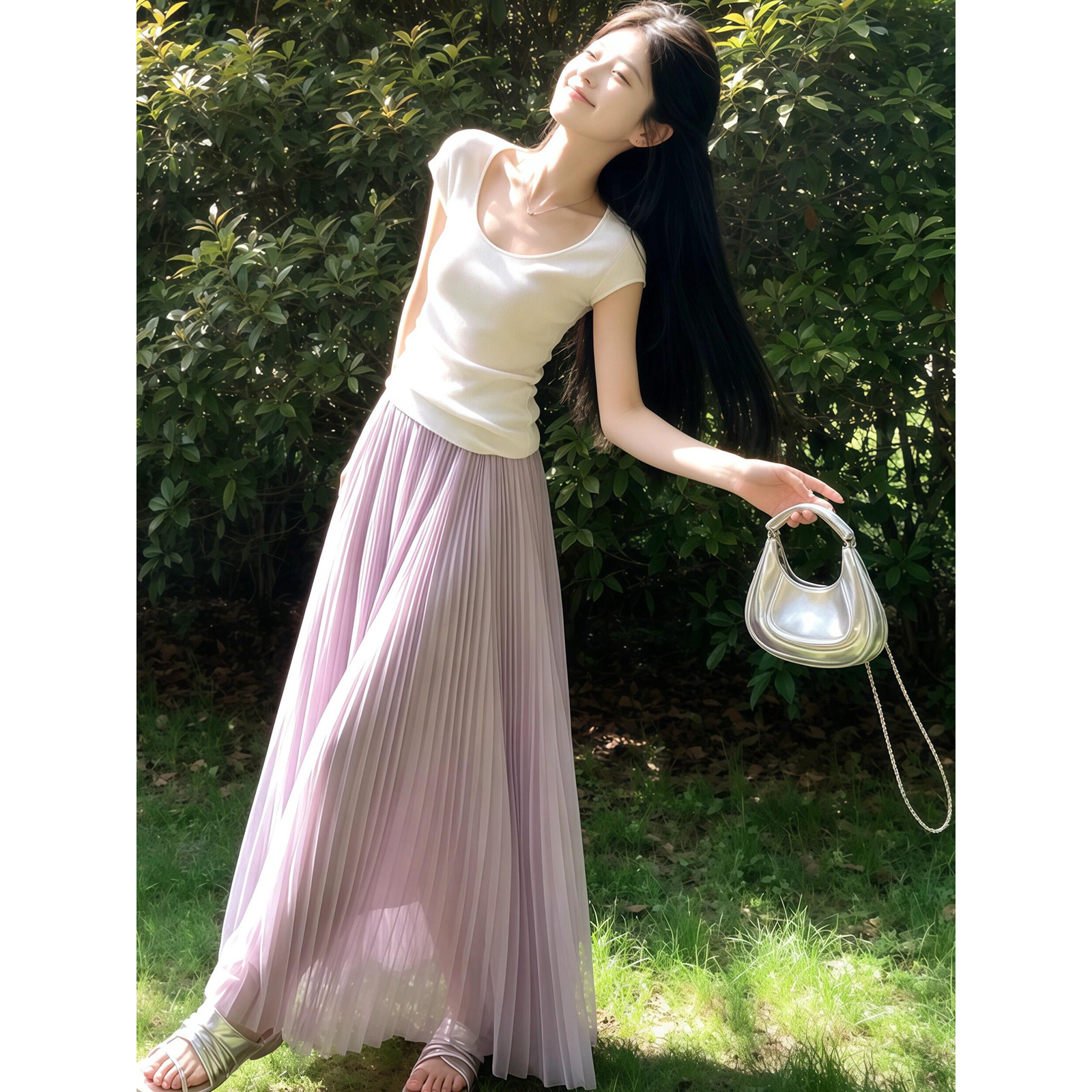 있음 도착 부드러운 바람 광장 칼라 니트 티셔츠 맨위 하이웨이스트 플리츠 반신 스커트 두 조각 여성 세트 여름